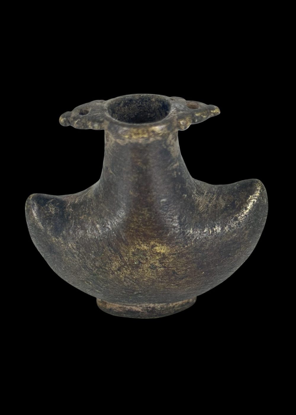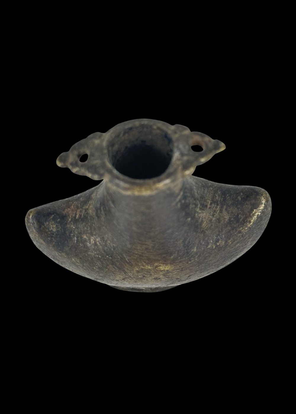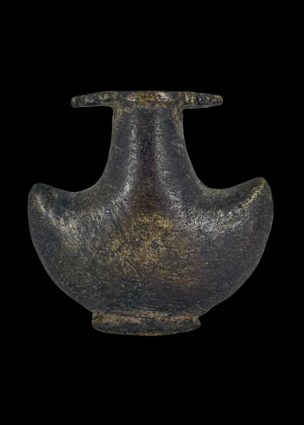 This solid bronze container, shaped with broad shoulders and a narrow neck, is a traditional gunpowder box likely used during the early modern period for storing and dispensing black powder. Its sturdy construction and compact form ensured durability and safety during transport. The wide, flared mouth allowed for easy access, while the winged sides offered a firm grip. A fine example of historical military equipment, this piece reflects the utilitarian craftsmanship of its time, combining practicality with enduring design.