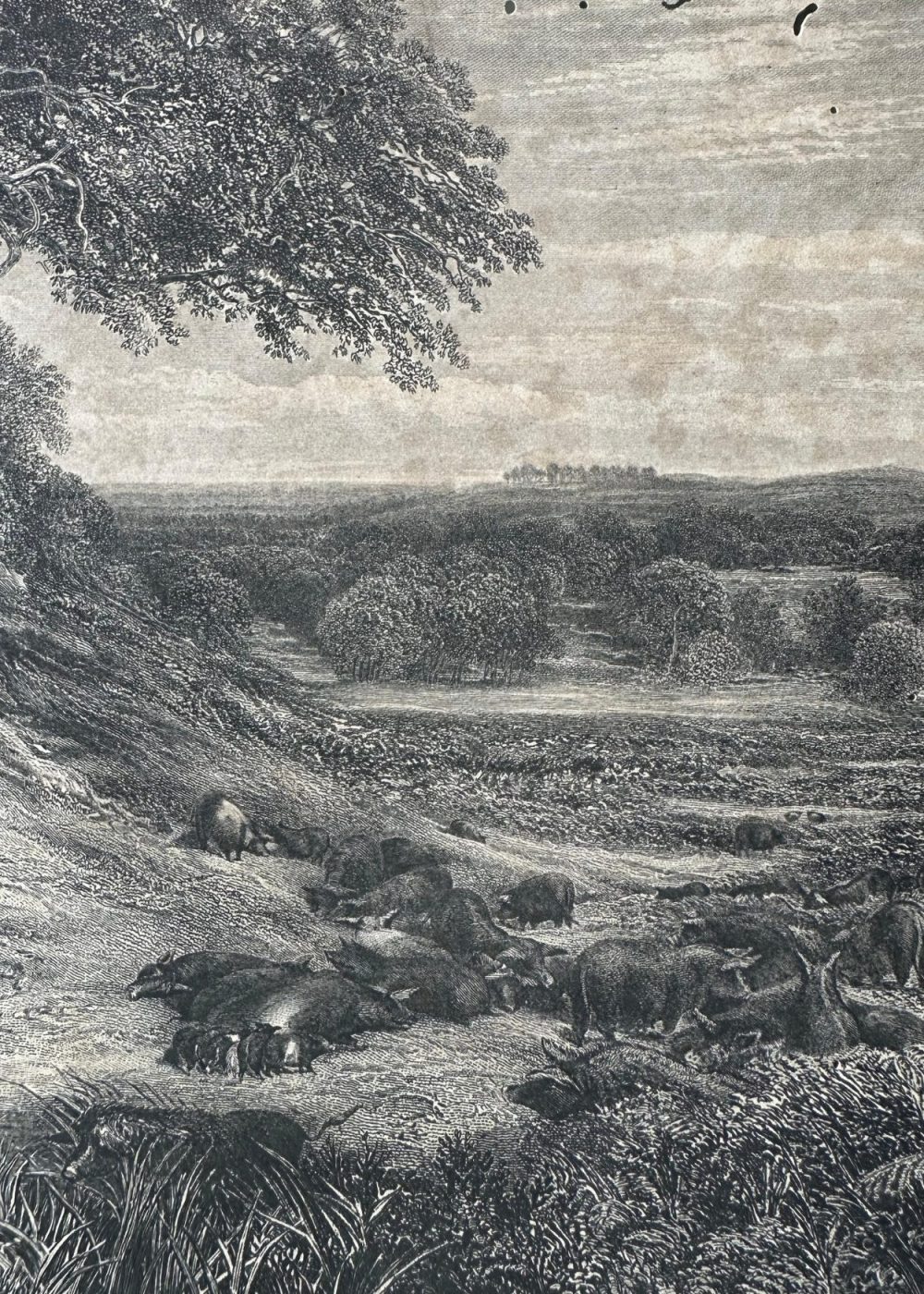 This evocative pastoral engraving by S. Bradshaw, after the original artwork by C. E. Johnson, captures a serene and nostalgic moment within a rural landscape, titled Gone the Two Herds. Dominated by a majestic old tree with sprawling roots and a thick canopy, the composition exudes the quiet dignity of the countryside. Beneath the tree, a lone figure—perhaps a shepherd or traveler—rests in contemplation, adding a human presence to the otherwise natural setting. The foreground is rich with detail: rocks, tufts of grass, and a small reflective pool of water that draws the eye toward the herd of cattle drinking or grazing peacefully nearby. Their gentle postures and close grouping evoke a sense of contentment and routine. The distant rolling fields and soft tree lines fade into the horizon under a calm sky, enhancing the theme of pastoral harmony and the passage of time. The title Gone the Two Herds may suggest a moment of transition or absence—possibly the end of a day’s work, a change in ownership, or even a deeper reflection on loss and memory in a rural life. With its intricate line work and naturalistic depth, the engraving stands as a poignant tribute to the English countryside and the lives intertwined with its rhythms.