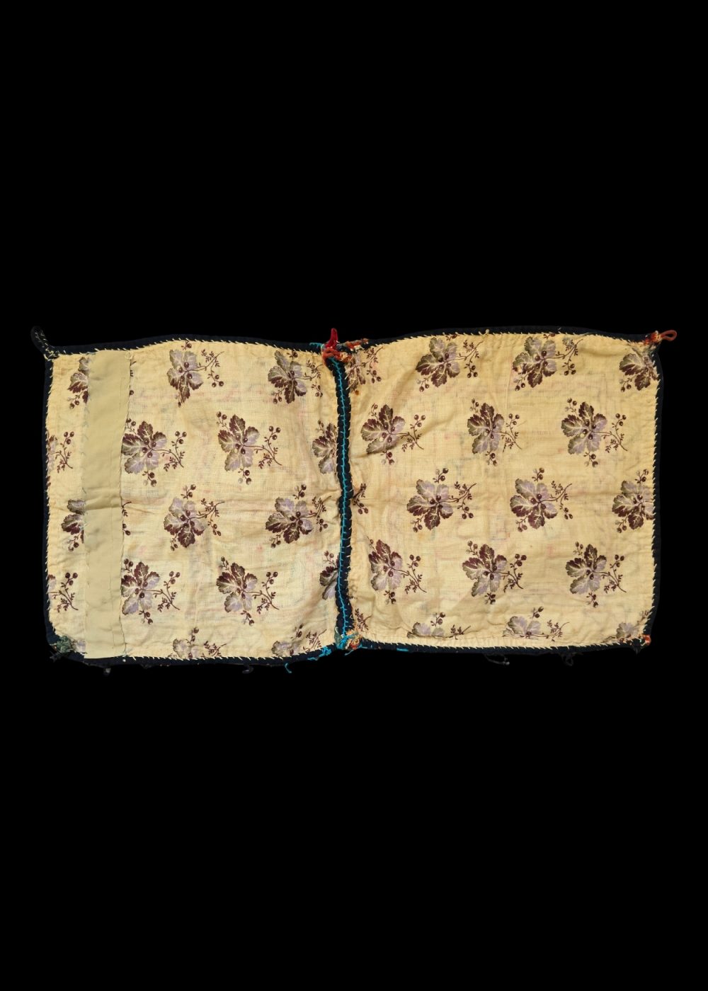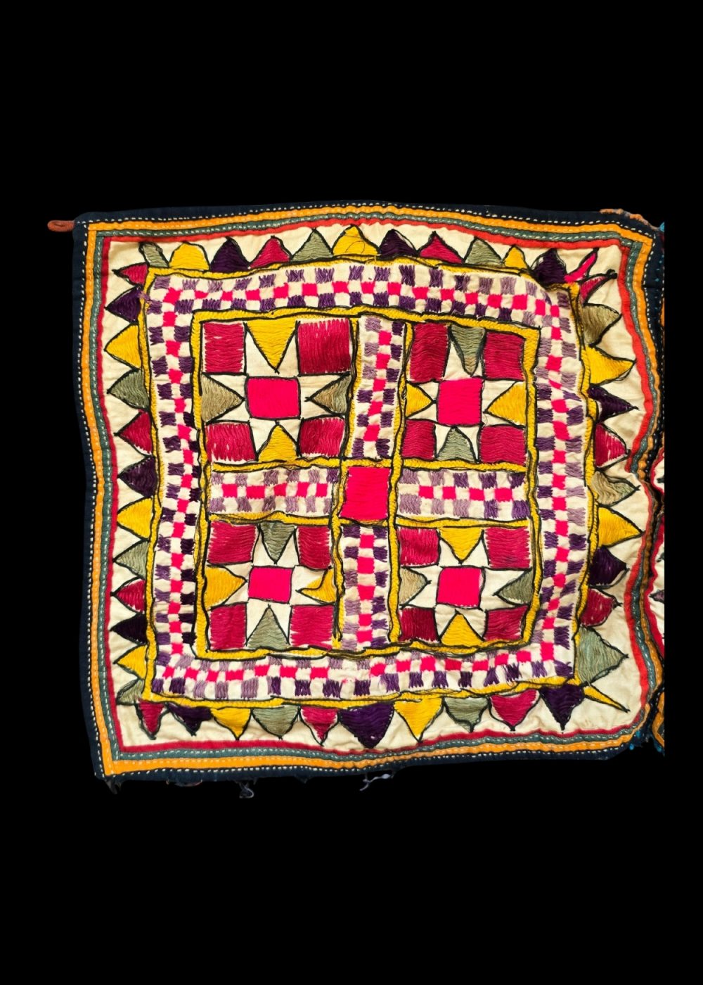 This hand-embroidered bag from Gujrat features intricate, colorful stitching with geometric patterns in vibrant reds, yellows, and deep purples. The design consists of symmetrical shapes, creating a rich, textured appearance. The embroidery reflects traditional craftsmanship, showcasing the skill and artistry that Gujrat is known for. The detailed patterns are framed with contrasting borders, giving the bag a dynamic and eye-catching look. It exemplifies the region’s rich cultural heritage and commitment to fine handwork.