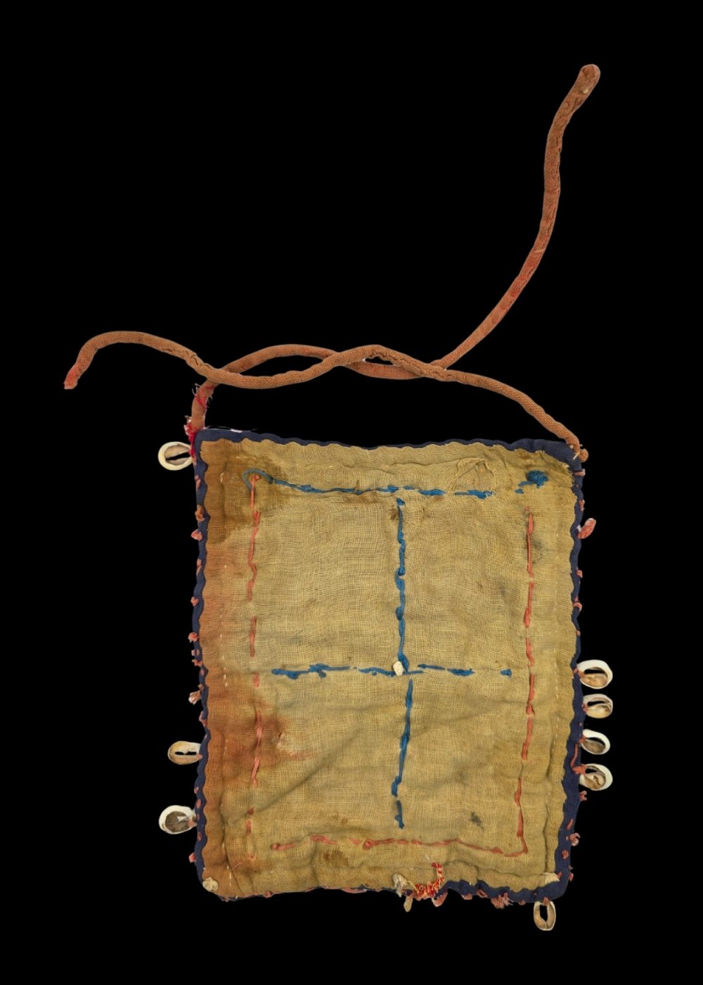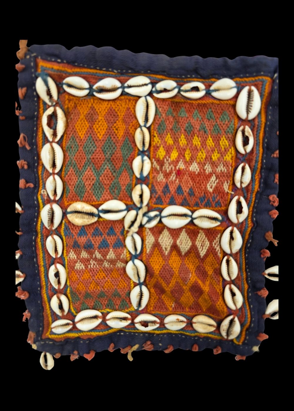 This image showcases a handcrafted Banjara gala, a traditional tribal neck or chest ornament worn by the Banjara community of India. The piece is richly decorated with vibrant handwoven fabric, featuring geometric diamond patterns in earthy tones like red, orange, green, and yellow. It is bordered and divided with cowrie shells, which hold both decorative and symbolic significance in tribal cultures. The edges are adorned with small fabric tassels, adding texture and movement. The simple cloth strap suggests it is worn as a necklace or chest piece, likely during cultural events or ceremonies. This piece reflects the Banjara’s rich textile heritage and craftsmanship.