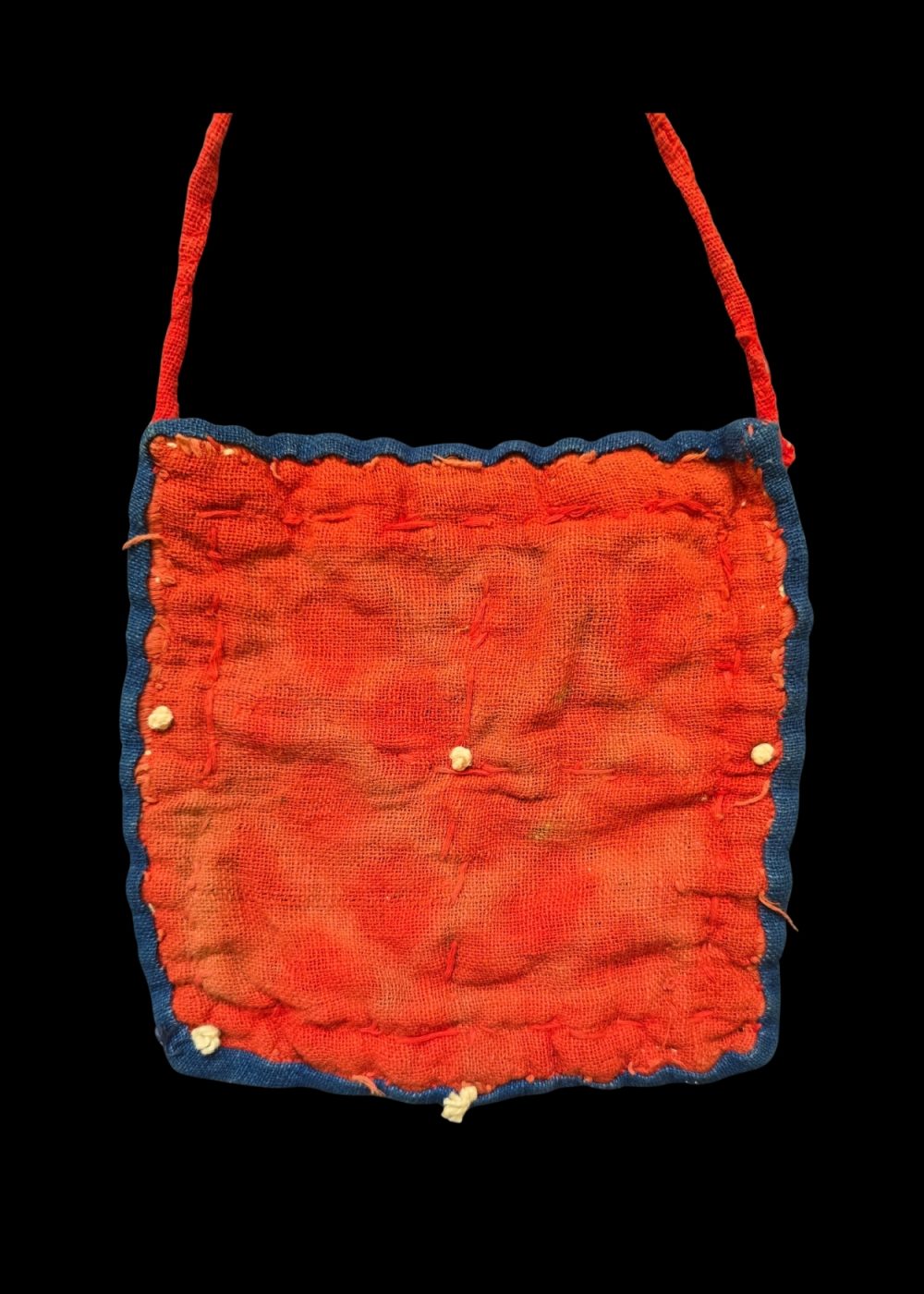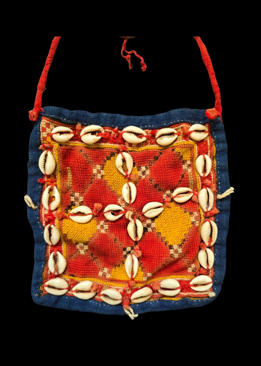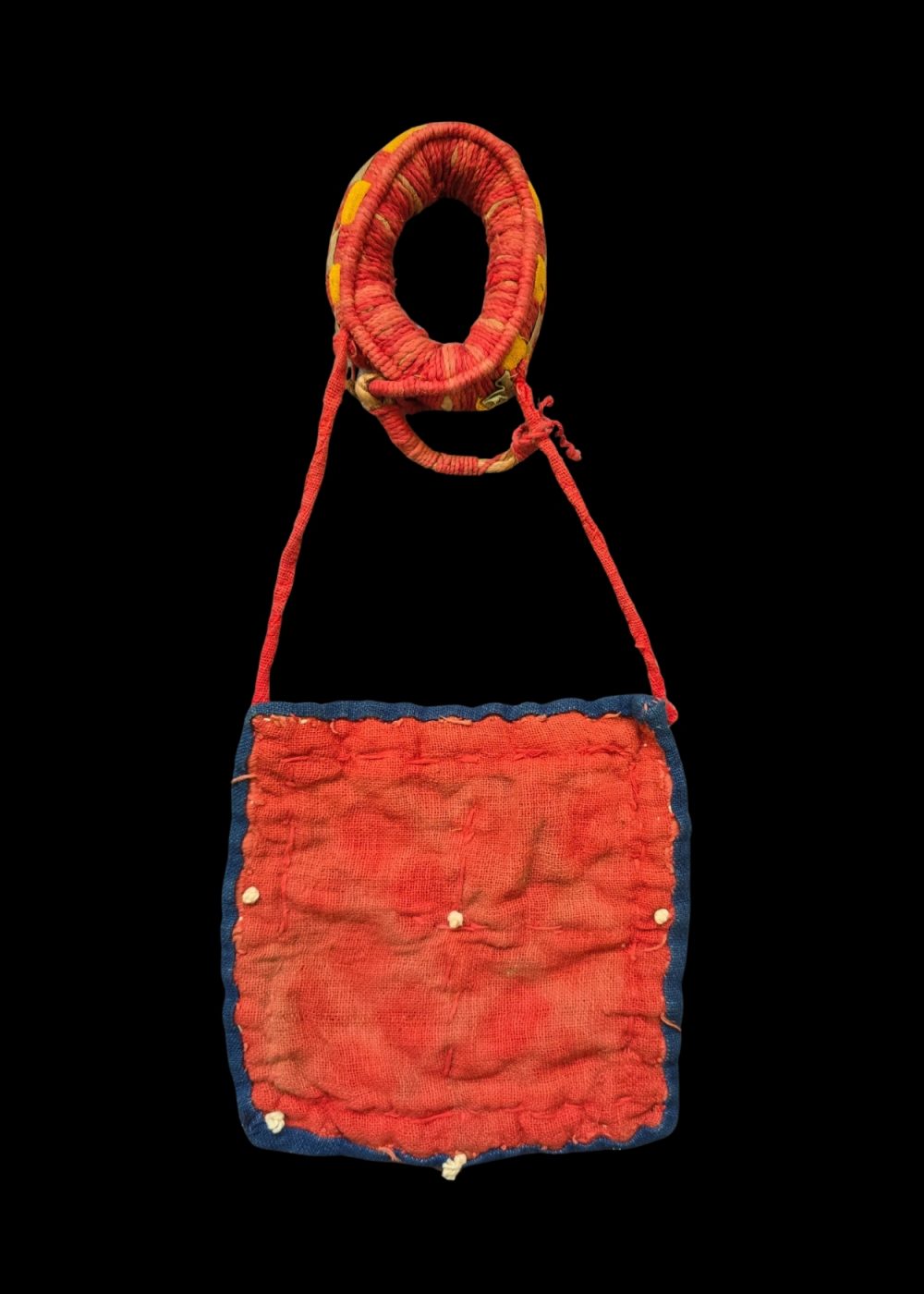 This is a traditional Banjara headset (Hindoni) with a pendant pouch, crafted by the Banjara community of India. The intricate design showcases vibrant colors, with a blend of red, yellow, and blue, and features embroidered geometric patterns. The decorative cowrie shells, adorning the edges, are symbolic elements often used in Banjara jewelry and accessories. The piece includes a circular twisted handle and a pouch-like body, which can be used for storing small items or as an ornamental pendant. This accessory is not only a functional item but also a cultural expression, representing the Banjara’s rich heritage of craftsmanship and vibrant aesthetics.