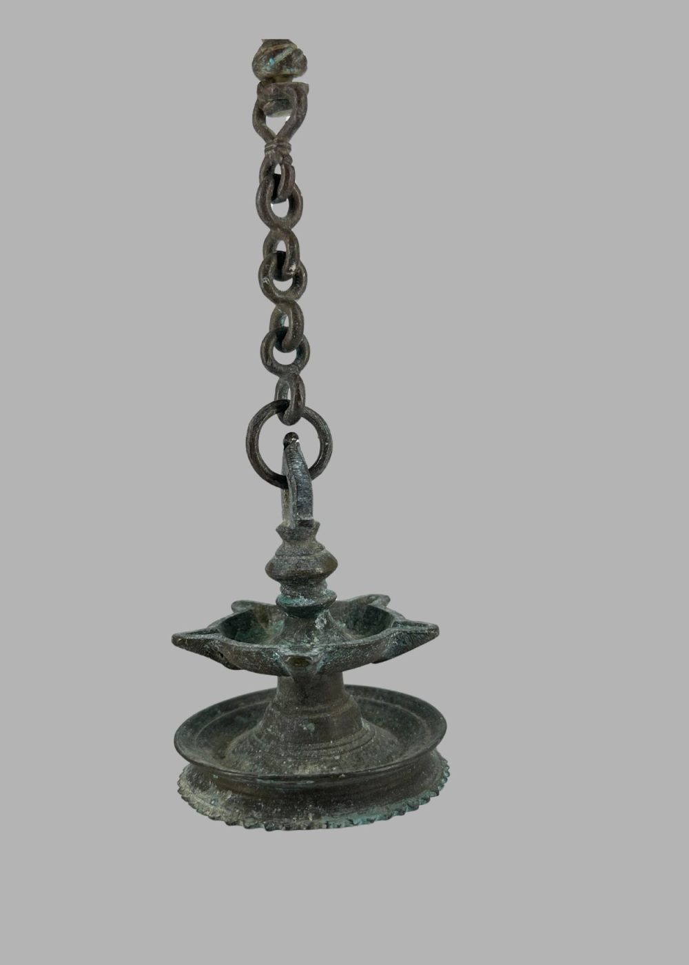 This hanging bronze oil lamp from South India exemplifies the continuity of classical design and devotional function in modern craftsmanship. Suspended by a sturdy linked chain, the lamp features a central stem topped with a finial and a wide, circular reservoir with four petal-shaped spouts for holding oil and wicks. Its form reflects the traditional deepalakshmi style, commonly used in temples and homes for ritual lighting. The gently aged patina and balanced proportions reveal a strong adherence to age-old techniques, celebrating the cultural symbolism of light as a manifestation of knowledge and divinity. Such lamps are typically hung in prayer halls or temple sanctums, serving as both spiritual offerings and enduring works of sacred art.