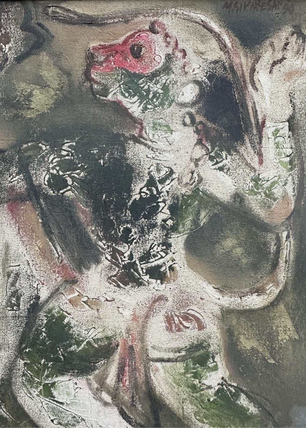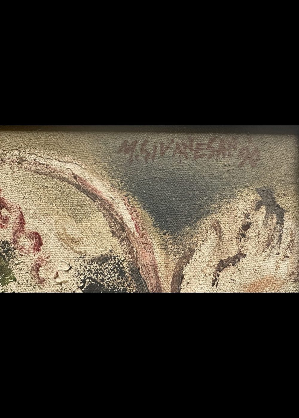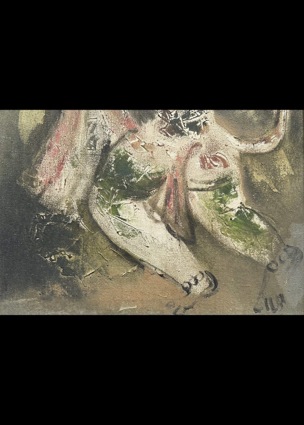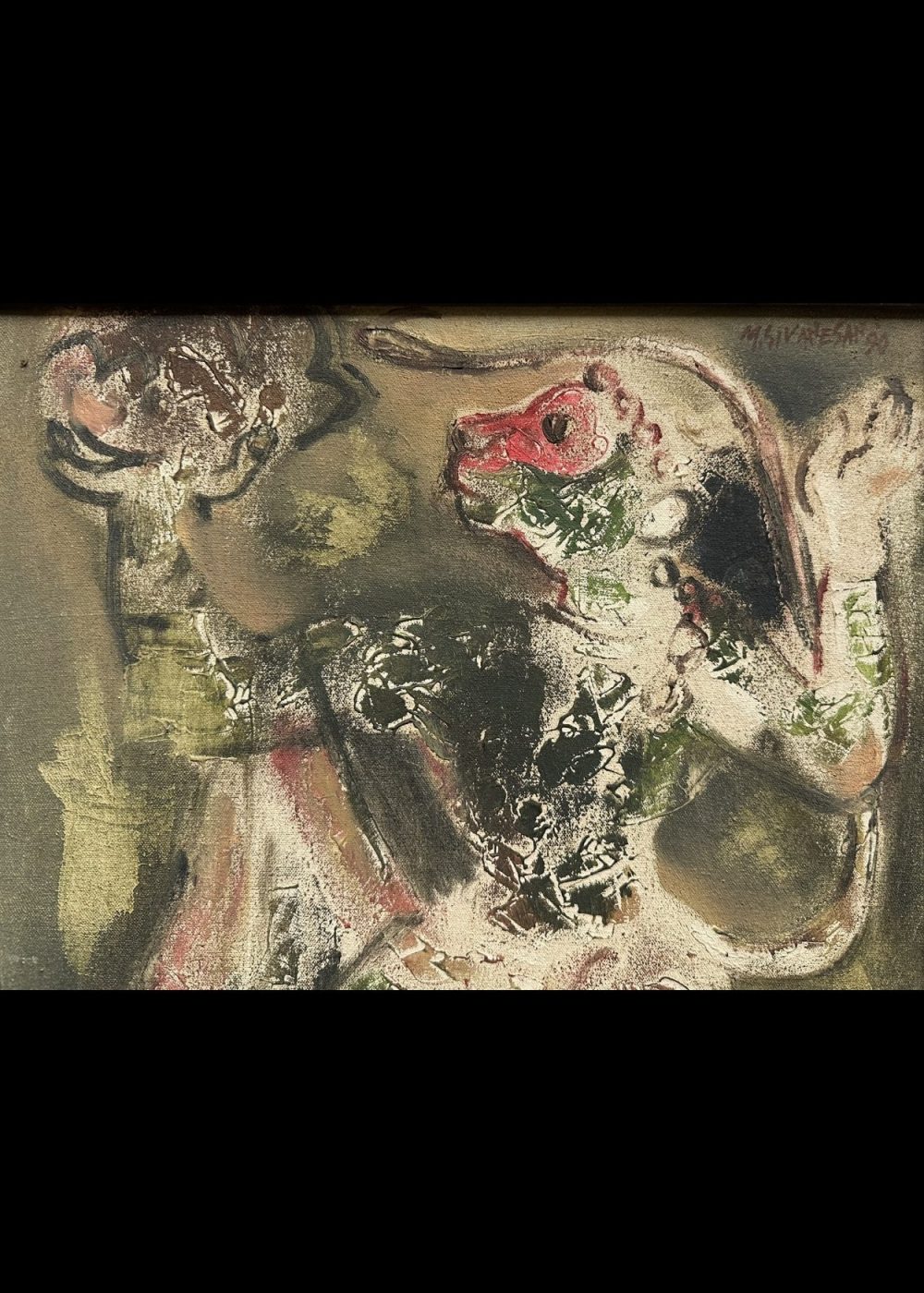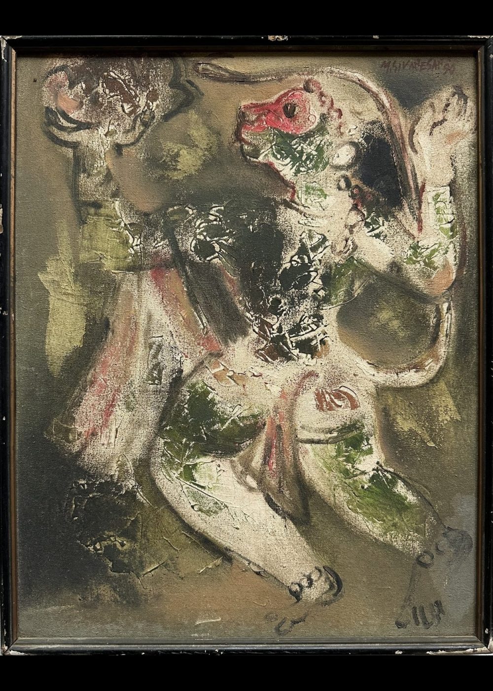 This dynamic painting presents a bold, abstracted depiction of Hanuman, the revered monkey god from the Indian epic Ramayana. Executed with vigorous brushstrokes and a limited yet striking color palette of reds, greens, and blacks, the figure is shown in motion, possibly holding the Sanjeevani mountain. The expressive style, rough textures, and layered pigments reflect modernist influences, conveying spiritual energy and mythological drama. The artwork bears a signature on the top right, possibly reading “M. F. Husain,” suggesting it may be attributed to the renowned Indian modernist known for fusing traditional themes with contemporary techniques. The stylization and movement are hallmark traits of Husain’s mythological renderings.