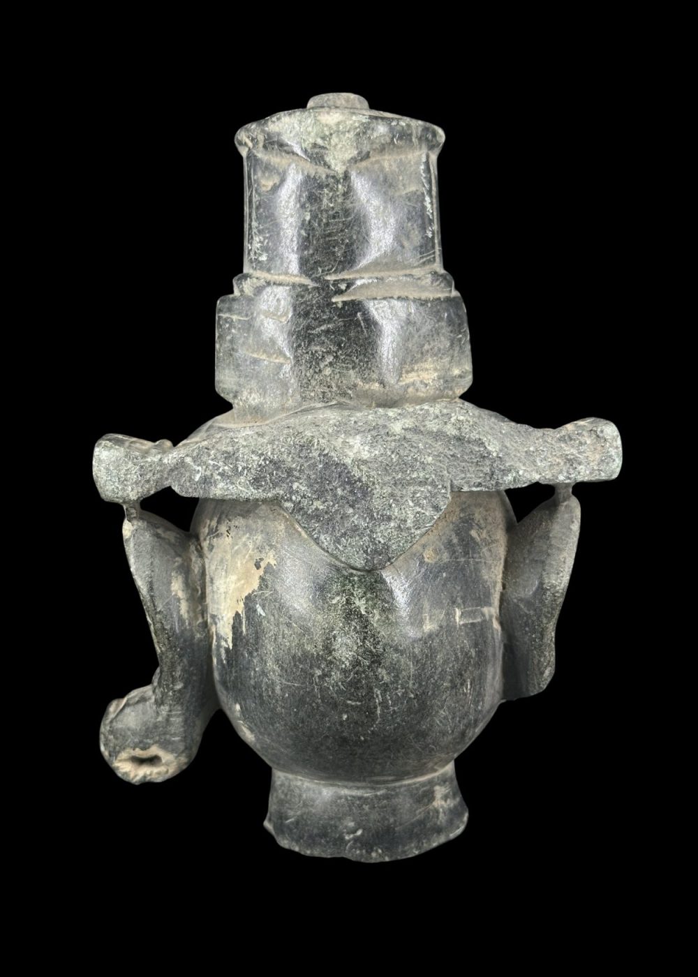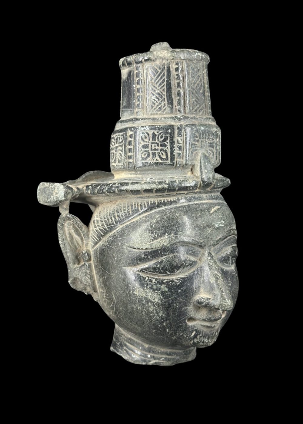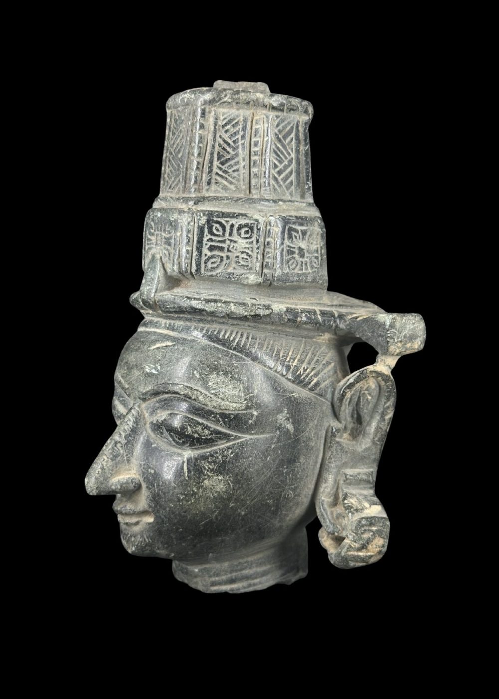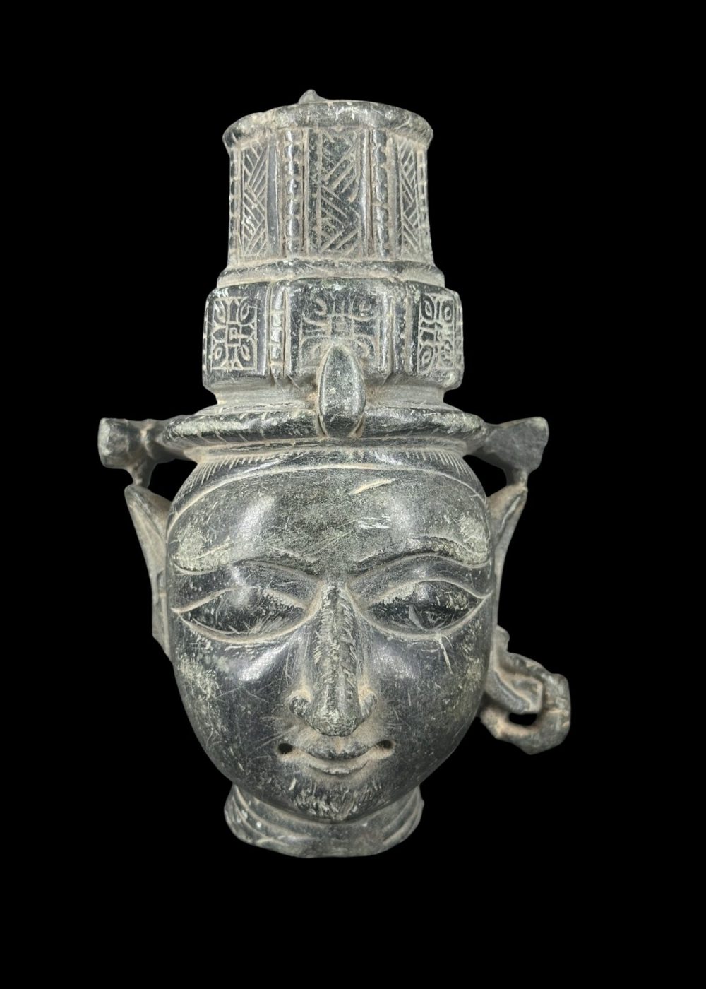 This finely carved stone sculpture presents a stylized human face adorned with an elaborate headdress featuring geometric motifs. The almond-shaped eyes, elongated nose, and subtle smile convey a serene, meditative expression, while the extended ears with decorative elements suggest divine or royal status. The symmetrical detailing and refined execution reflect skilled craftsmanship, likely rooted in temple architecture or devotional art traditions.