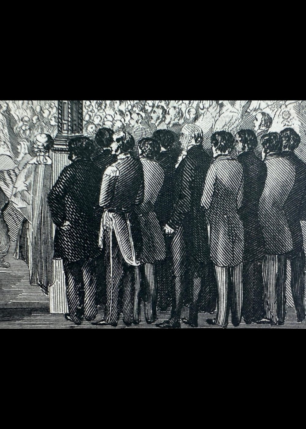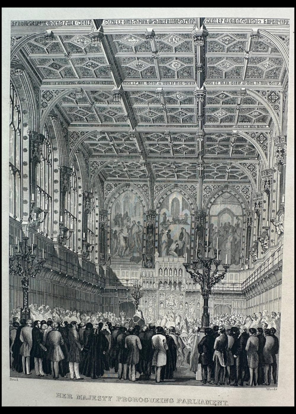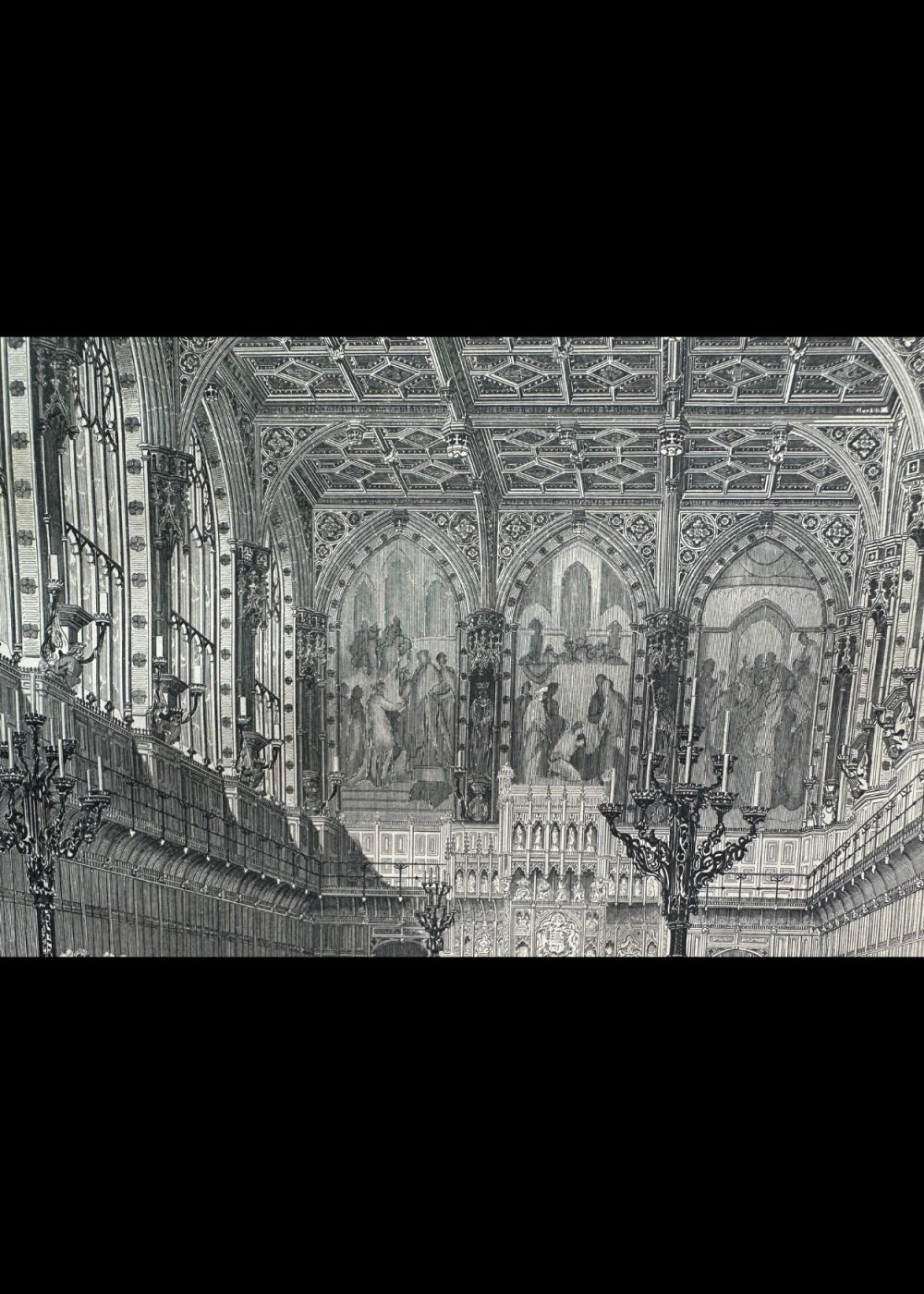 This engraving, titled “Her Majesty Proroguing Parliament, House of Lords”, captures a ceremonial moment within the House of Lords. The scene depicts Queen Victoria, dressed in regal attire, as she officially prorogues Parliament. The ornate Gothic Revival architecture of the House of Lords, with its intricate ceiling and grandiose interior, serves as a backdrop to the dignitaries and members of the aristocracy who have gathered. The detailed depiction of the richly decorated chamber and the crowd of well-dressed men and women emphasizes the splendor of Victorian Britain and its political ceremonies. This image is part of The Crystal Palace and Its Contents, highlighting not only architectural and cultural achievements but also significant moments in the nation’s governance.