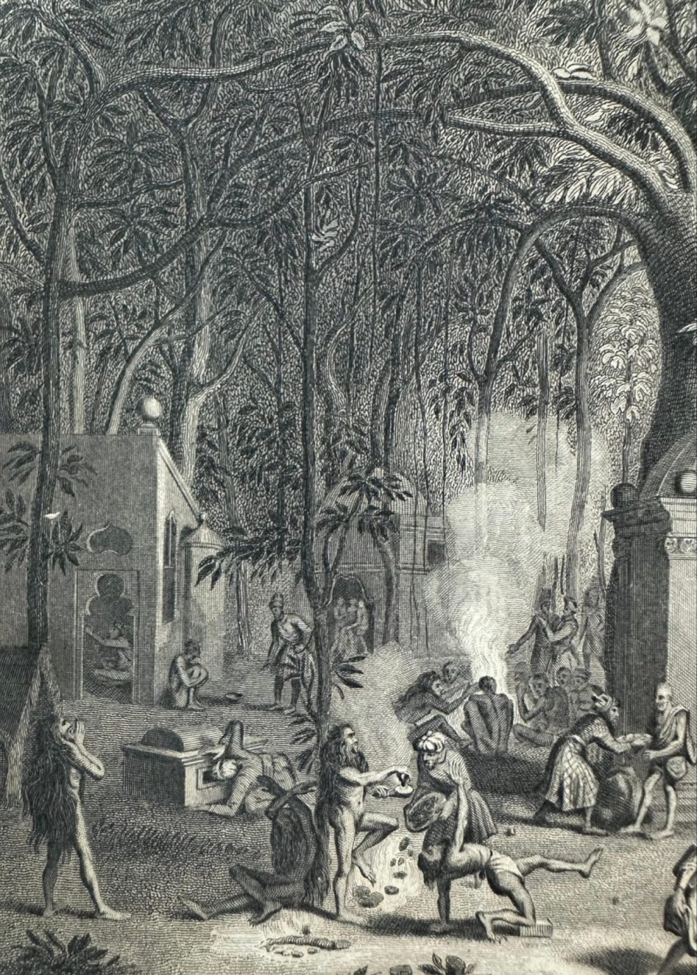 “THE FAITHS IN THE WORLD”. A dictionary of all religions and their religious sects. by The Rev. James Gardner. This historical engraving depicts a Zoroastrian high priest, referred to as a “Guehre,” engaged in a sacred fire ritual. Dressed in traditional robes and a distinctive pointed headdress, he holds a ritual text in one hand and a bundle of sticks or reeds in the other. He stands reverently before a burning sacred fire, a central symbol in Zoroastrian worship. The artwork captures the solemnity and spiritual devotion of ancient Persian fire-worship practices, which trace back to one of the world’s oldest monotheistic religions.