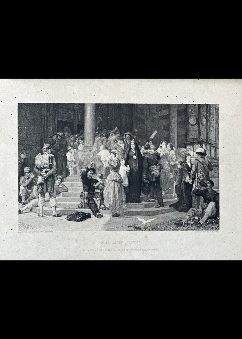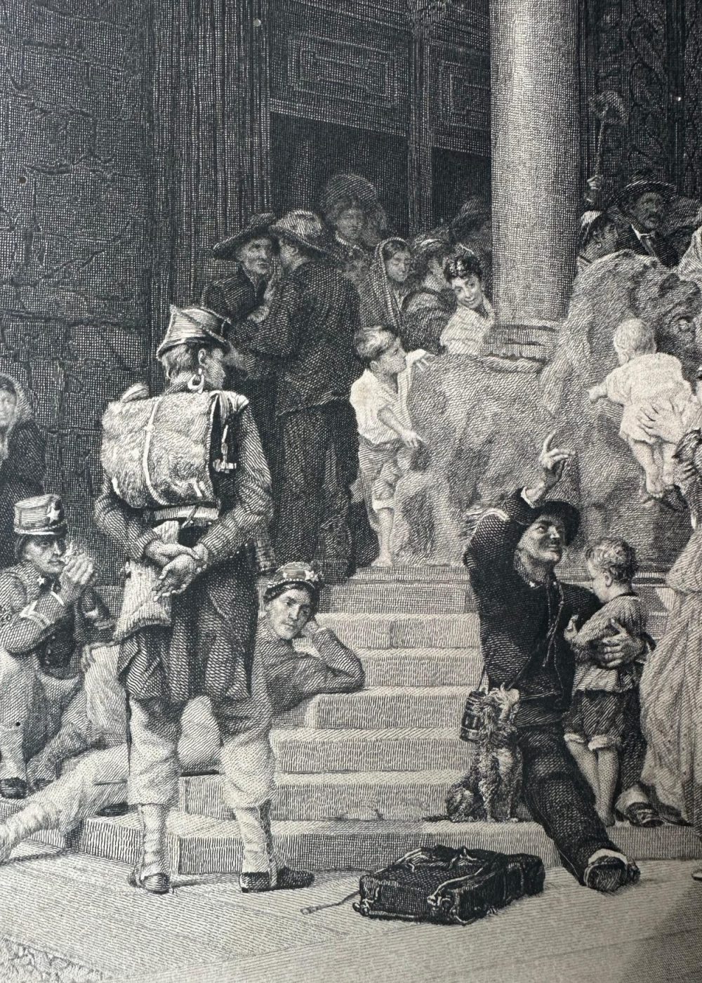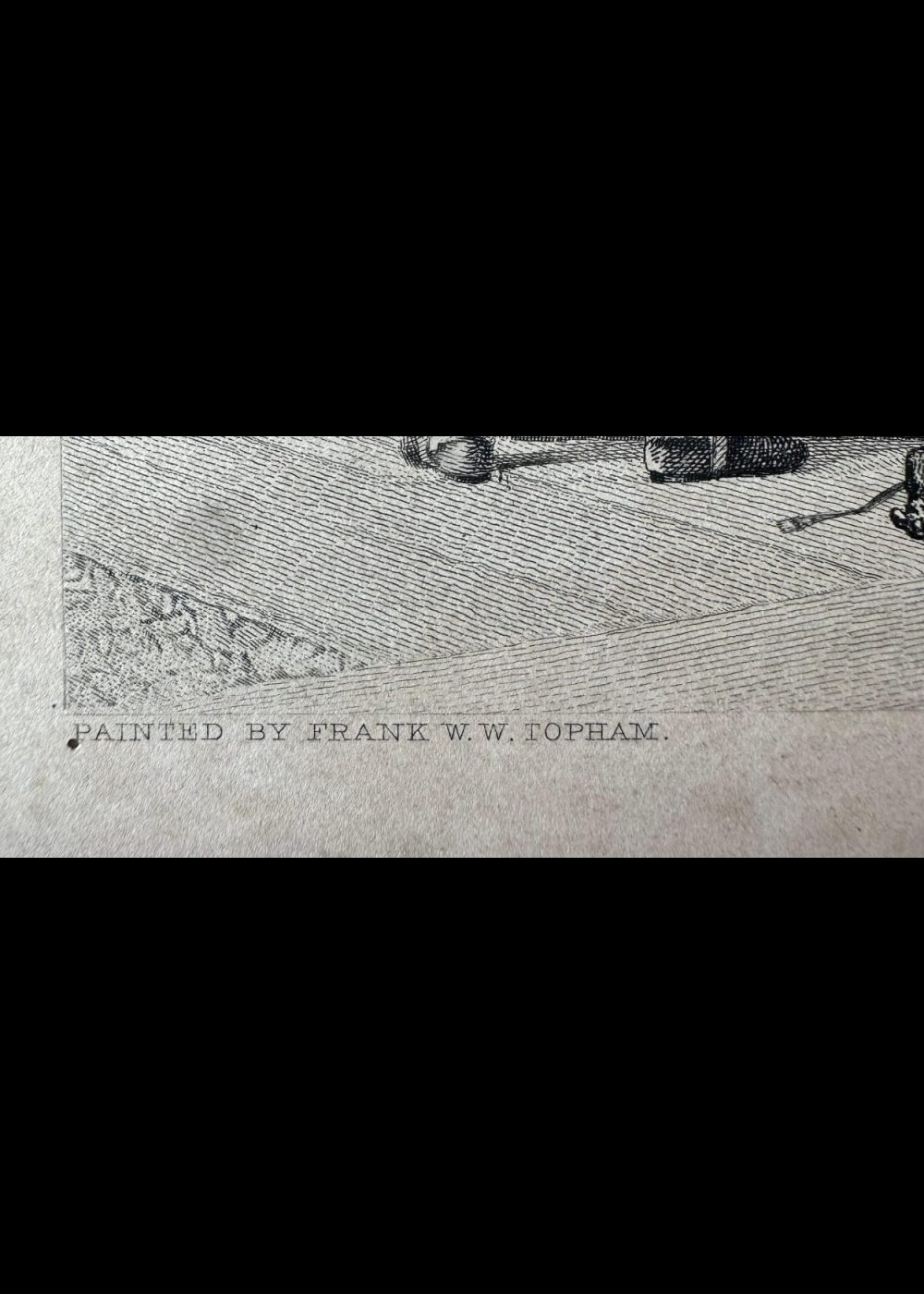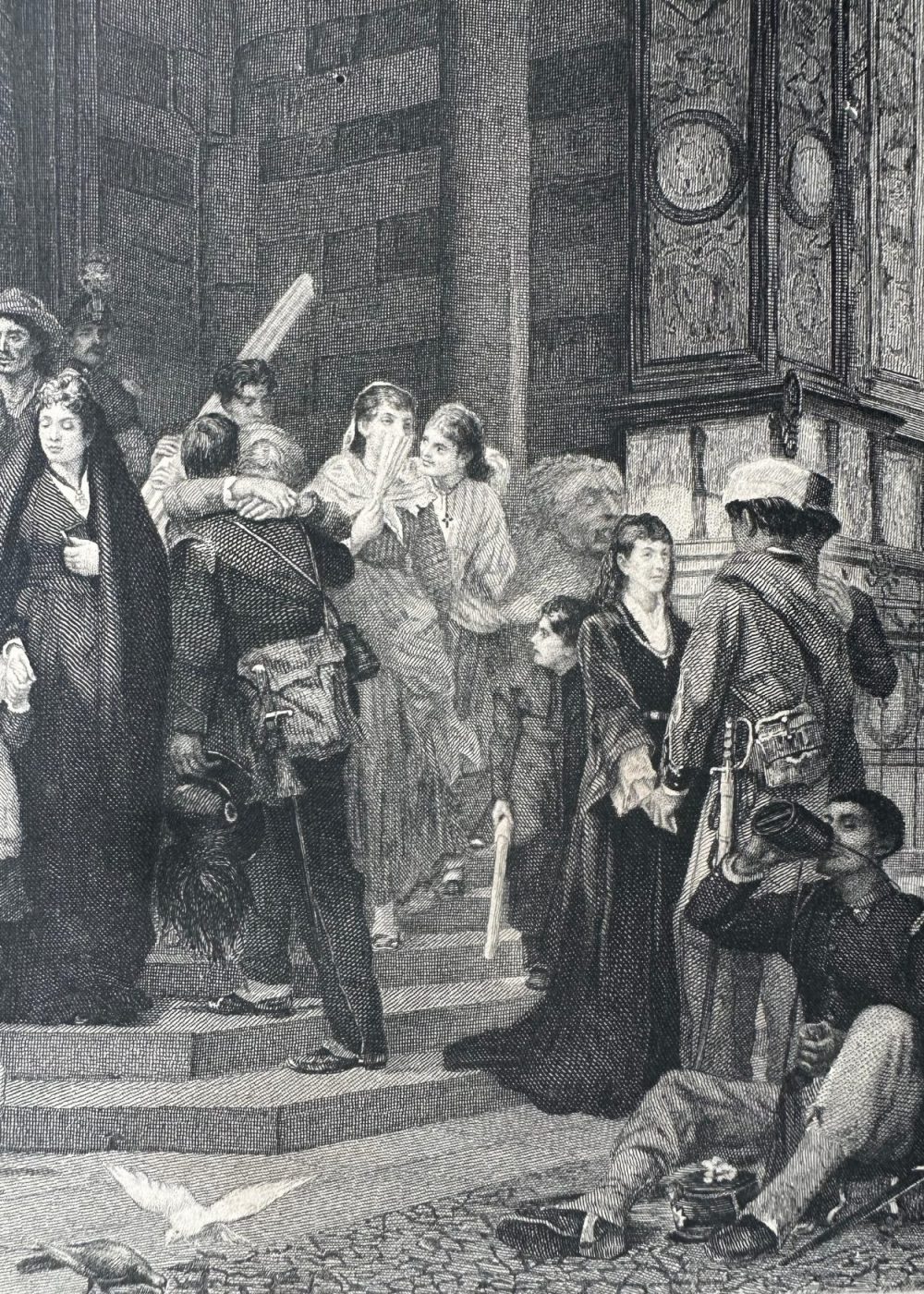 The image portrays a rich and animated street scene, likely set in a European city during the Renaissance or Baroque period, as suggested by the architectural details and clothing styles. Men, women, and children of various ages and social statuses are shown engaging in conversation, playing instruments, reading, and resting. The artist, Frank W.W. Topham, was known for his detailed and narrative-rich depictions of historical and everyday scenes, often infused with romanticism and human emotion. The composition is balanced and vibrant, with the steps serving as a central axis around which the figures are arranged. The architectural backdrop features classical columns, elaborate masonry, and a sense of depth created through fine engraving techniques by A. Danse.