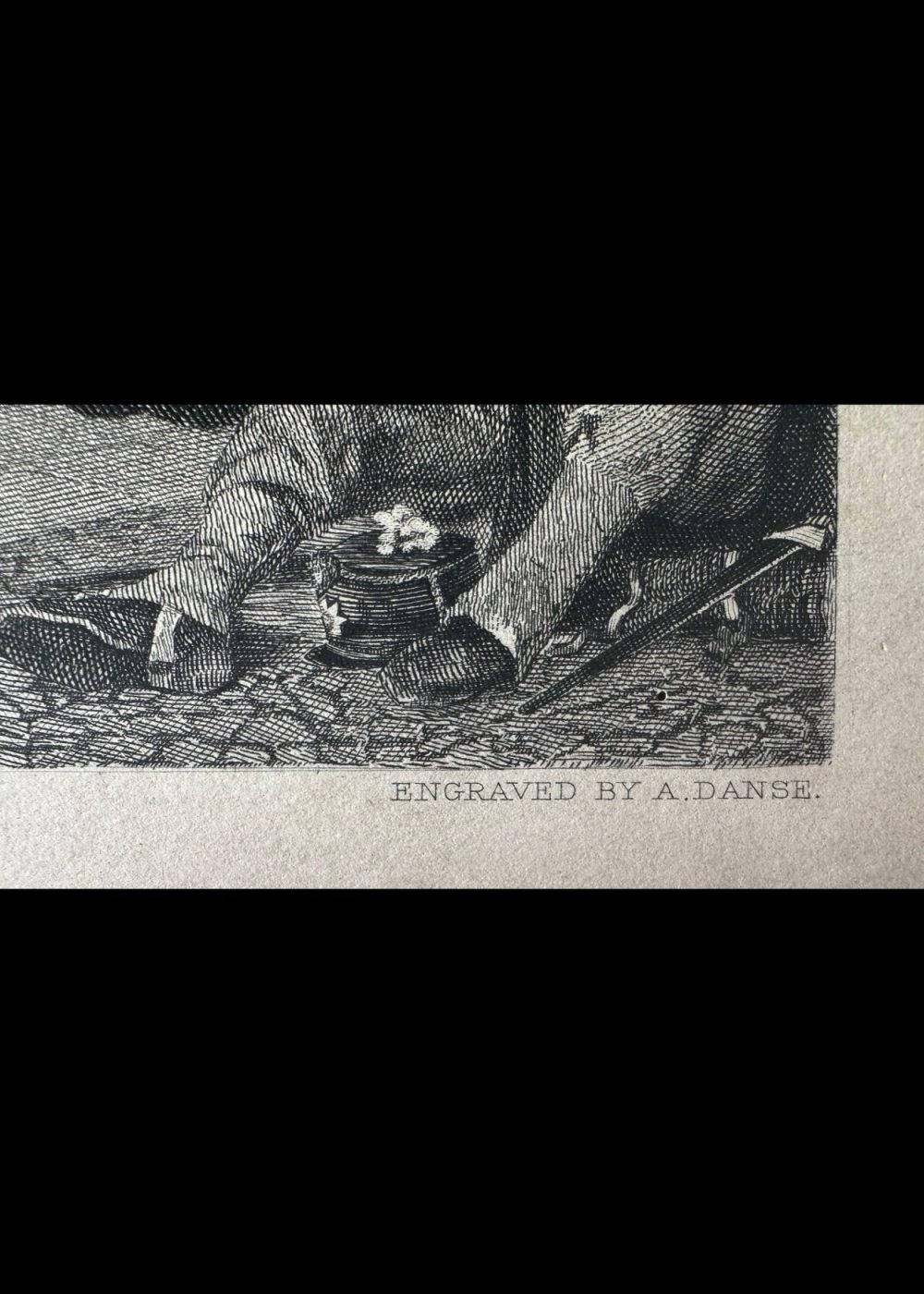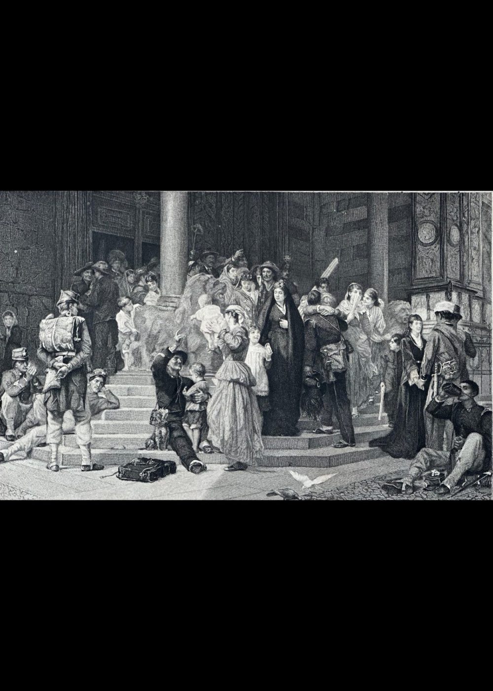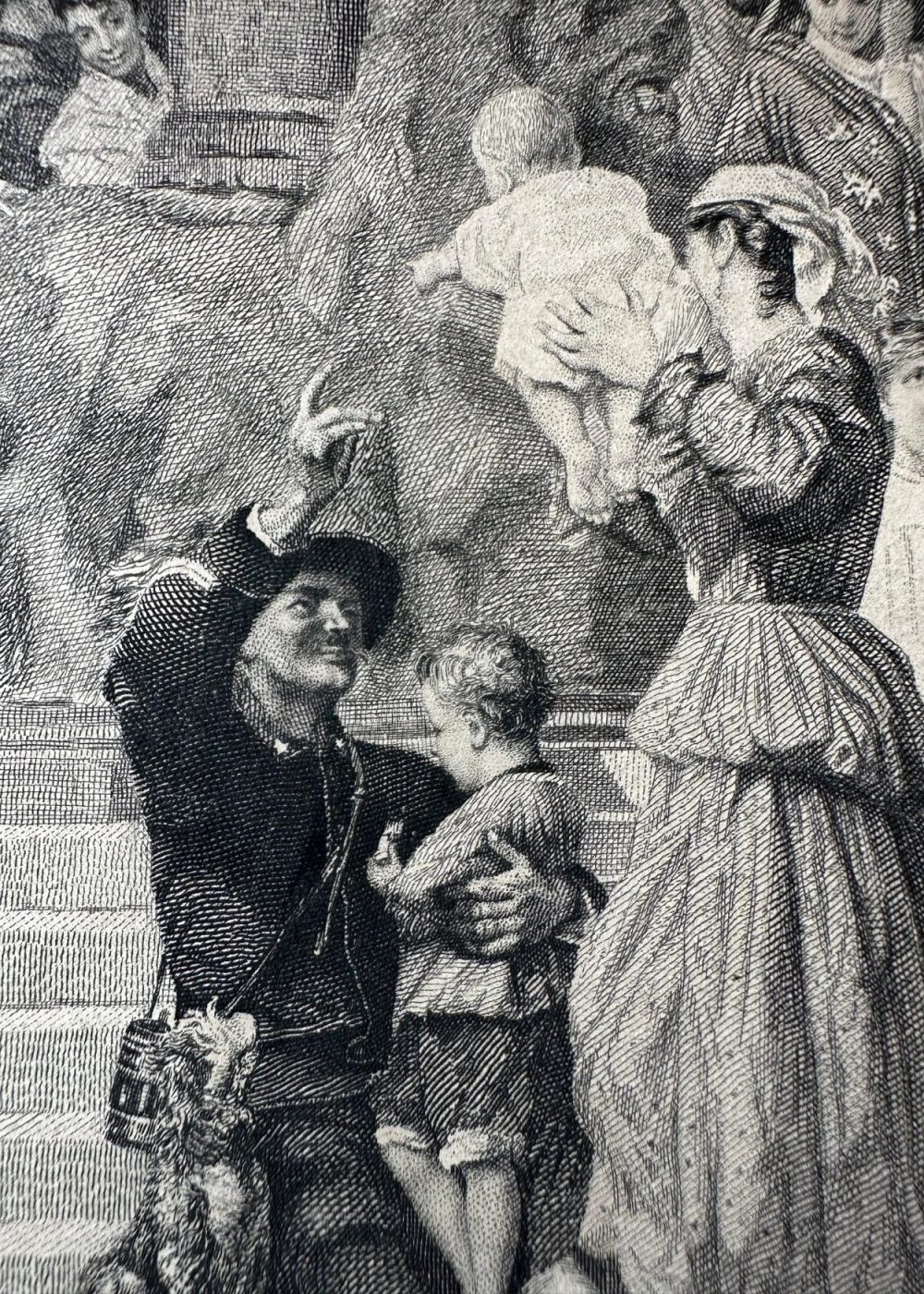 The image portrays a rich and animated street scene, likely set in a European city during the Renaissance or Baroque period, as suggested by the architectural details and clothing styles. Men, women, and children of various ages and social statuses are shown engaging in conversation, playing instruments, reading, and resting. The artist, Frank W.W. Topham, was known for his detailed and narrative-rich depictions of historical and everyday scenes, often infused with romanticism and human emotion. The composition is balanced and vibrant, with the steps serving as a central axis around which the figures are arranged. The architectural backdrop features classical columns, elaborate masonry, and a sense of depth created through fine engraving techniques by A. Danse.