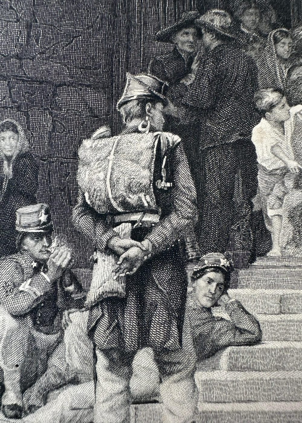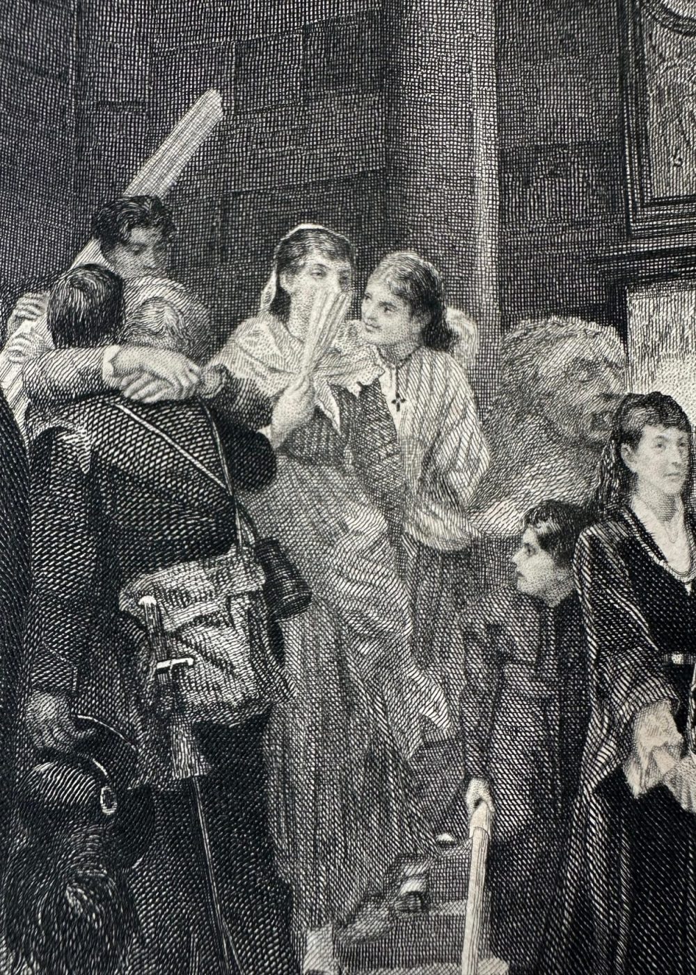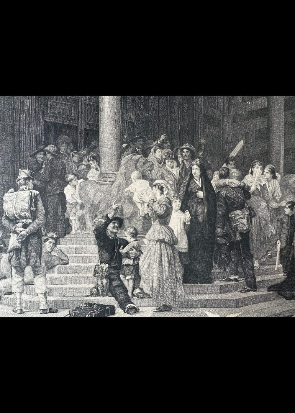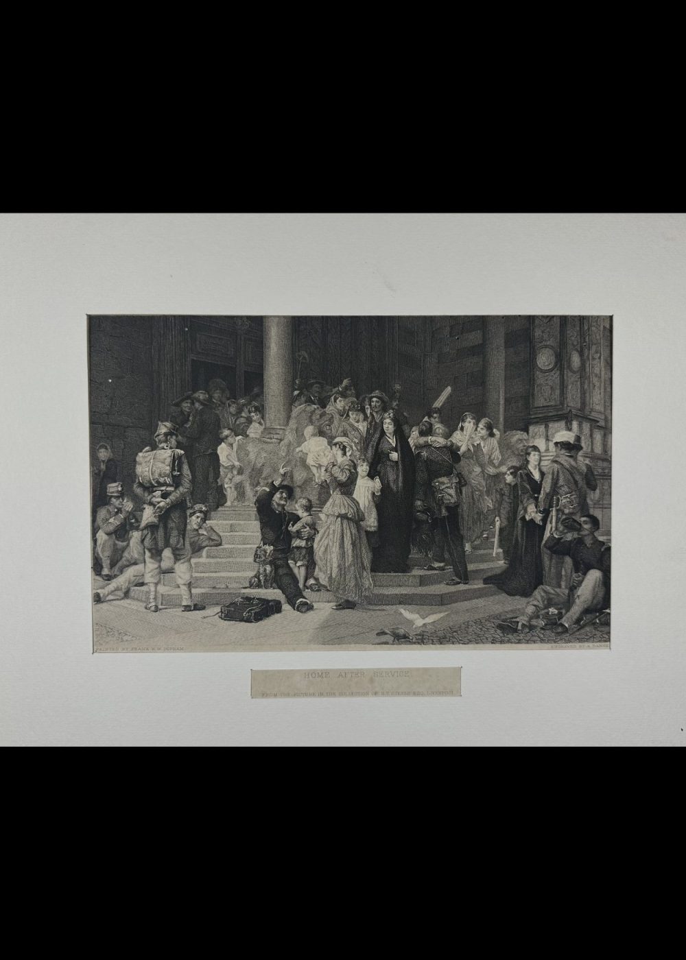 The image portrays a rich and animated street scene, likely set in a European city during the Renaissance or Baroque period, as suggested by the architectural details and clothing styles. Men, women, and children of various ages and social statuses are shown engaging in conversation, playing instruments, reading, and resting. The artist, Frank W.W. Topham, was known for his detailed and narrative-rich depictions of historical and everyday scenes, often infused with romanticism and human emotion. The composition is balanced and vibrant, with the steps serving as a central axis around which the figures are arranged. The architectural backdrop features classical columns, elaborate masonry, and a sense of depth created through fine engraving techniques by A. Danse.
