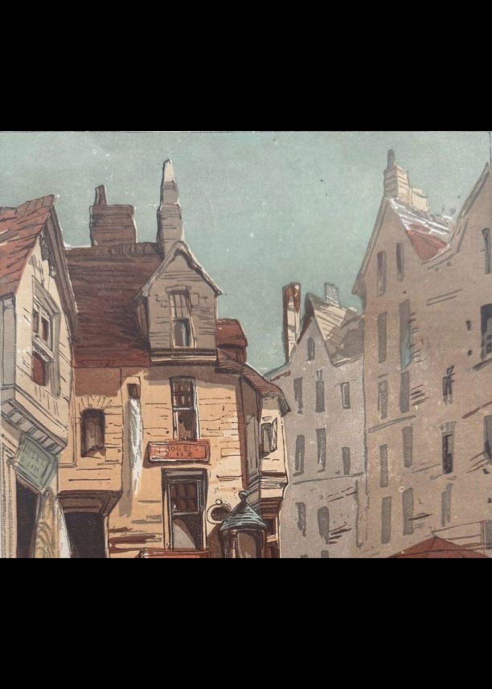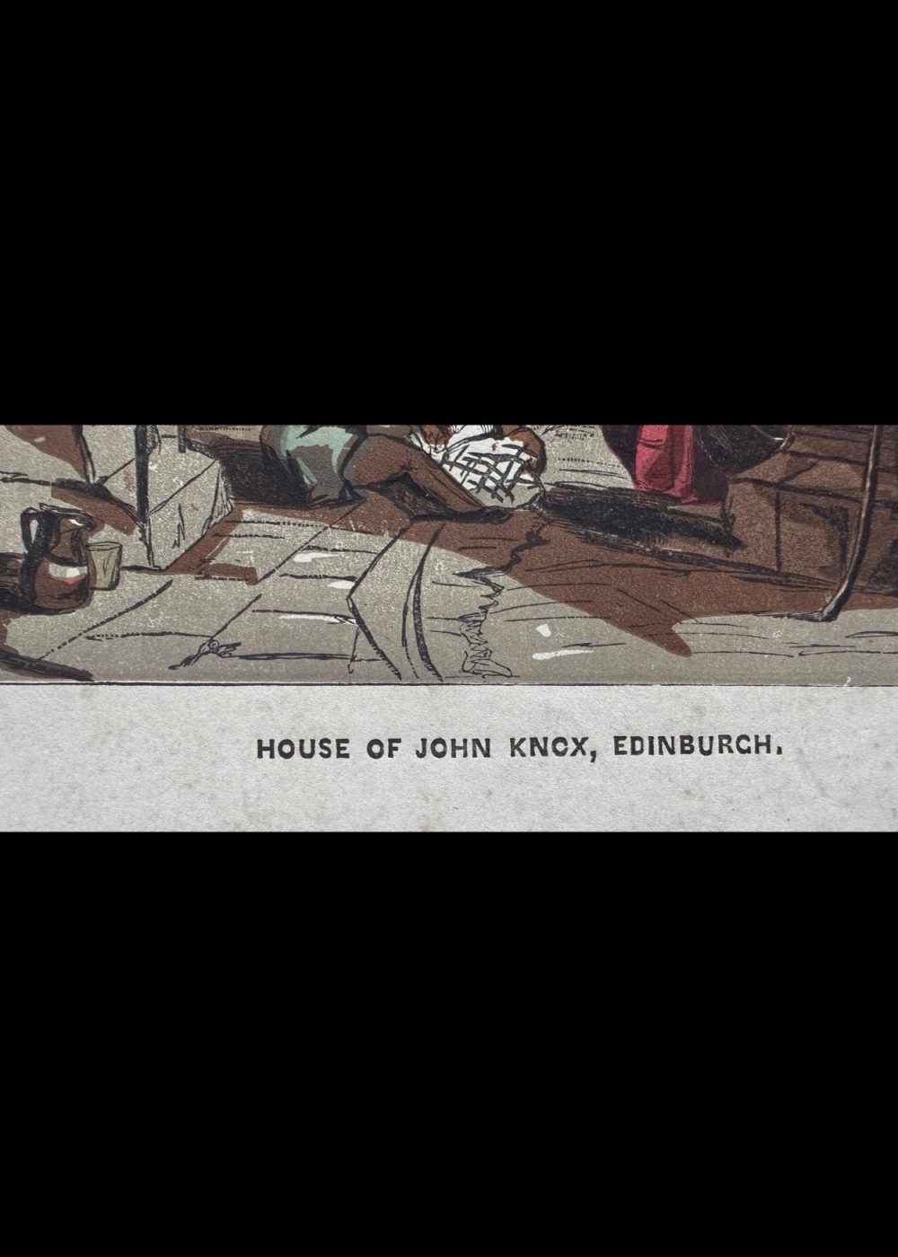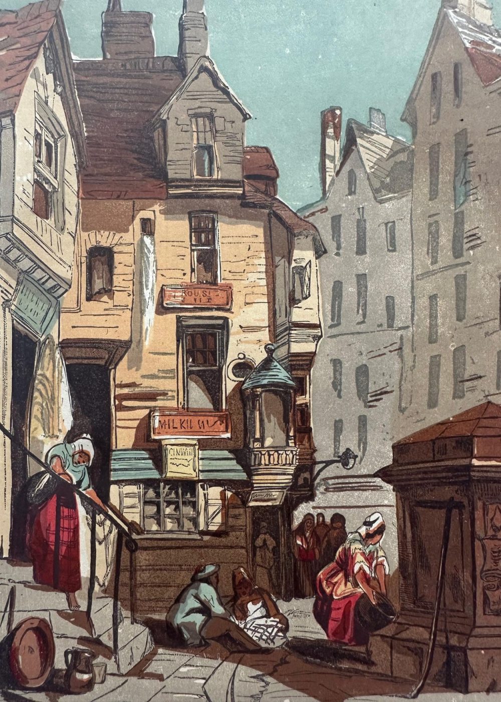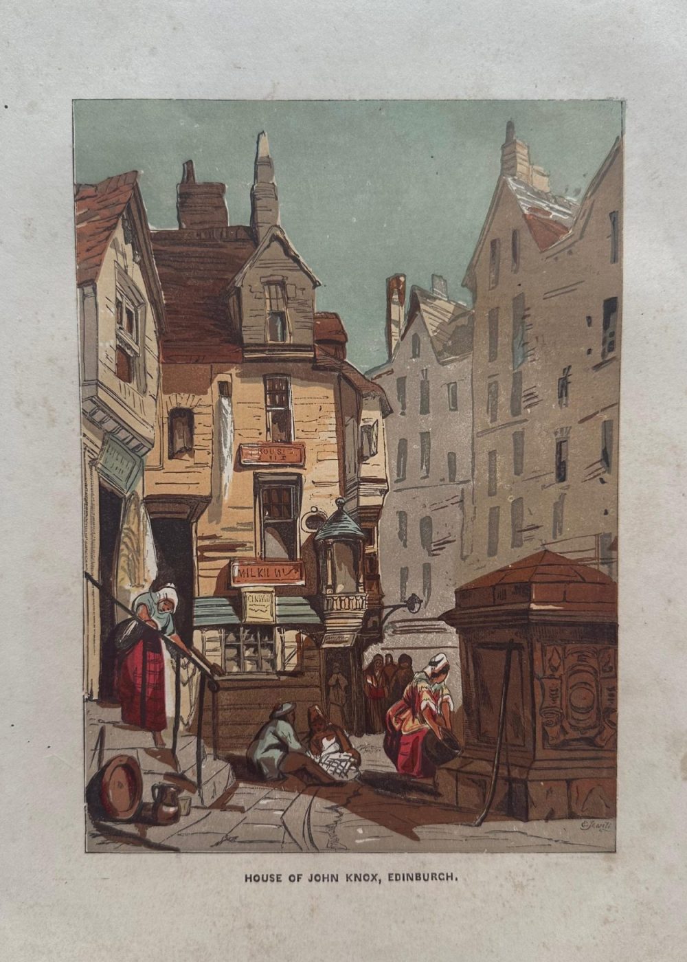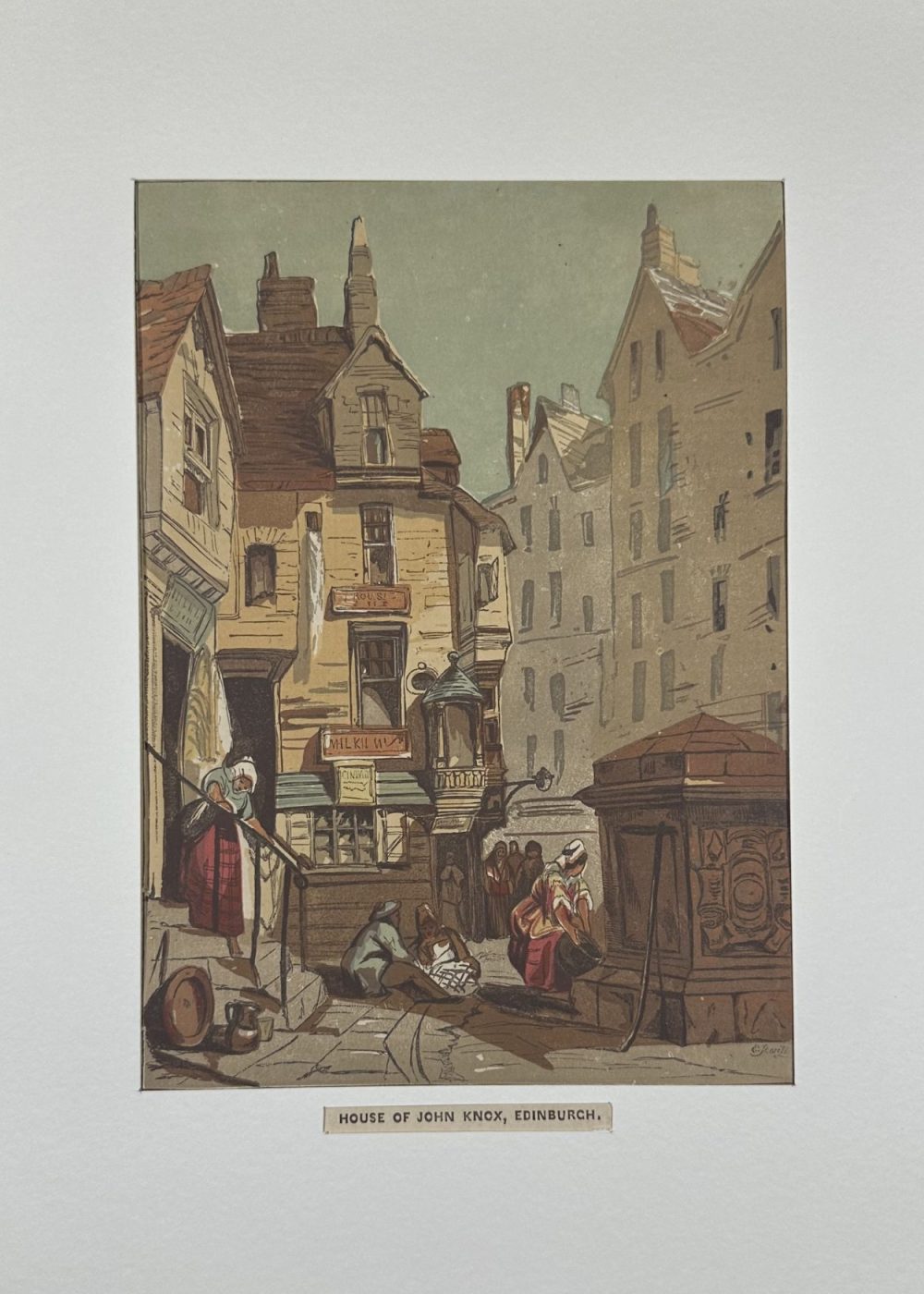 This historically rich artwork presents a detailed street view of Edinburgh featuring the residence of John Knox, a central figure in the Scottish Reformation. The house displays steep gabled roofs, period chimneys, and textured stone walls, capturing the architectural charm of the era. Life unfolds around it—figures in traditional attire gather near a water pump, converse on the steps, or linger nearby, offering a glimpse into daily urban life in centuries past. The scene conveys both civic nostalgia and cultural legacy.