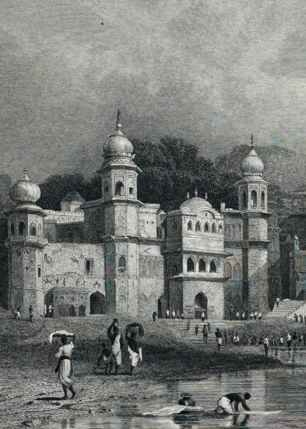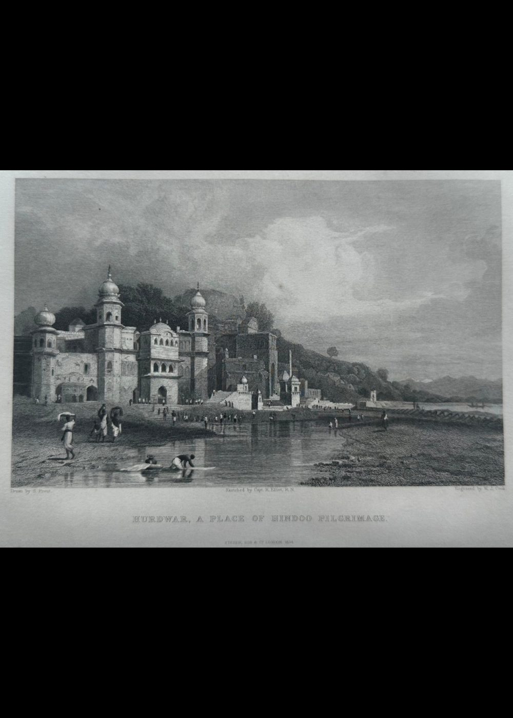 This engraving depicts “Hardwar, A Place of Hindu Pilgrimage,” illustrating the sacred city of Haridwar, India. The scene portrays a grand architectural structure along the riverbank, with pilgrims walking and bathing in the holy waters, a common practice at this significant spiritual site. The majestic buildings, with domed structures and steps leading down to the river, are rendered with fine details. Several figures are depicted engaged in various activities, from bathing to walking along the river. The engraving was sketched by Captain R. Elliot, R.N., and engraved by W. J. Cook, with the original drawing by S. Prout. This image is part of the “India-China” book, capturing the spiritual and cultural essence of India during the 19th century.