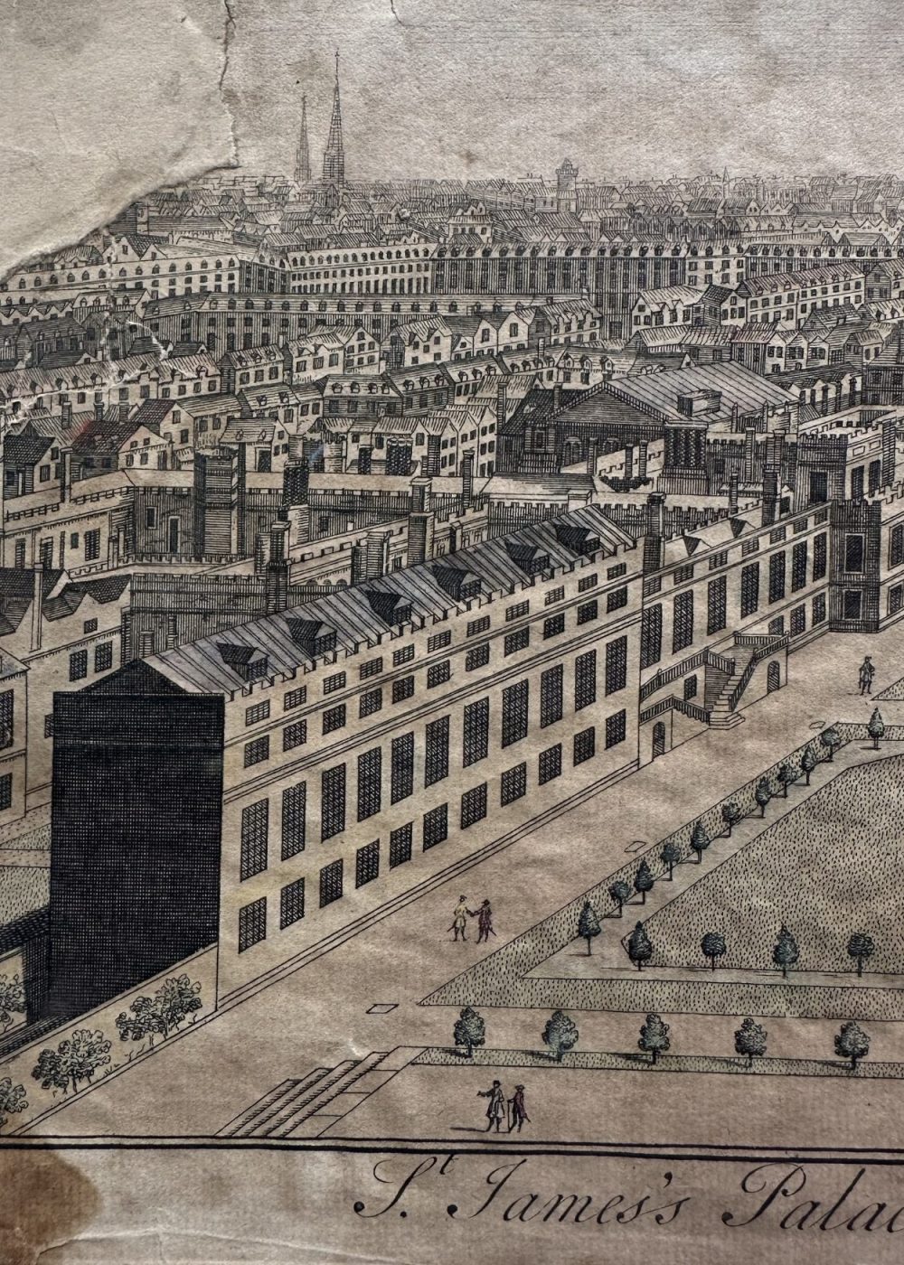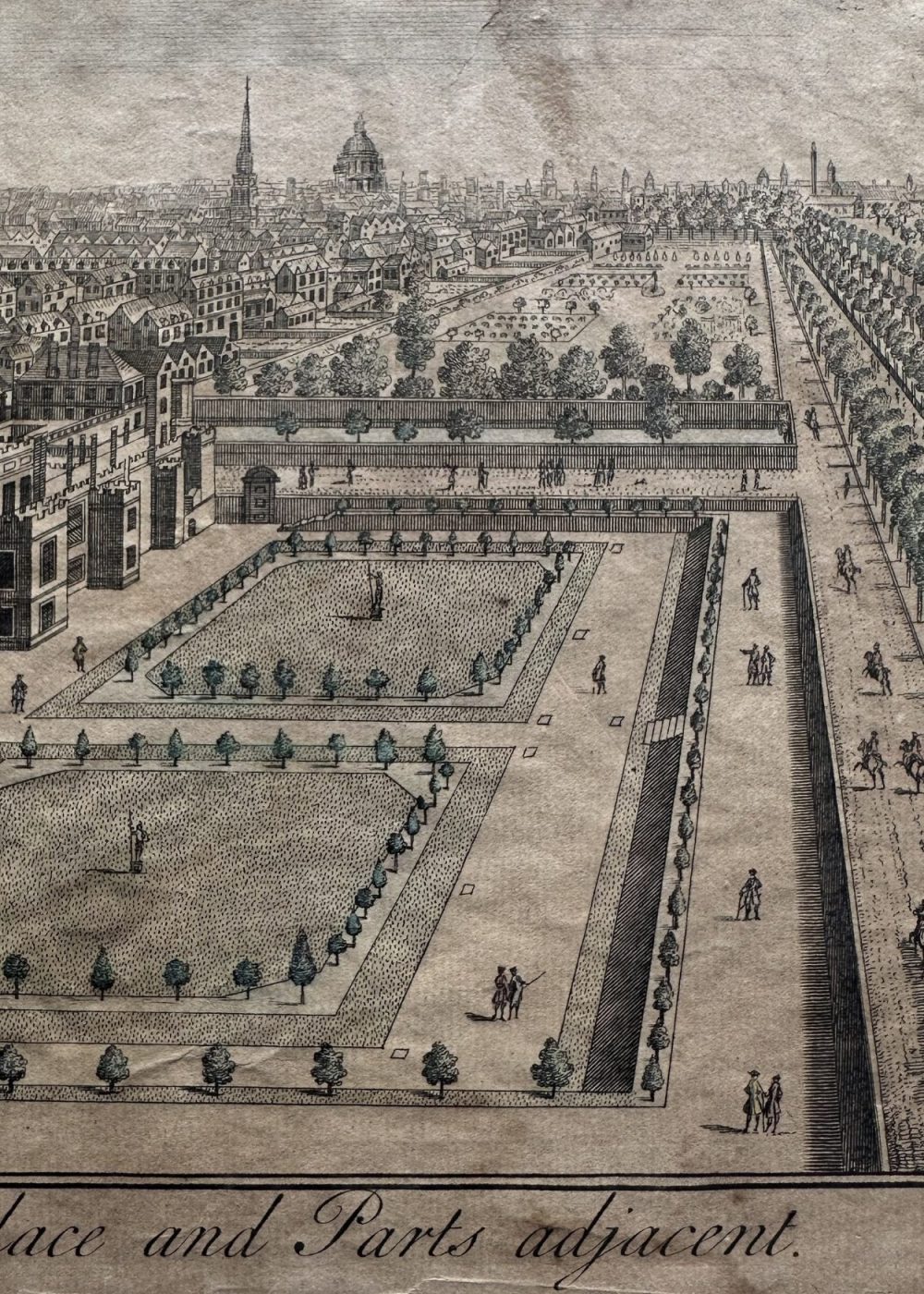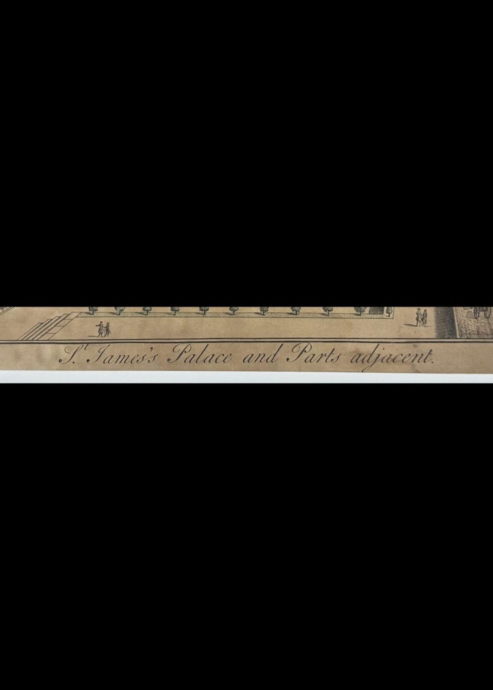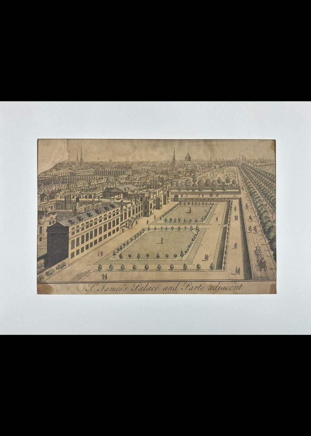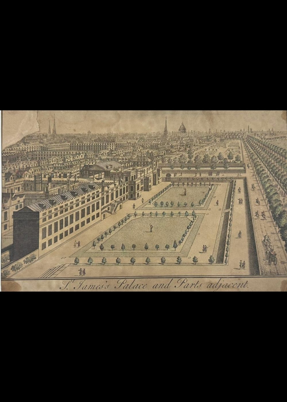 This antique print presents a panoramic bird’s-eye view of St. James’s Palace in London, with its formal gardens and the surrounding urban landscape. The palace courtyard is depicted with symmetrical pathways, fountains, and figures strolling, while the broader cityscape reveals an intricate grid of rooftops, churches, and distant landmarks like St. Paul’s Cathedral. To the right, a tree-lined avenue bustles with carriages and pedestrians. The caption reads: “St. James’s Palace and Parts adjacent.”