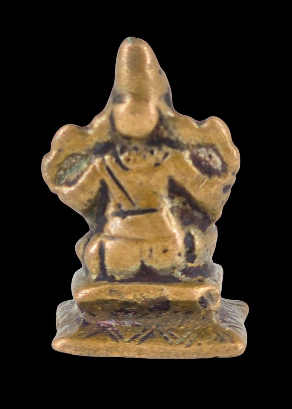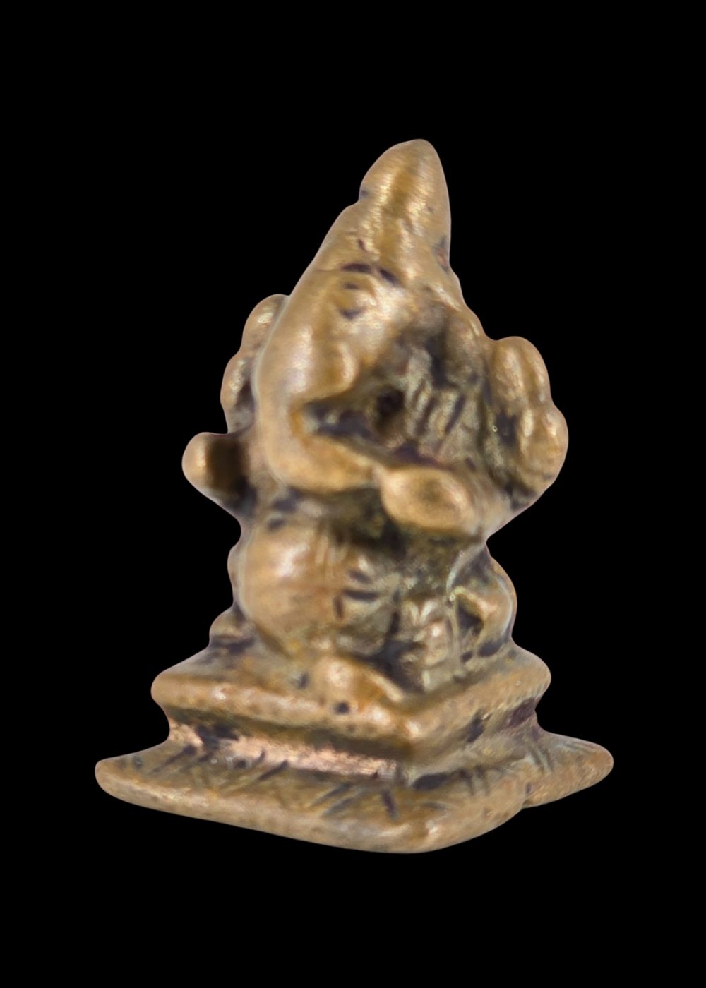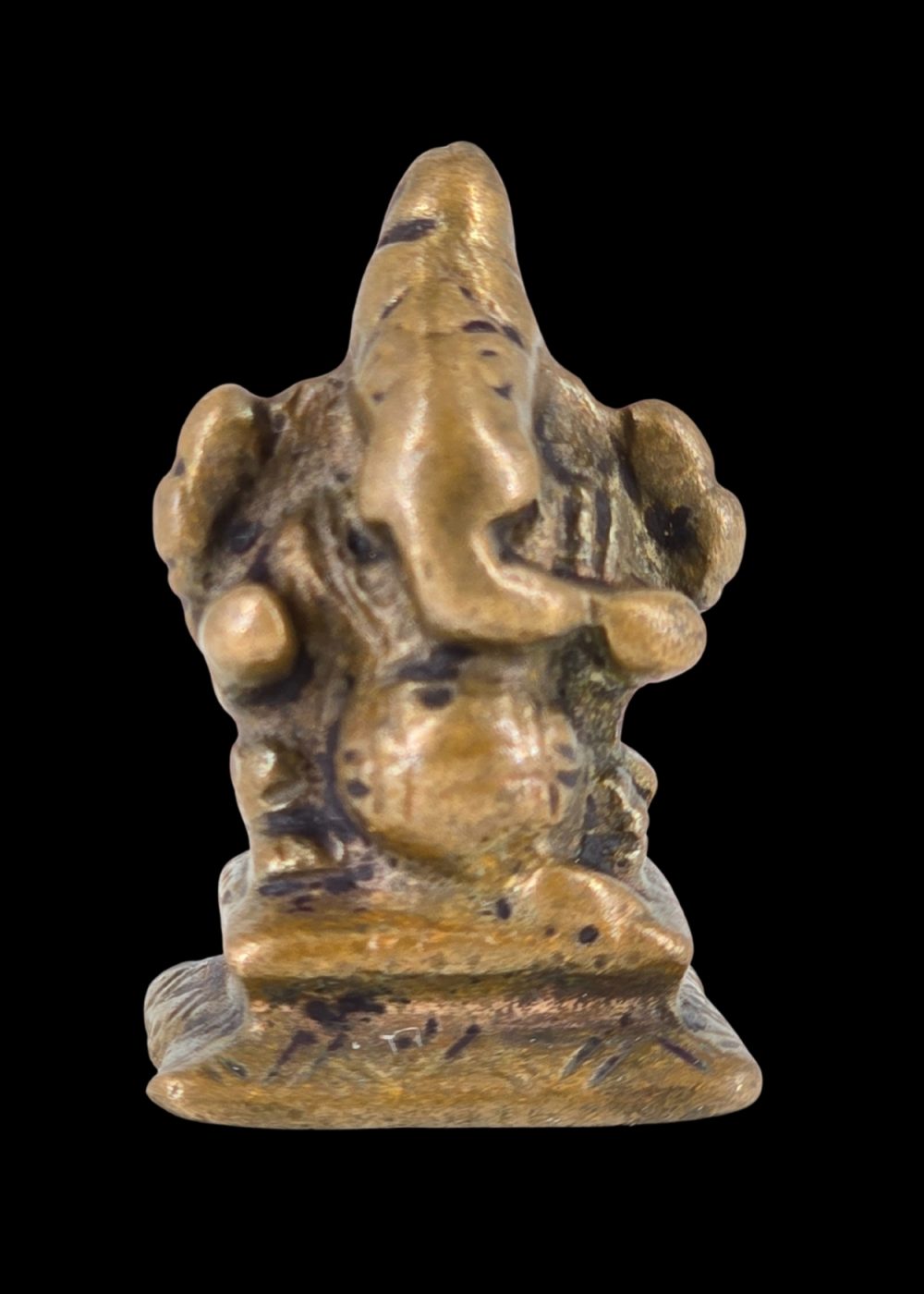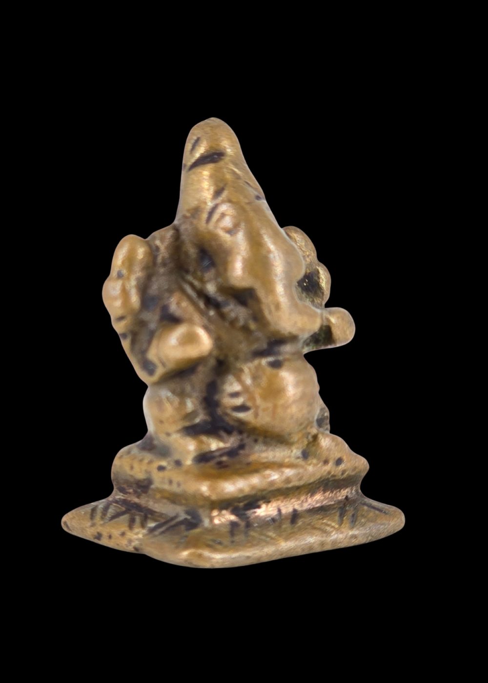 This is a small brass idol depicting Lord Ganesha, the Hindu deity of wisdom and success, with characteristic trunk and seated posture. The idol features simple, traditional detailing and a charming vintage patina, making it ideal for devotional use or as part of a collectible miniature statue set.