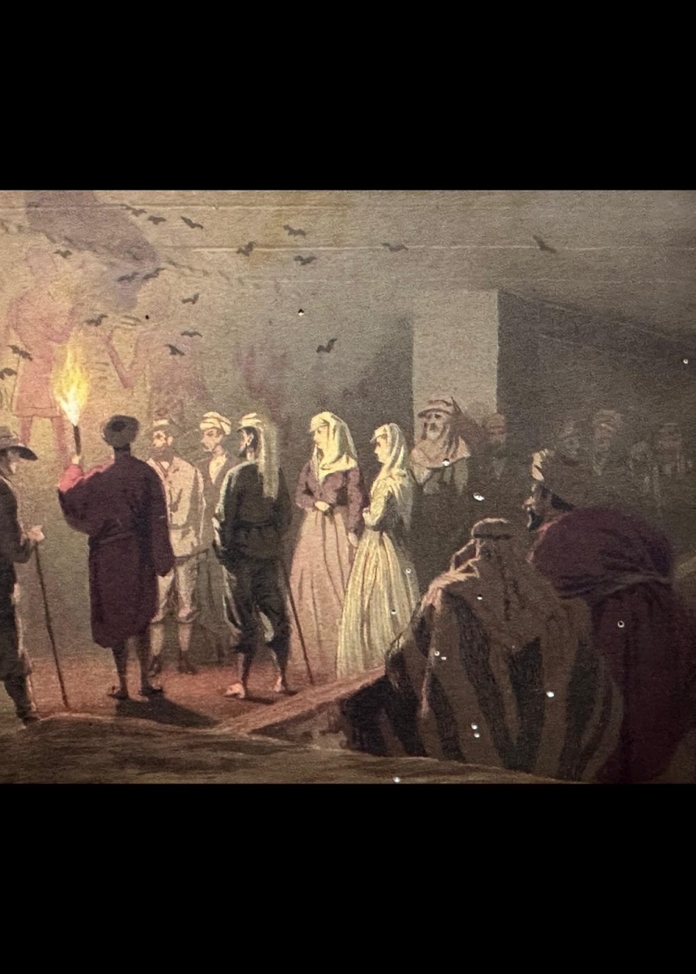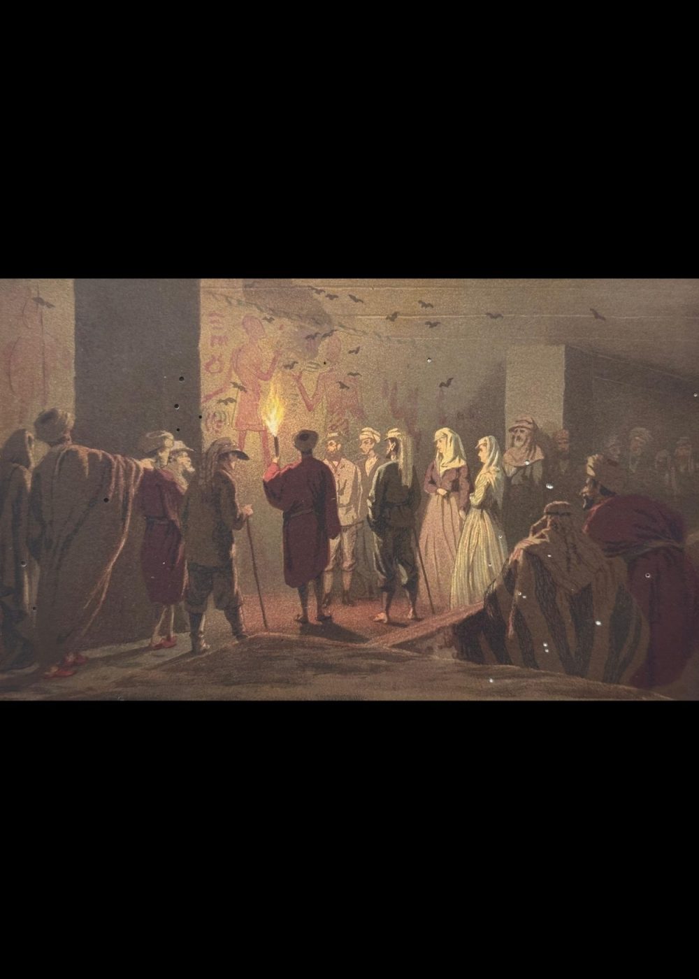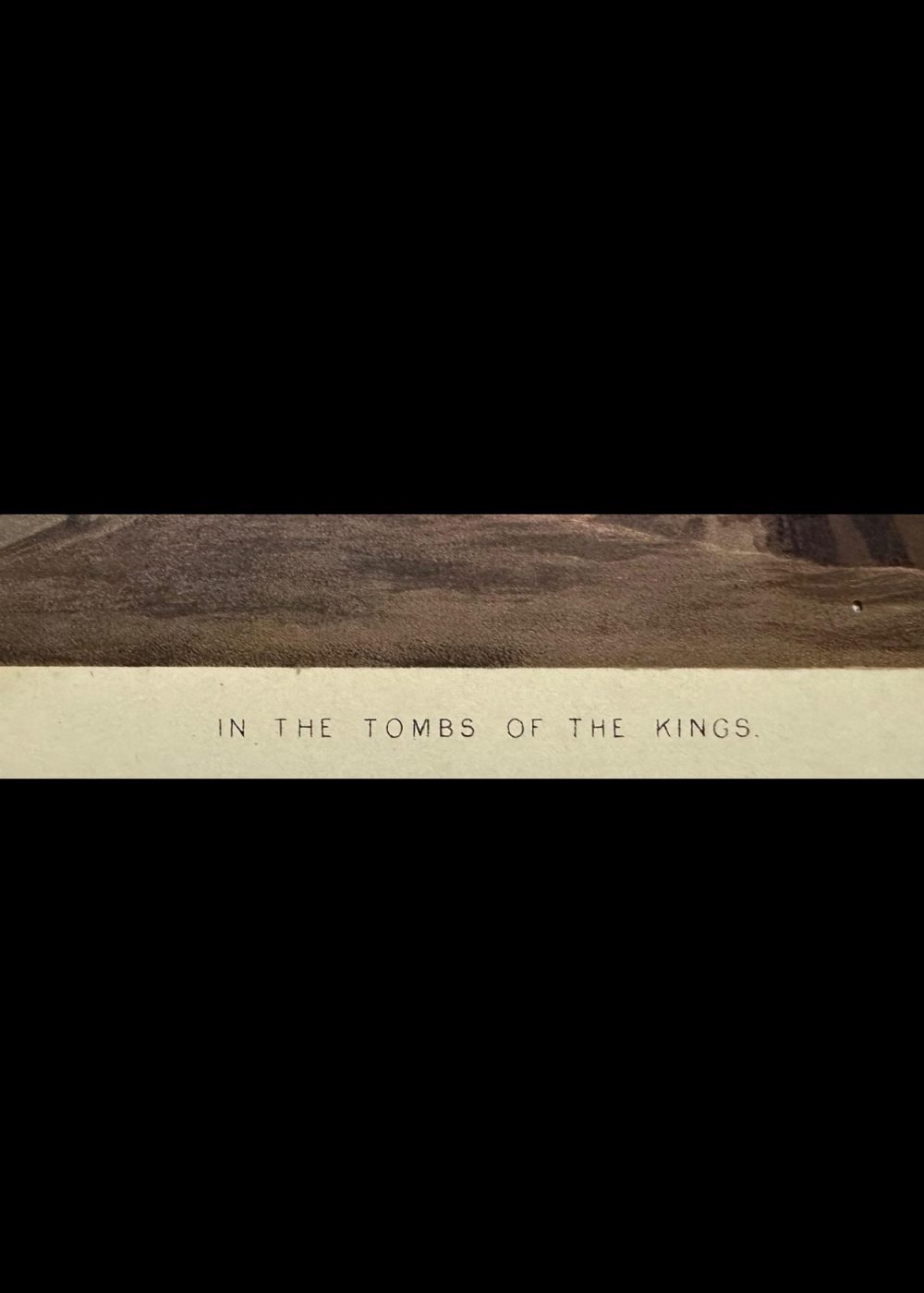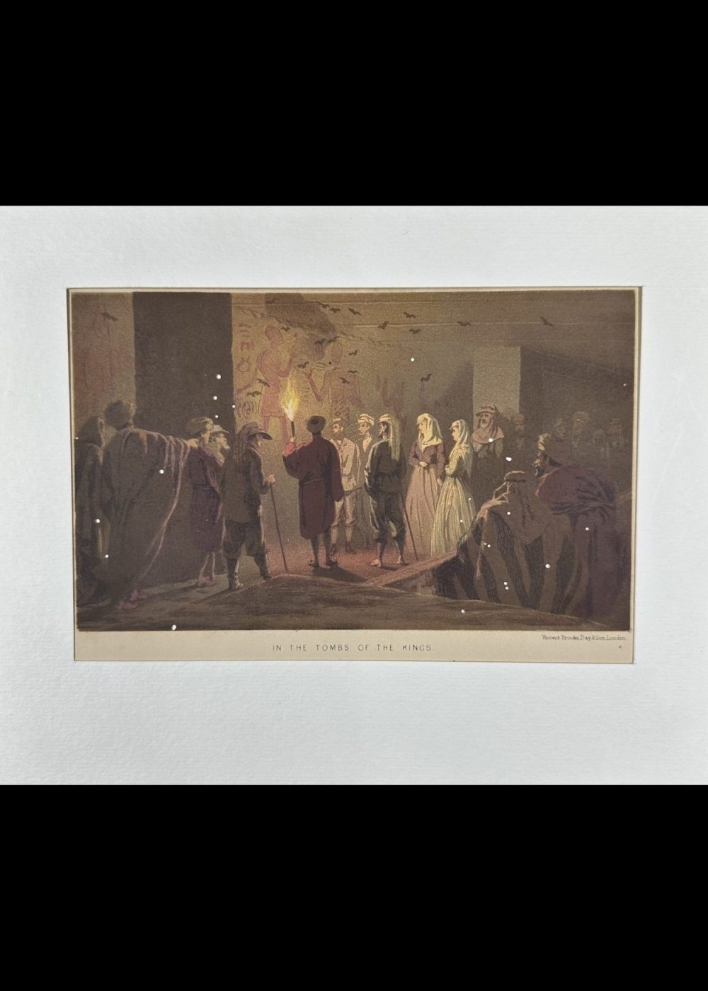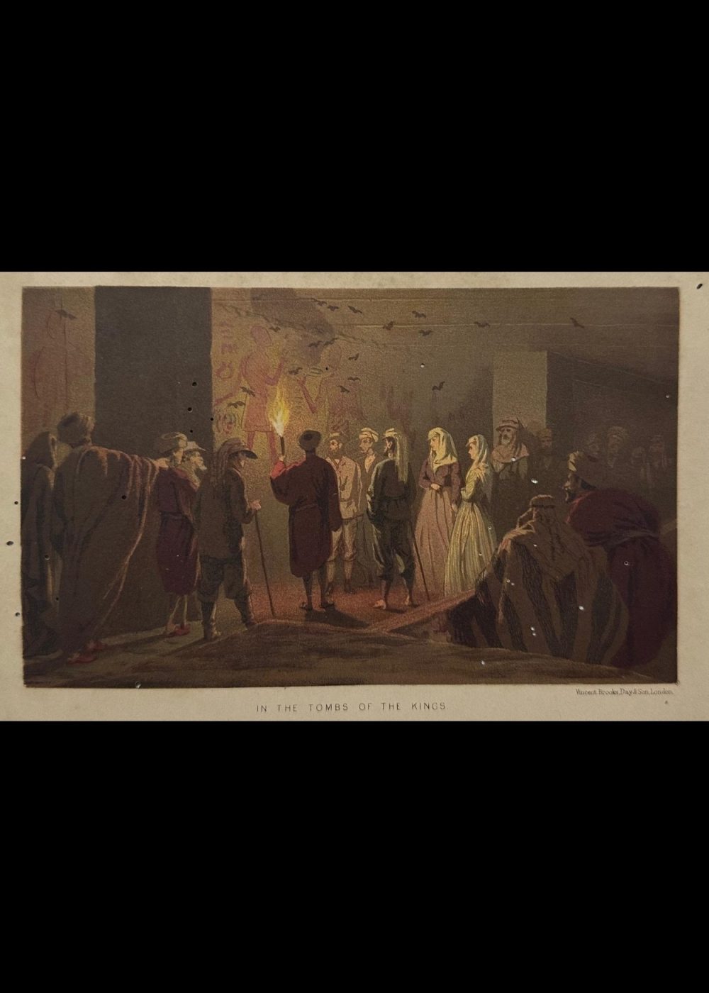 This evocative 19th-century illustration shows a group of travelers exploring the ancient Egyptian “Tombs of the Kings” by torchlight. The scene is dramatically lit, highlighting the vivid wall paintings and the awe of the visitors as they gaze at the pharaonic art and architecture. Published by Blackie & Son, the artwork captures the fascination of the Victorian era with Egyptology and the mystery of ancient civilizations.