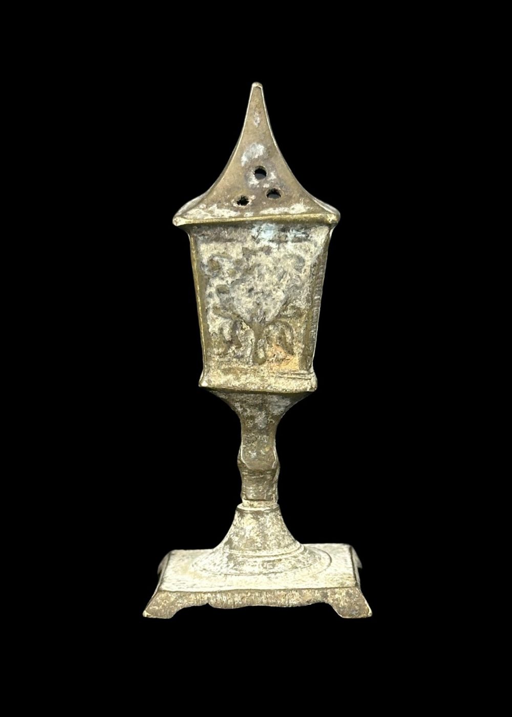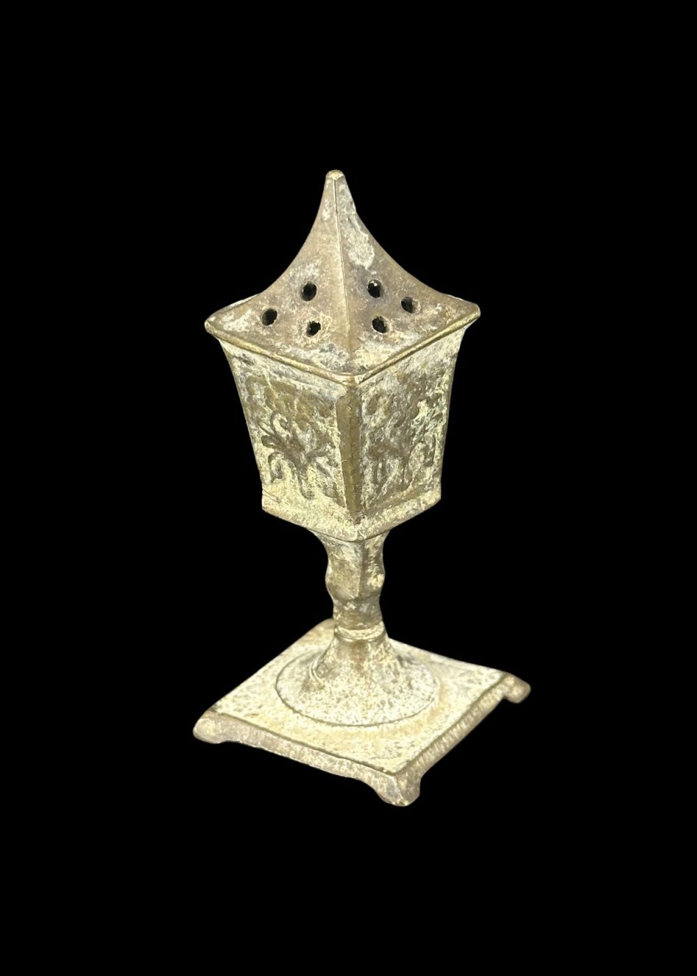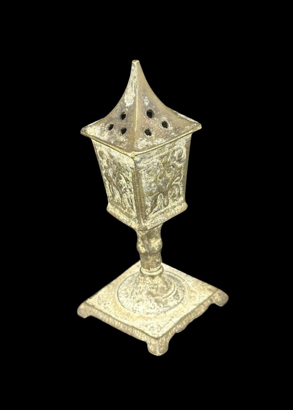 This is a traditional bronze agarbatti (incense stick) stand, crafted with a tall pedestal base and a pointed, ventilated holder to support and contain burning incense. The perforations at the top allow the fragrant smoke to escape, while the sturdy base ensures stability during use. The aged patina and simple design reflect its historical and cultural utility in spiritual and domestic rituals.