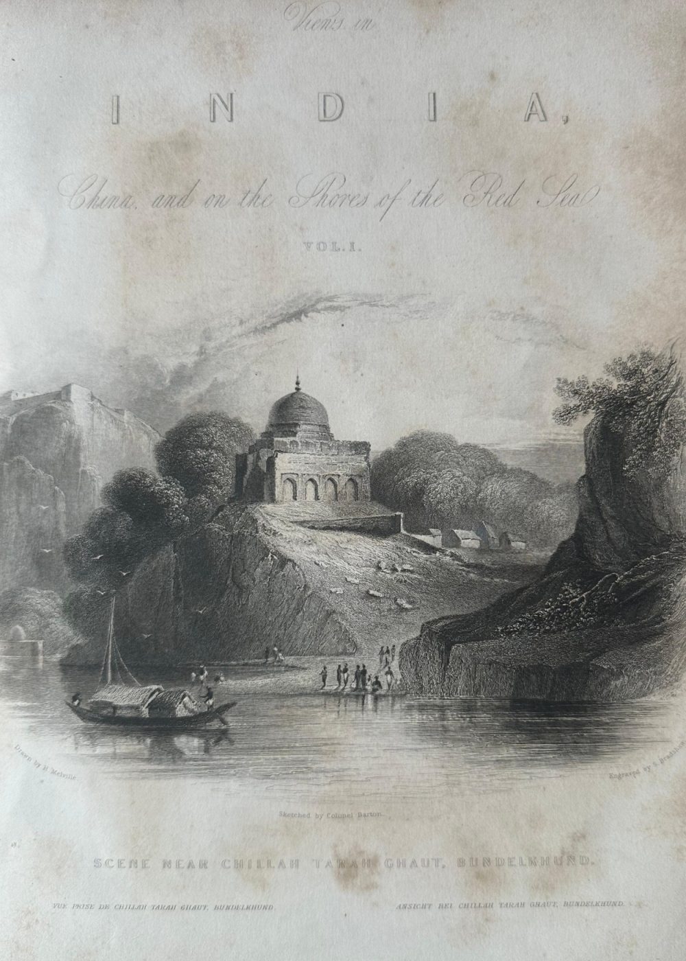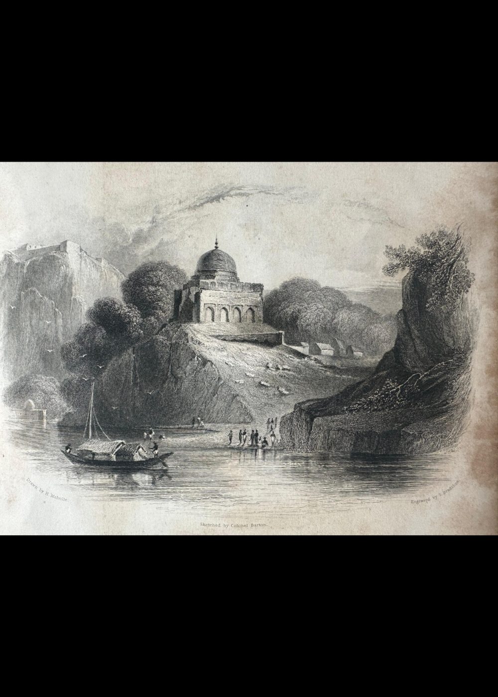 This engraving, titled “Scene Near Chillah Tama Ghaut, Bundelkhand,” is part of the book Views in India, China, and on the Shores of the Red Sea. The image showcases a tranquil riverside scene in Bundelkhand, India, near the Chillah Tama Ghaut. A boat floats on the river, and people are seen engaging in various activities along the shore, while the architecture of the region’s structures and the surrounding rocky landscape create a striking backdrop.The piece was sketched by Colonel Barton, engraved by S. Brandshawn, and made by H. Melville. The detailed work provides a vivid snapshot of the area in the 19th century, capturing both the natural and human elements of life near the river in Bundelkhand. The engraving is part of a collection that explores the diverse landscapes and scenes of India.