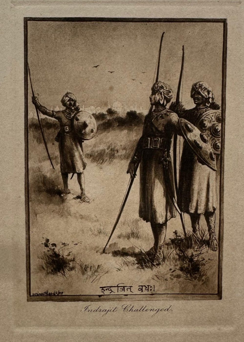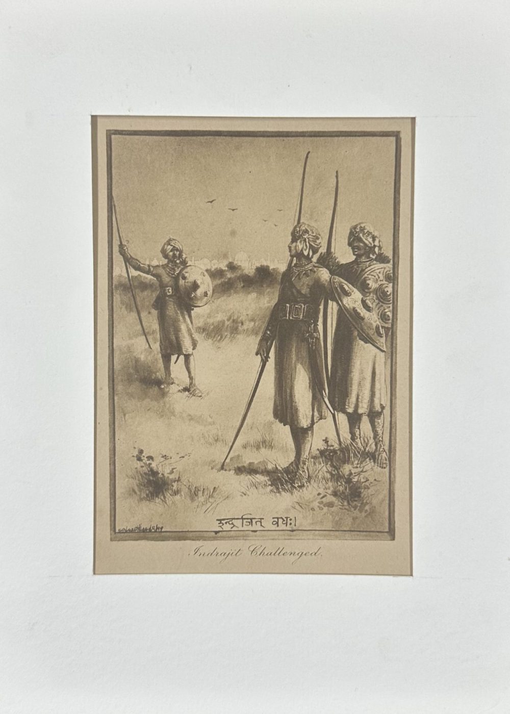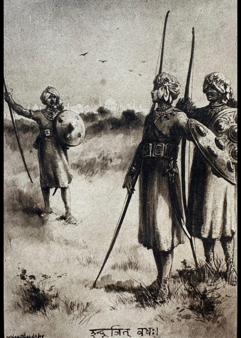 This vintage-toned illustration showcases three valorous warriors clad in armor, gripping spears and shields with resolute expressions. The central figure gestures ahead, possibly leading a charge or scouting danger, evoking leadership and strategy. Set against an open field backdrop, the artwork radiates a sense of historic pride and martial honor. The title—“Indrajit Chhatrapati”—suggests a tribute to a legendary or symbolic ruler, with the name “Laxmanpai” marking the artist’s signature.