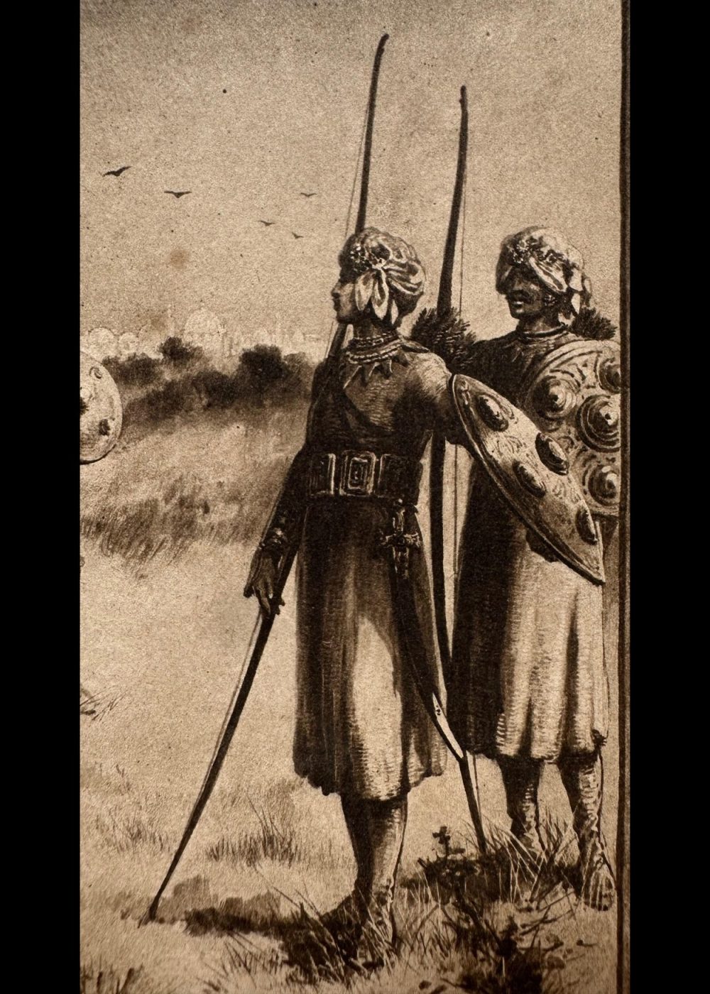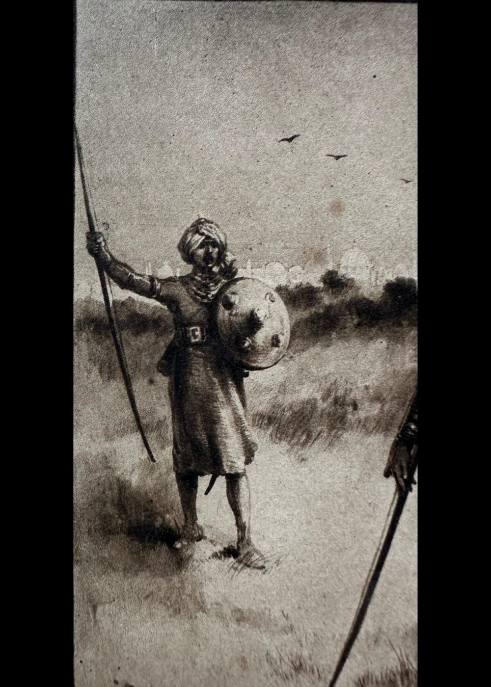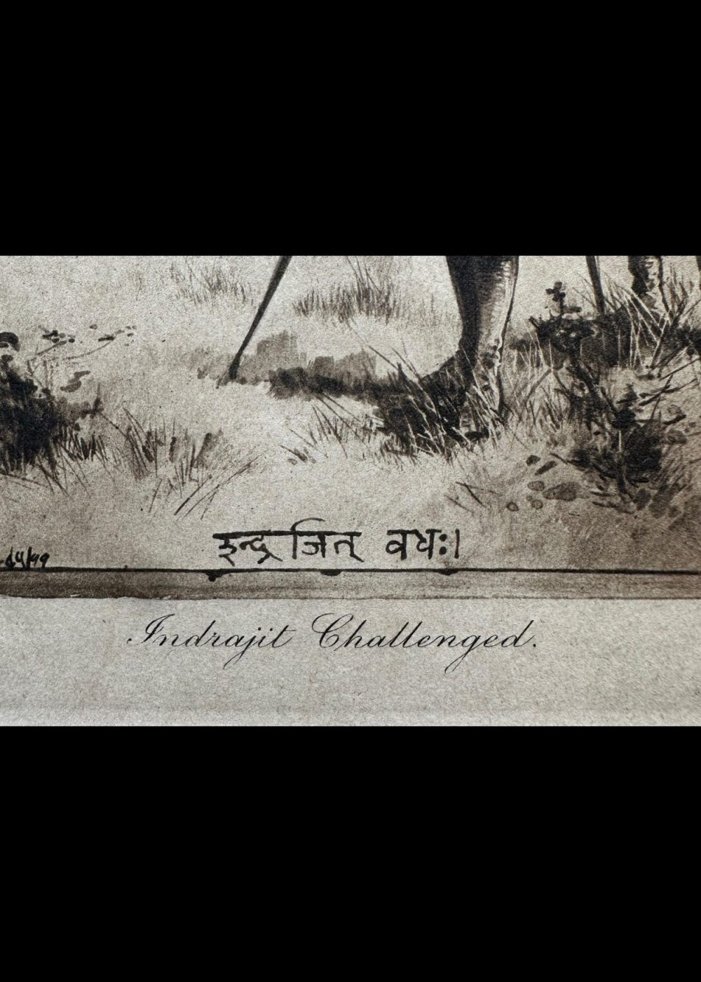 This vintage-toned illustration showcases three valorous warriors clad in armor, gripping spears and shields with resolute expressions. The central figure gestures ahead, possibly leading a charge or scouting danger, evoking leadership and strategy. Set against an open field backdrop, the artwork radiates a sense of historic pride and martial honor. The title—“Indrajit Chhatrapati”—suggests a tribute to a legendary or symbolic ruler, with the name “Laxmanpai” marking the artist’s signature.