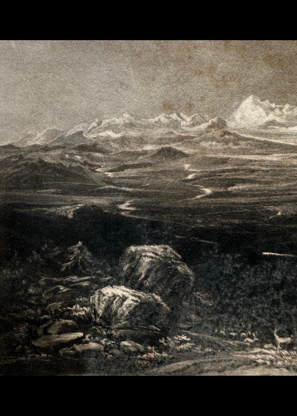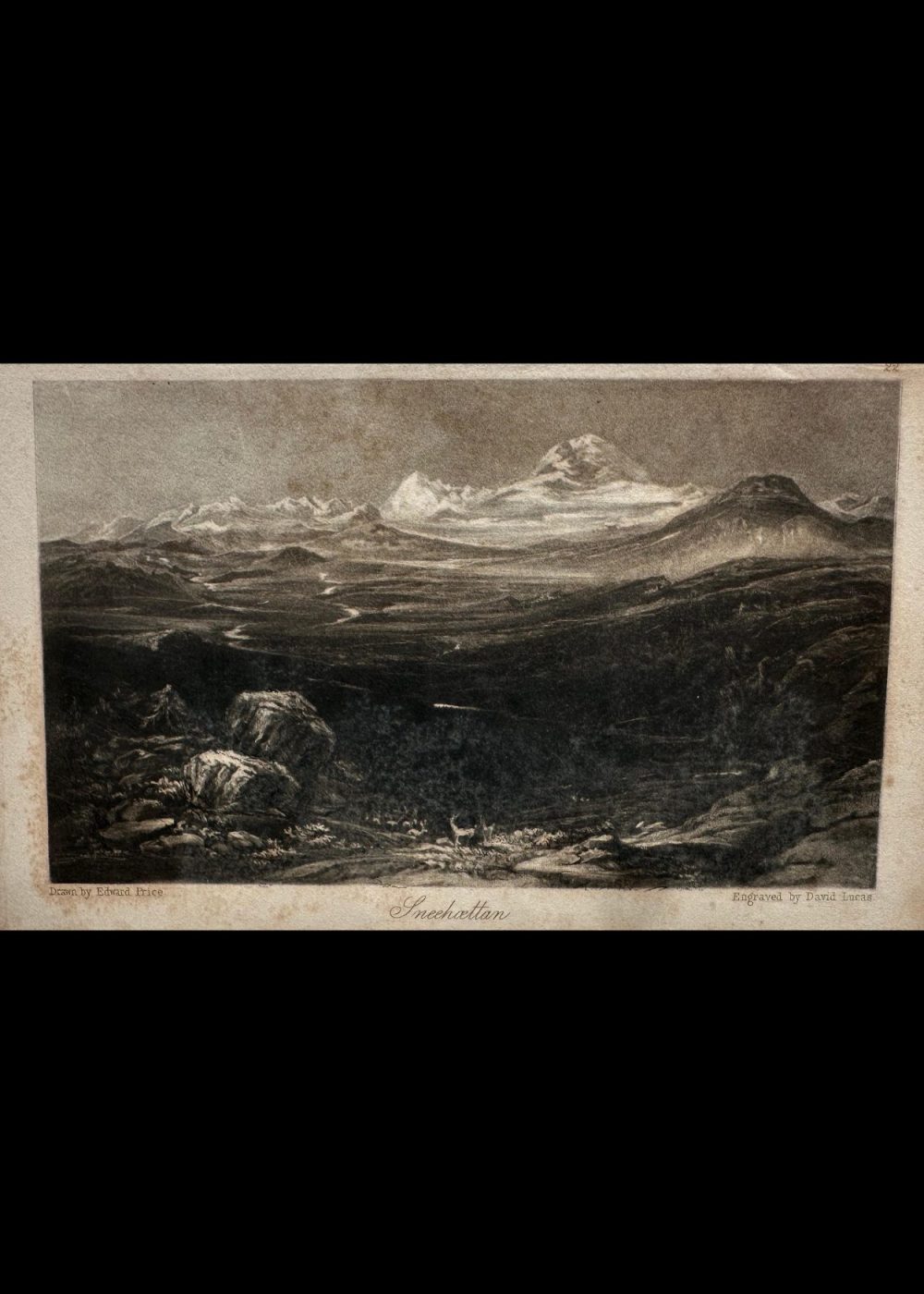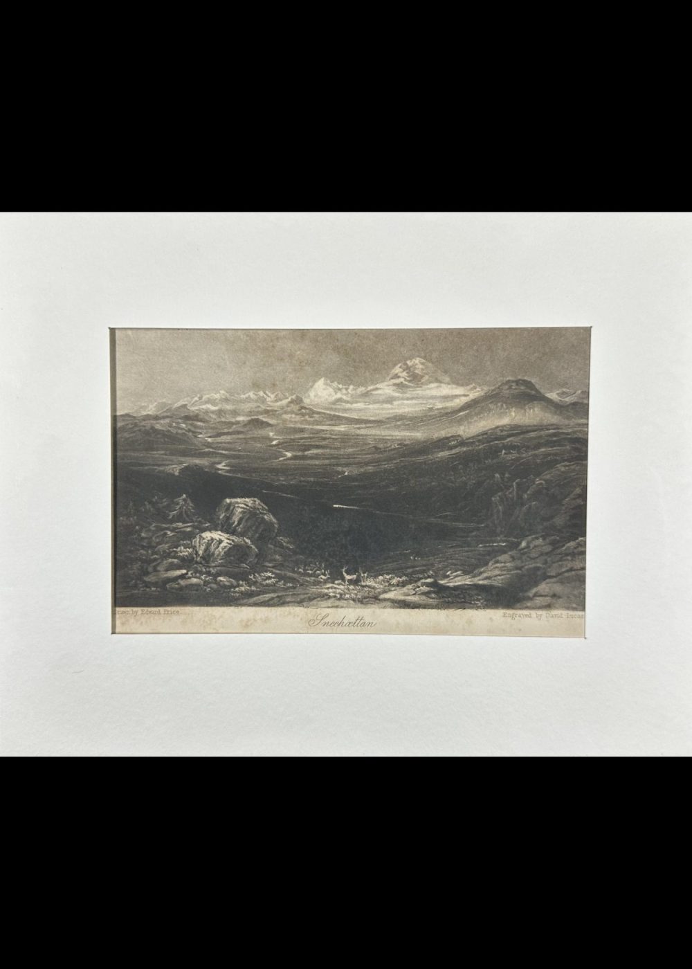 This monochrome engraving presents a sweeping view of a mountainous landscape titled Snachatlan. Snow-capped peaks dominate the horizon, while the foreground features rugged terrain with scattered boulders and sparse vegetation. The intricate detailing and tonal depth evoke the sublime beauty of remote wilderness, characteristic of Romantic-era landscape art. The composition emphasizes nature’s grandeur and isolation through masterful engraving technique.