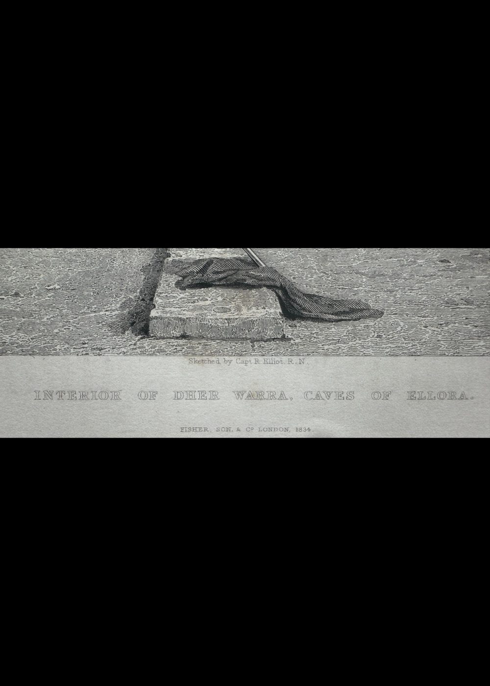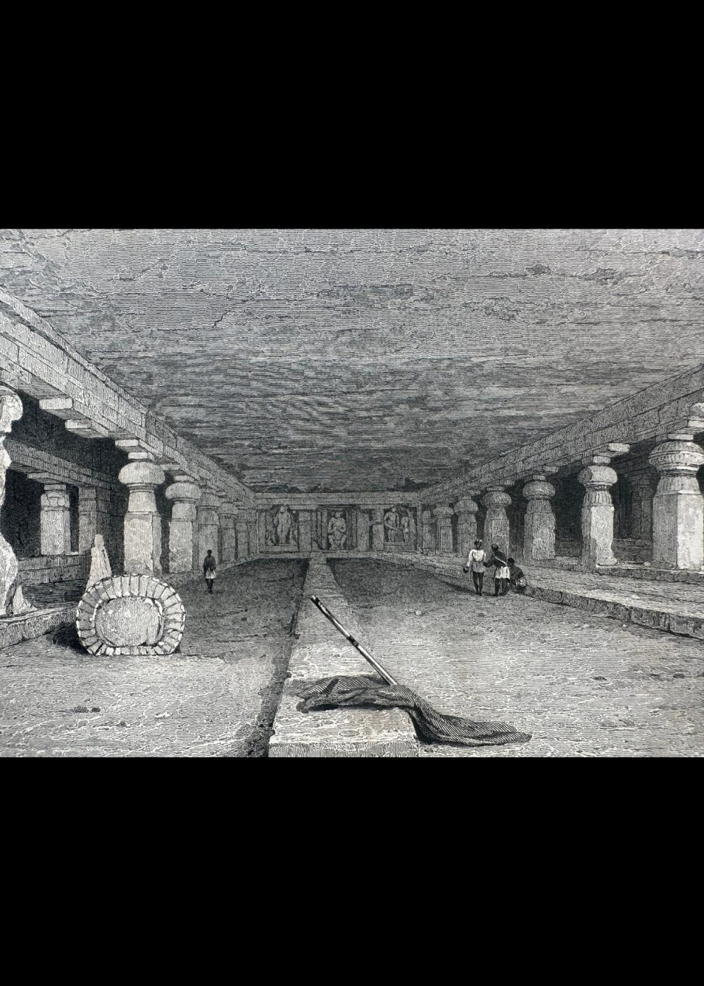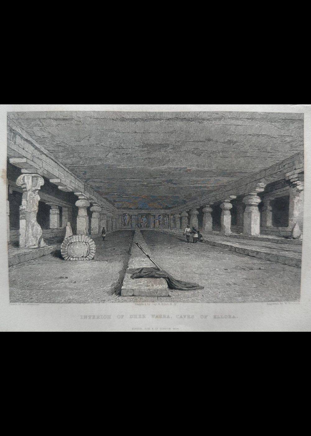 This engraving depicts the interior of the Deer Wara caves at Ellora, India, showcasing an expansive hall with towering columns. The image captures the grandeur of the cave’s architecture and the quiet, historical atmosphere, as a few figures walk and rest within the space. The engraving was sketched by Captain R. Elliot R.N., with the artwork created by G. Cattermole and engraved by W. Woolnoth. The piece is part of the “India China” book, published in 1834, offering a detailed visual account of significant sites in India. The craftsmanship highlights the detailed design of the cave’s interior, with the columned structure and ornate carvings that define the Ellora caves’ architectural beauty.