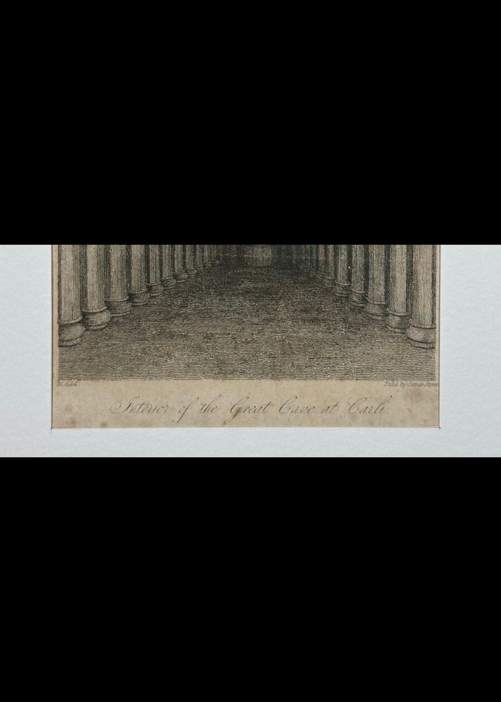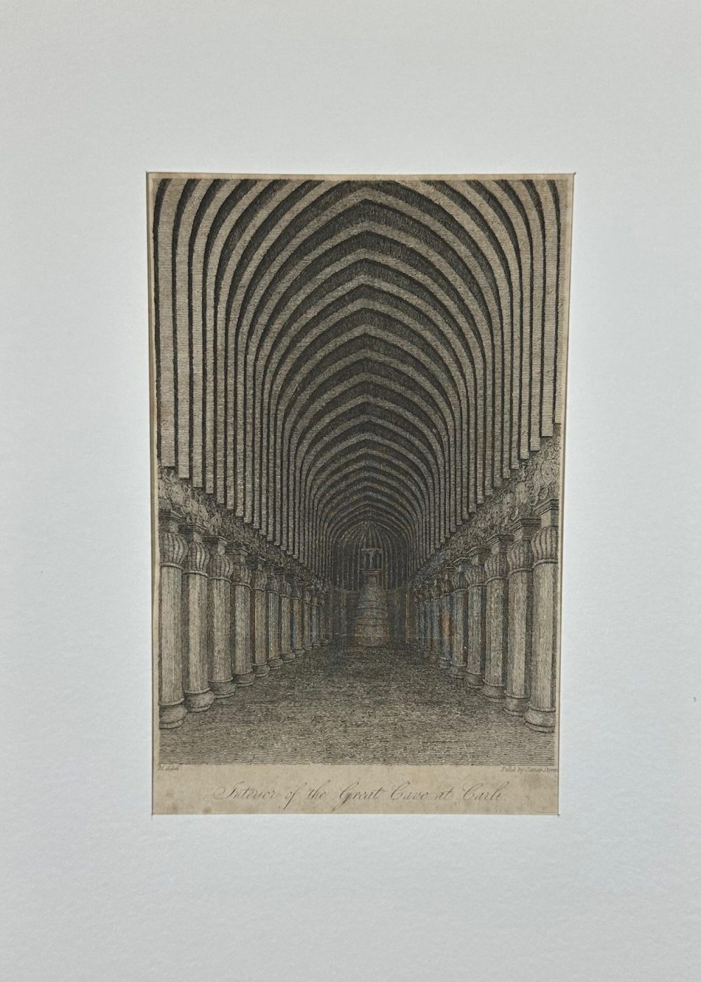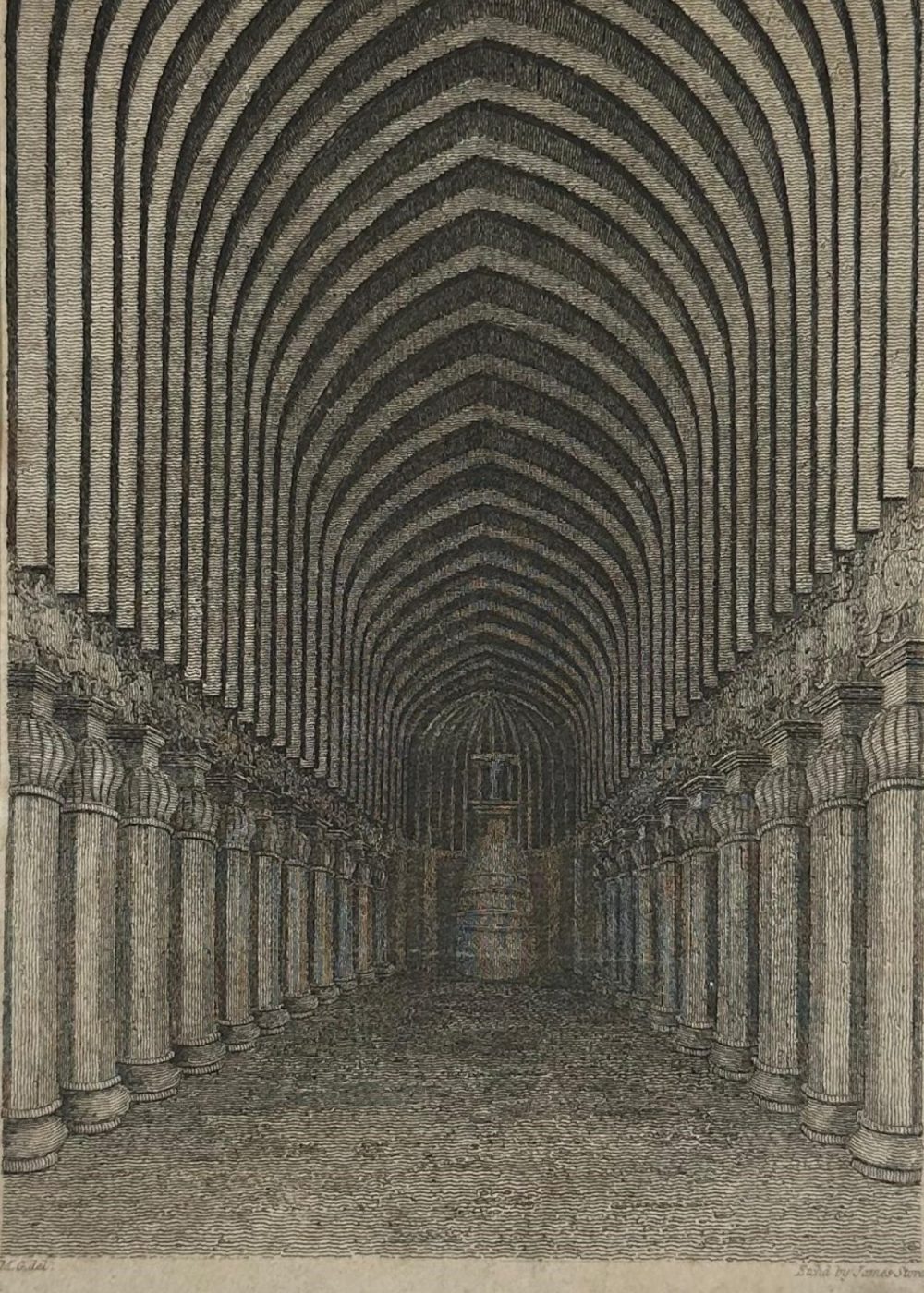 A vintage etching from 1813, issued in London & Edinburgh, titled “Interior of the Great Cave at Cuttack”, illustrating the magnificent architecture of a rock-cut cave temple. The scene presents a long, symmetrical hall lined with elaborately carved columns on both sides, leading the viewer’s eye toward a distant stupa or shrine at the far end. The vaulted ceiling features a series of parallel, curved arch-like patterns that enhance the sense of depth and perspective. The columns are richly detailed, each one with ornate capitals, and they support an intricate frieze above. The overall style is reminiscent of classical Indian cave temple architecture, likely Buddhist in origin, characterized by its stone-carved elegance and geometric harmony. The artwork is monochrome and executed in fine linework, suggesting it was created in the early 19th century, during the period of British interest in documenting Indian architecture and antiquities. The etching captures both the scale and sacred ambiance of the space with remarkable precision.