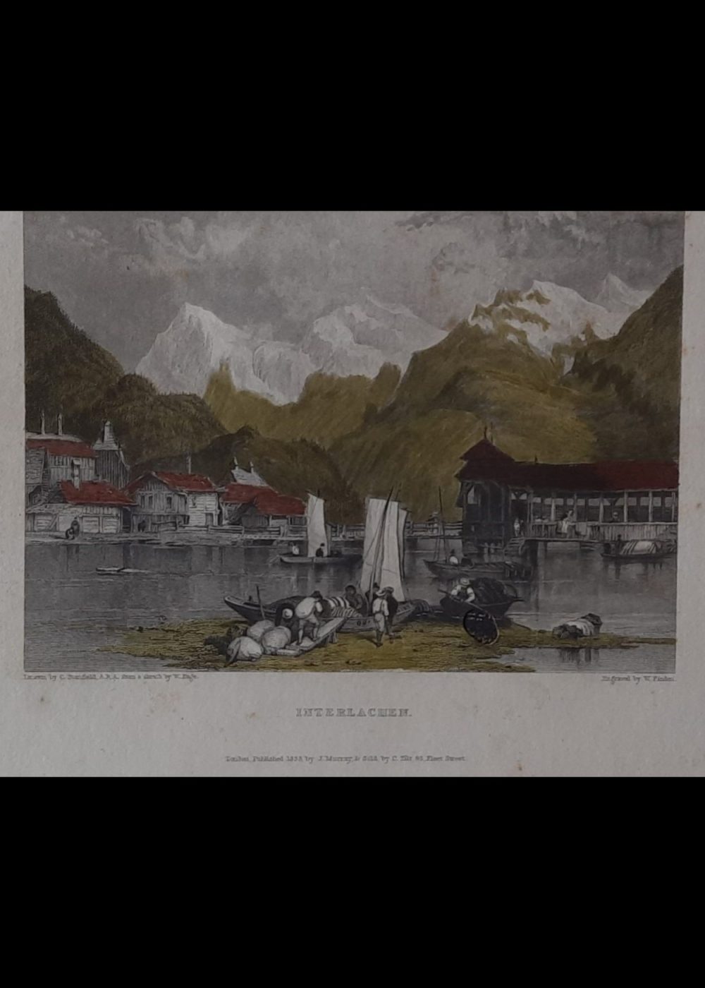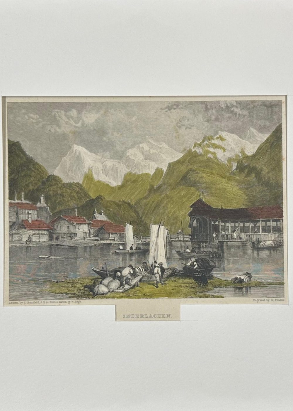 This hand-colored engraving titled Interlachen presents a scenic lakeside village nestled between forested hills and towering snow-capped Alpine peaks. In the foreground, figures prepare small sailboats along the shore, while quaint wooden buildings with red roofs line the tranquil water. Drawn by C. Stanfield from a sketch by W. Beattie and engraved by W. Finden, the print was published in 1833 by J. Murray. It captures the serene charm of Interlaken, a picturesque resort town in Switzerland known for its stunning natural beauty.