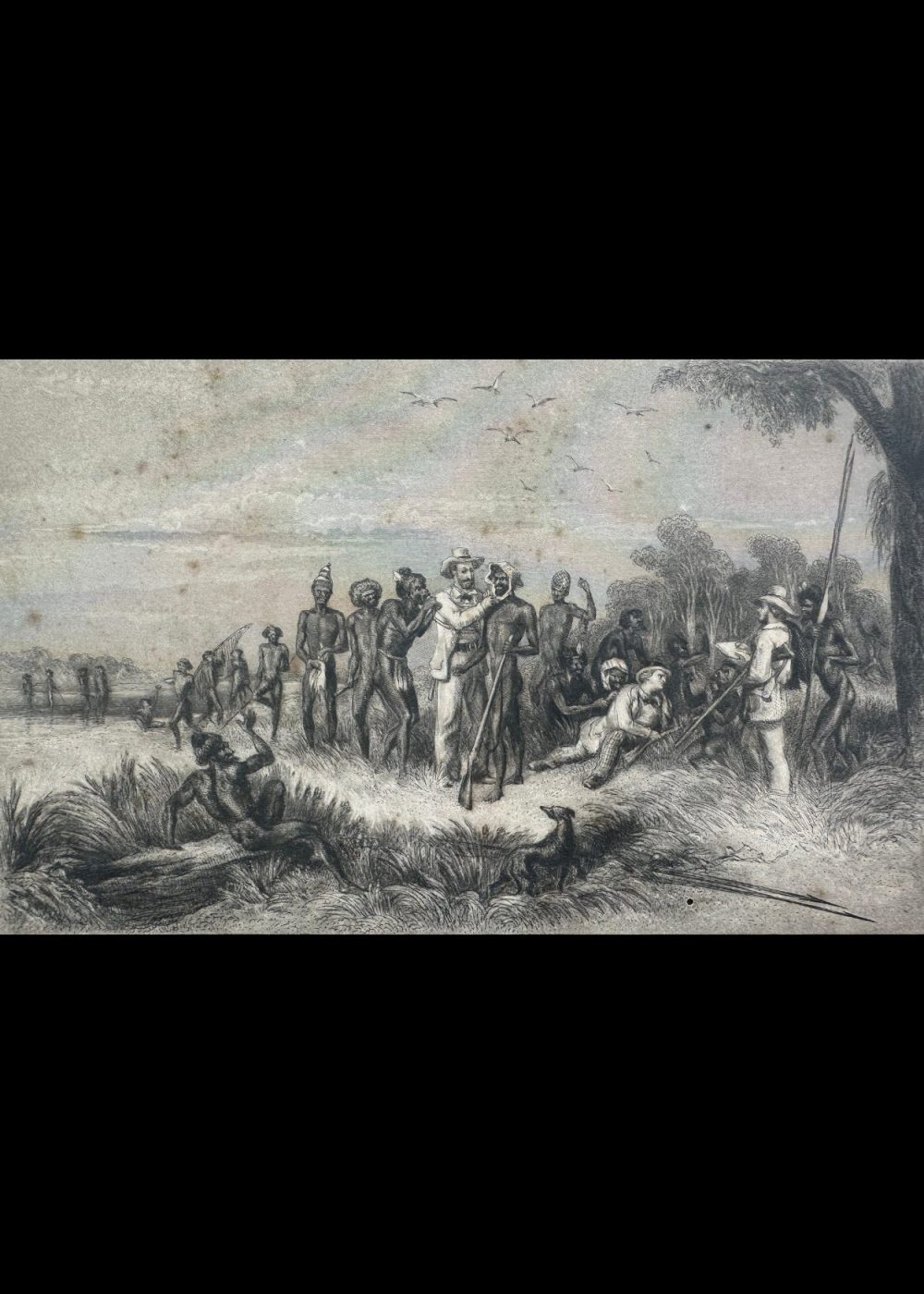 This historical illustration depicts a meeting between Indigenous people and European explorers along the Wickham River. Set in a grassy, tree-lined landscape, the scene shows both groups gathered in a circle—some seated, others standing—engaged in what appears to be a negotiation or exchange. The Indigenous figures carry spears and wear traditional attire, while the Europeans are dressed in formal colonial clothing and hats. A dog rests in the foreground, adding a domestic touch to the otherwise formal encounter. The image captures a moment of cross-cultural interaction, reflecting the complexities of colonial contact in 19th-century Australia.
