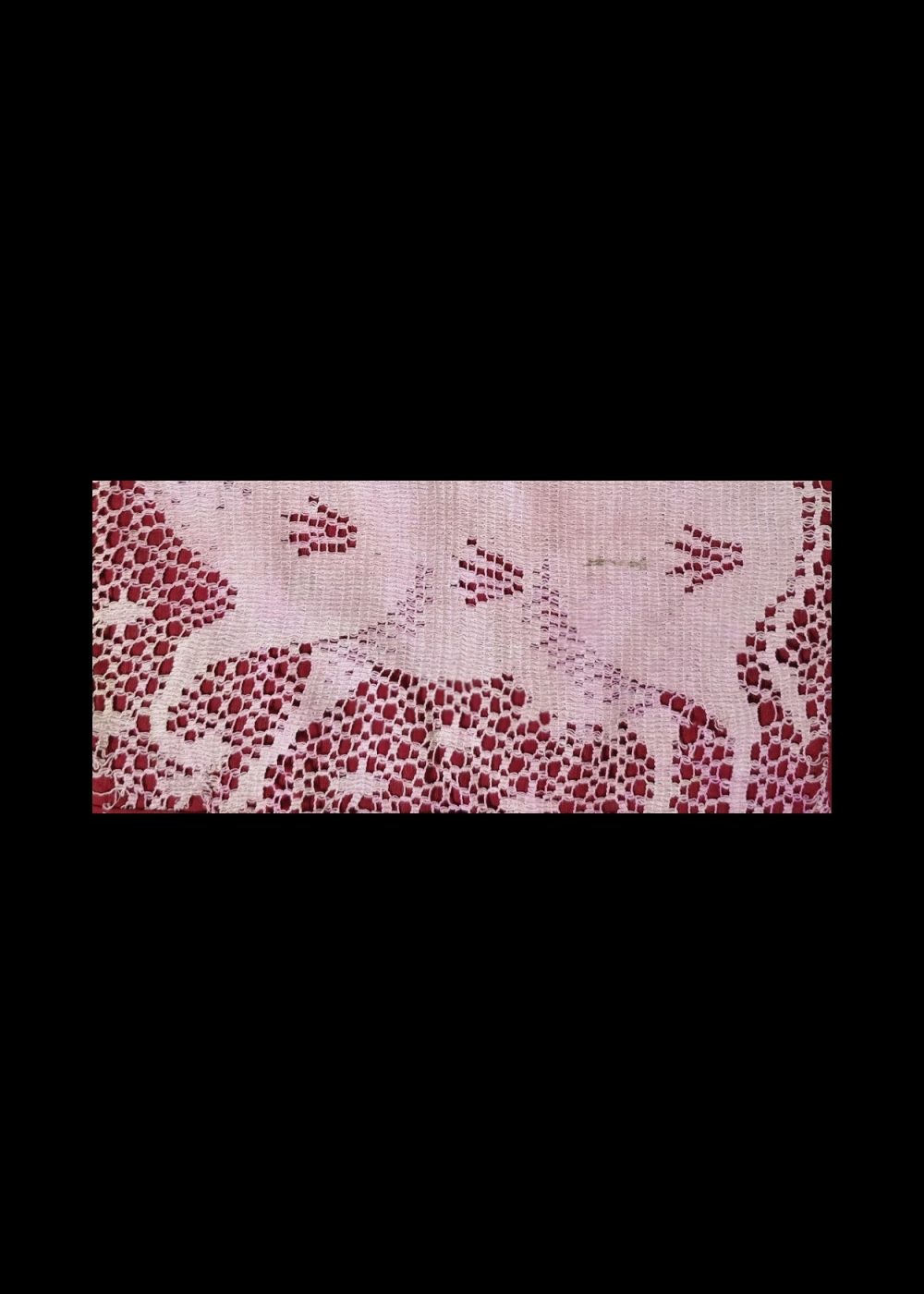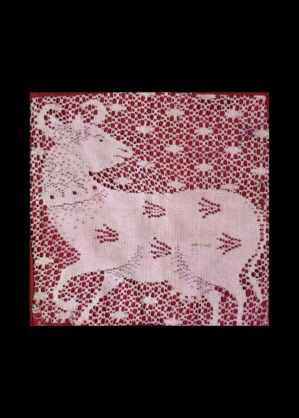 This Lace Pichwai of a Cow, originating from Jarmani, is a finely crafted textile art piece. The design features intricate lacework depicting a cow, a symbol of reverence and tradition. The delicate pink lace threads form the cow’s shape, with its detailed features gracefully rendered in an artistic pattern. The piece is framed with a rich red border, enhancing the lacework’s visual appeal. This art form beautifully merges the traditional Pichwai style with the elegance of lace, making it a unique and culturally significant creation from Jarmani.