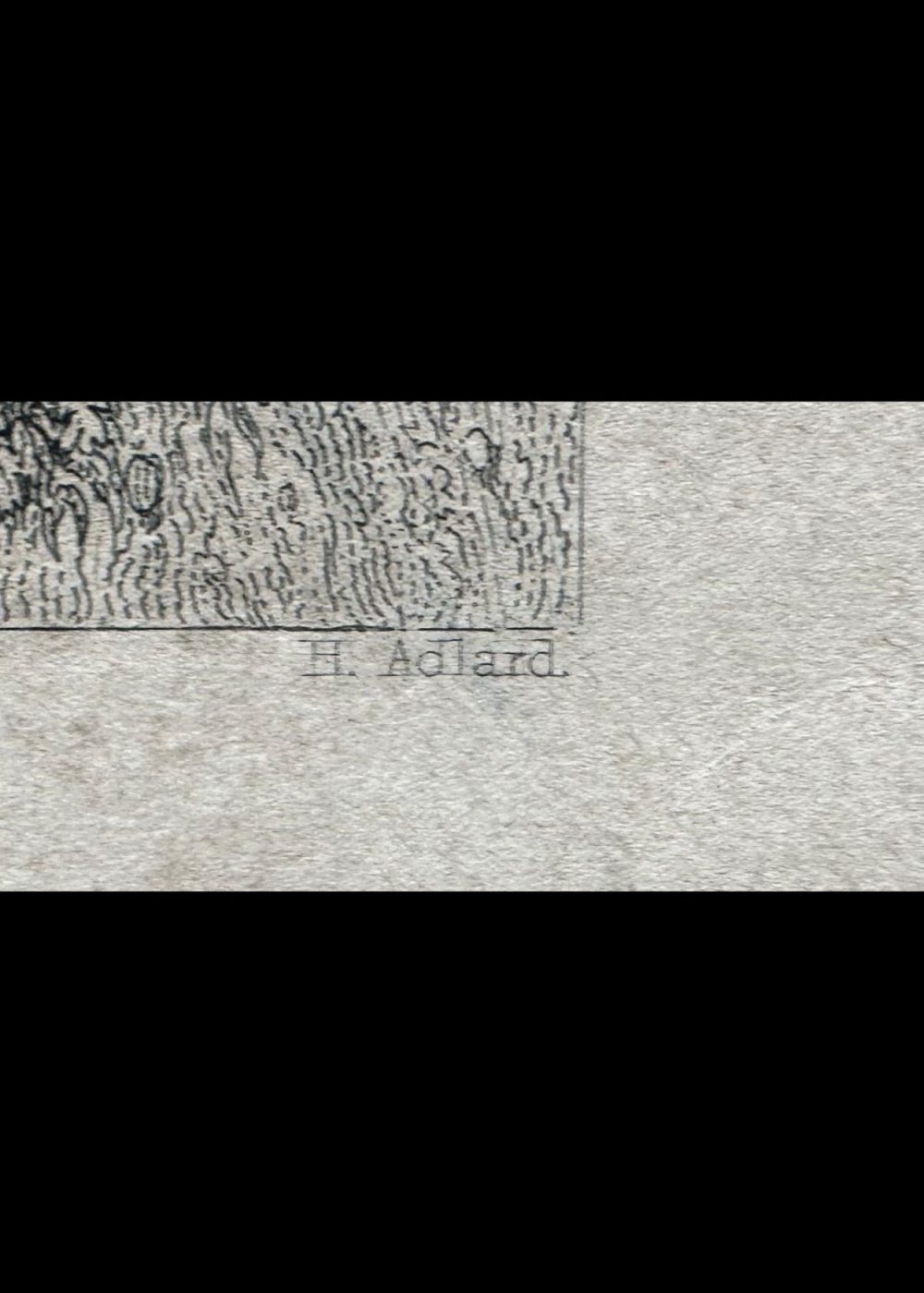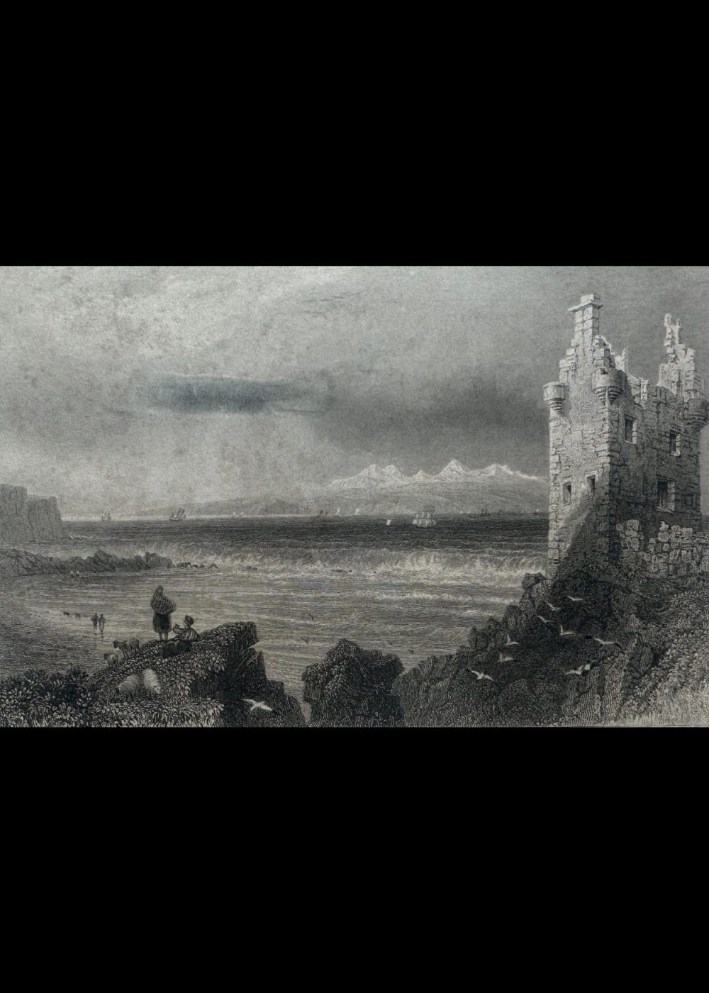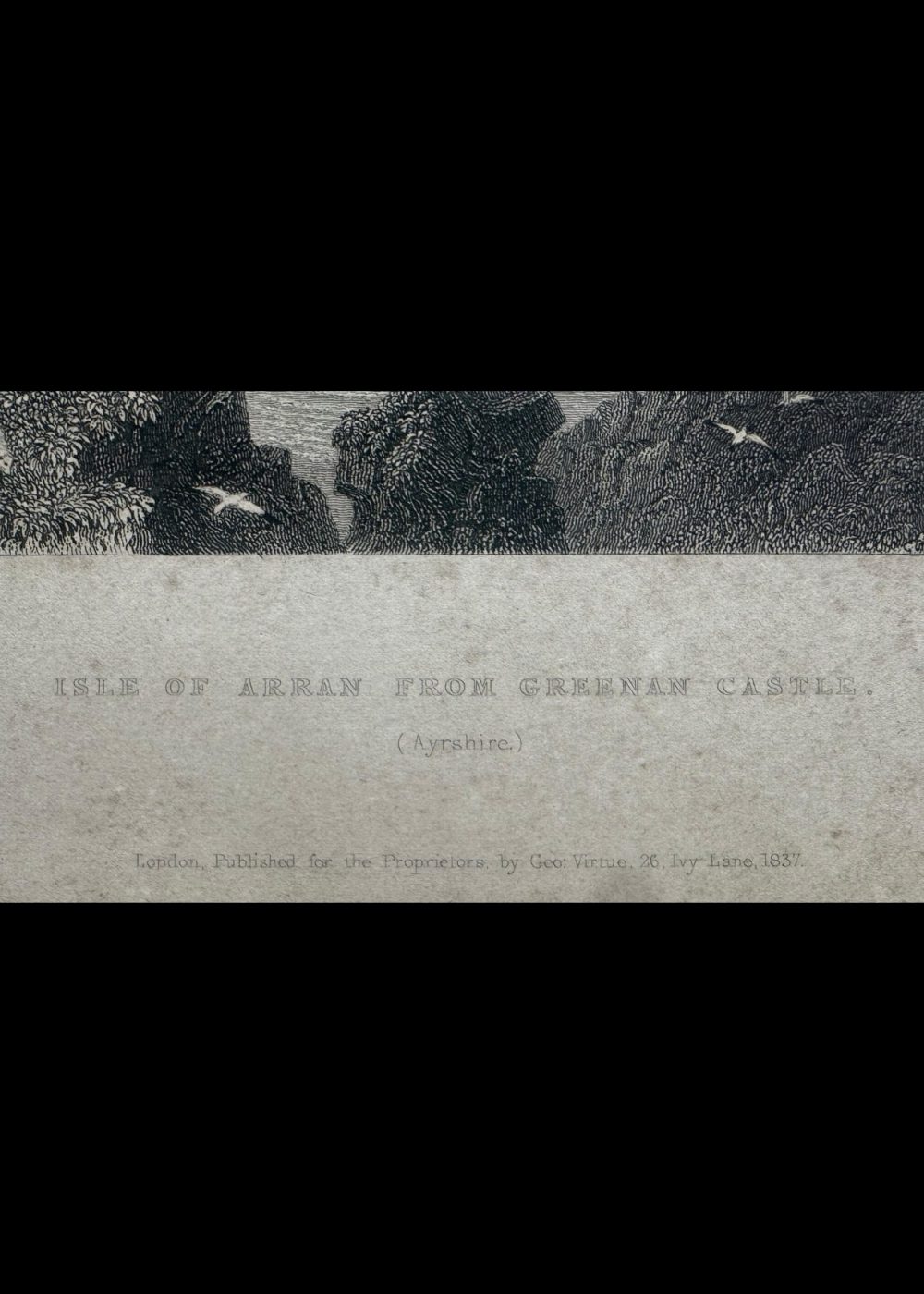 This striking engraving offers a coastal vista of the Isle of Arran, viewed from the rugged shoreline near Greenan Castle in Ayrshire, Scotland. Dominating the right of the composition is the partially ruined tower of Greenan Castle, its stark stone form perched dramatically above crashing waves. Across the sea, the majestic peaks of Arran rise in the distance, their jagged silhouettes etched against a brooding sky. In the foreground, figures in traditional attire—possibly shepherds or local travelers—observe the seascape, accompanied by a dog and surrounded by wild coastal vegetation. Ships under full sail and fishing boats navigate the choppy waters, highlighting the maritime lifeline of the region. Thomas Allom’s artistry imbues the scene with both grandeur and quiet human presence, while H. Adlard’s fine engraving captures the detail and texture of both land and sea. This image exemplifies the Romantic fascination with nature’s power, historic ruins, and the sublime beauty of the Scottish coast, as celebrated in George Virtue’s 19th-century topographical publications.