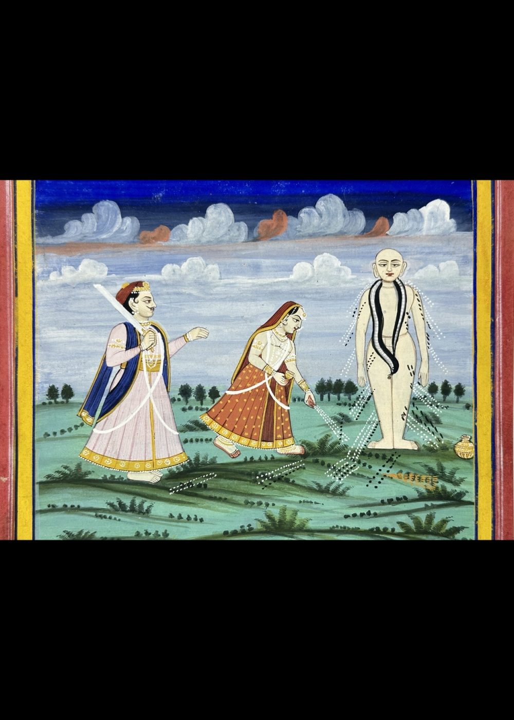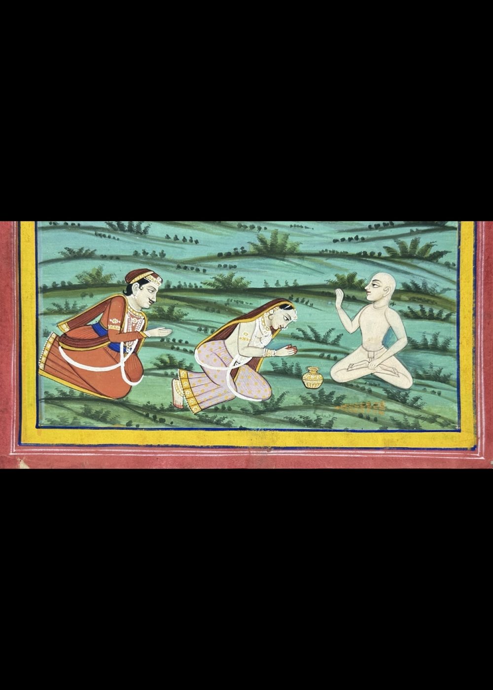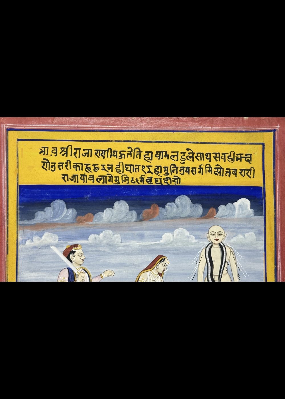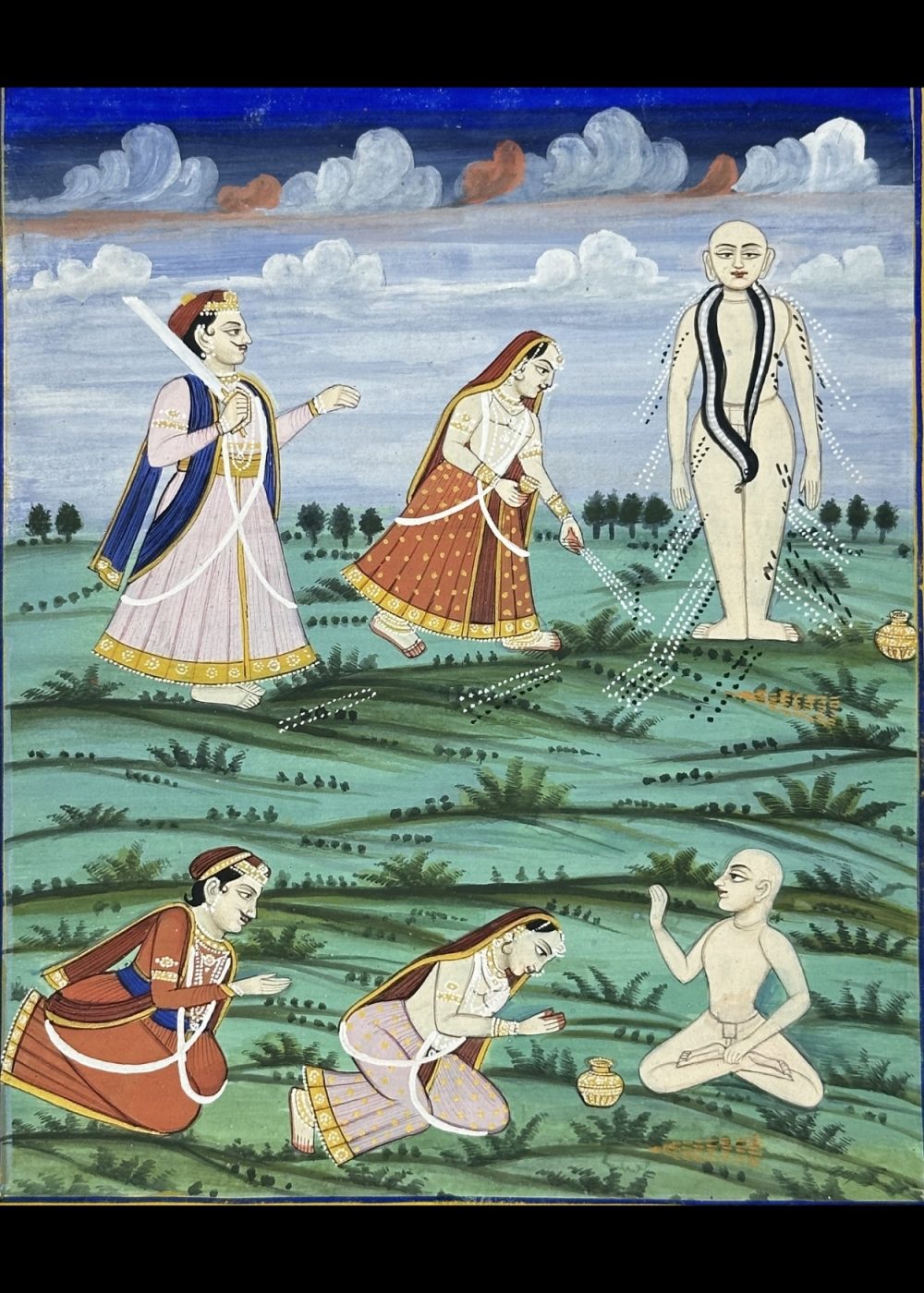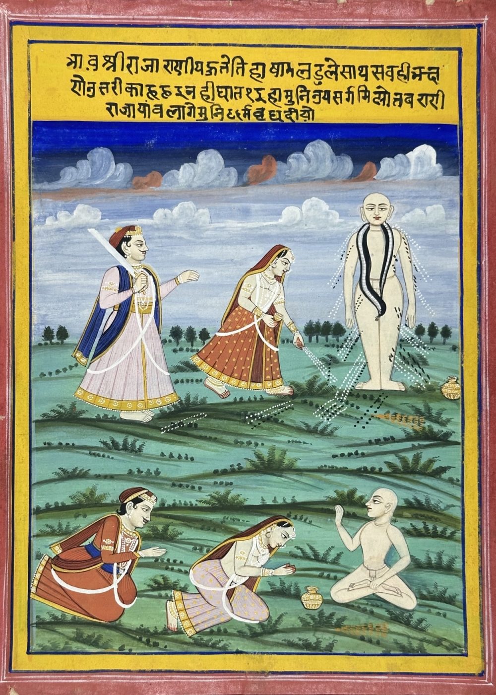 This detailed devotional painting illustrates a Jain monk, likely a revered Tirthankara or spiritual teacher, engaging in discourse or meditation, surrounded by devotees. The central figure stands in kayotsarga (meditative) posture, while another monk seated in the foreground symbolizes teaching and renunciation. Female devotees are shown in respectful gestures, possibly offering alms or engaged in ritual worship. The landscape, featuring soft hills and clouds, creates a calm spiritual setting. The inscription in Sanskrit or Prakrit at the top adds a sacred textual dimension, likely a verse praising the Tirthankara or expounding Jain dharma. This artwork reflects the rich iconography and spiritual focus of Jain devotional art from Western India.