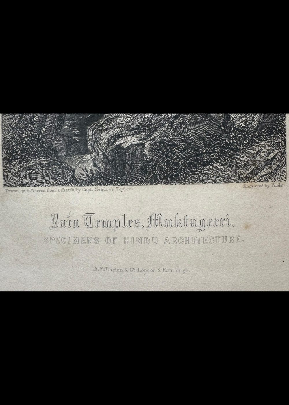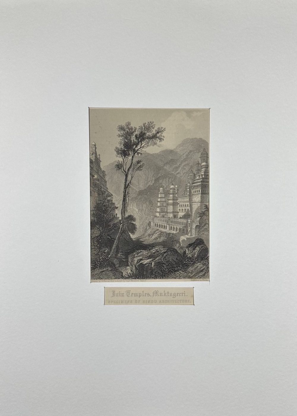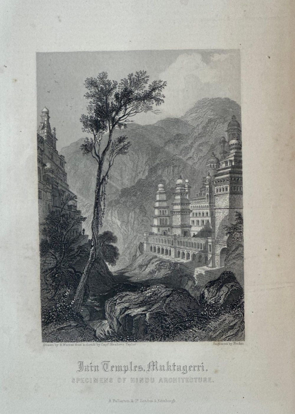 “THE FAITHS IN THE WORLD”. A dictionary of all religions and their religious sects. by The Rev. James Gardner. A finely executed 19th-century engraving illustrating Jain temples nestled in the landscape of Maktageri. With tiered spires and ornate domes, these sacred structures reflect distinctive Hindu architectural elements. A tall tree anchors the foreground while rugged hills frame the background, adding dramatic depth to the composition. Engraved by Finden, based on Captain Mackenzie’s sketch, and published by A. Fullarton & Co., the image celebrates architectural harmony between nature and spiritual devotion.
