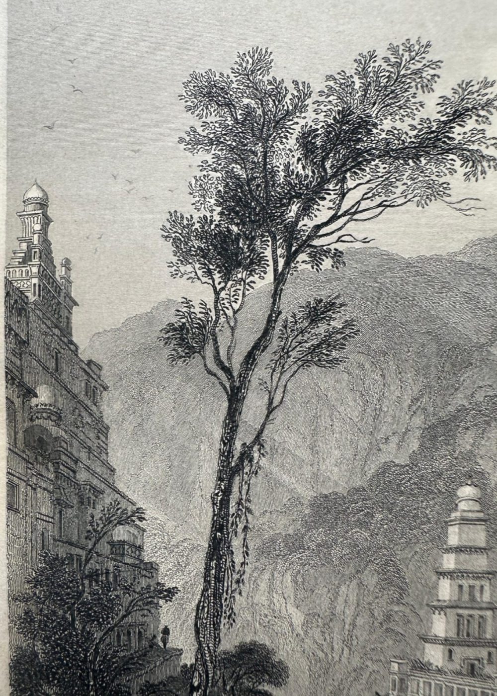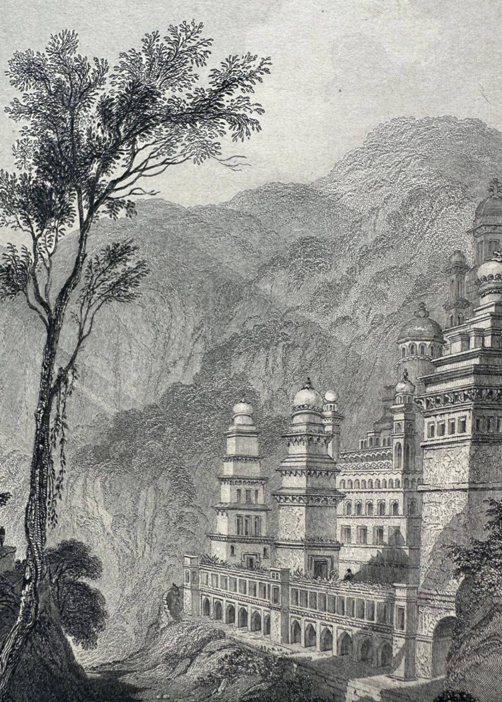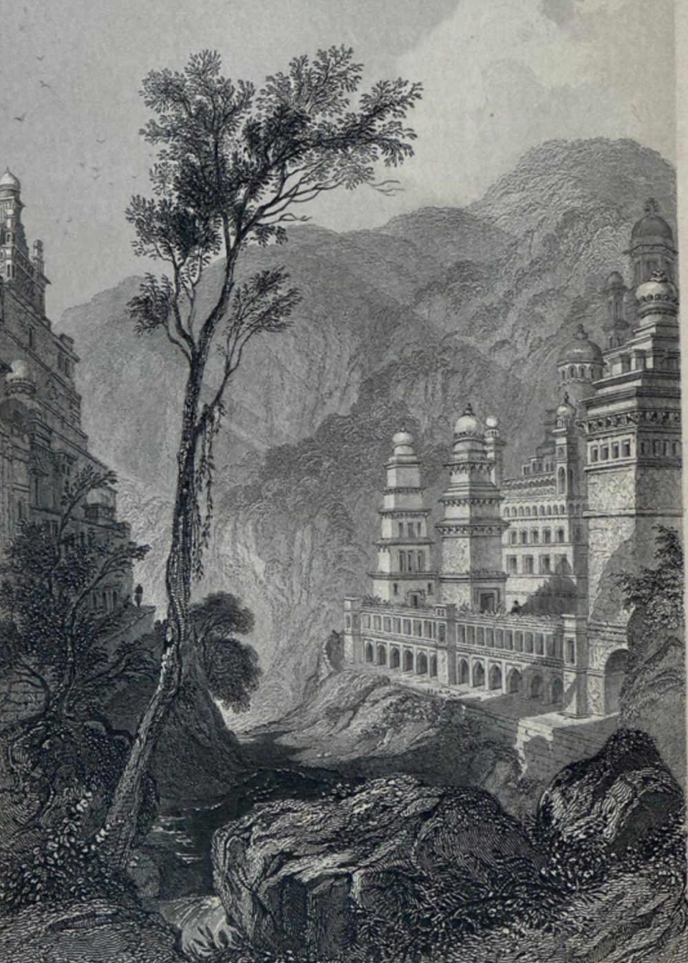“THE FAITHS IN THE WORLD”. A dictionary of all religions and their religious sects. by The Rev. James Gardner. A finely executed 19th-century engraving illustrating Jain temples nestled in the landscape of Maktageri. With tiered spires and ornate domes, these sacred structures reflect distinctive Hindu architectural elements. A tall tree anchors the foreground while rugged hills frame the background, adding dramatic depth to the composition. Engraved by Finden, based on Captain Mackenzie’s sketch, and published by A. Fullarton & Co., the image celebrates architectural harmony between nature and spiritual devotion.