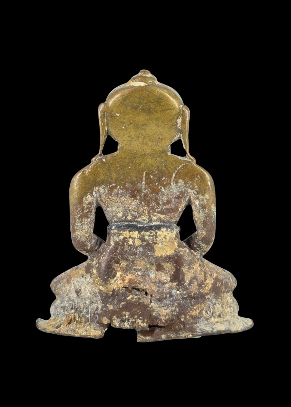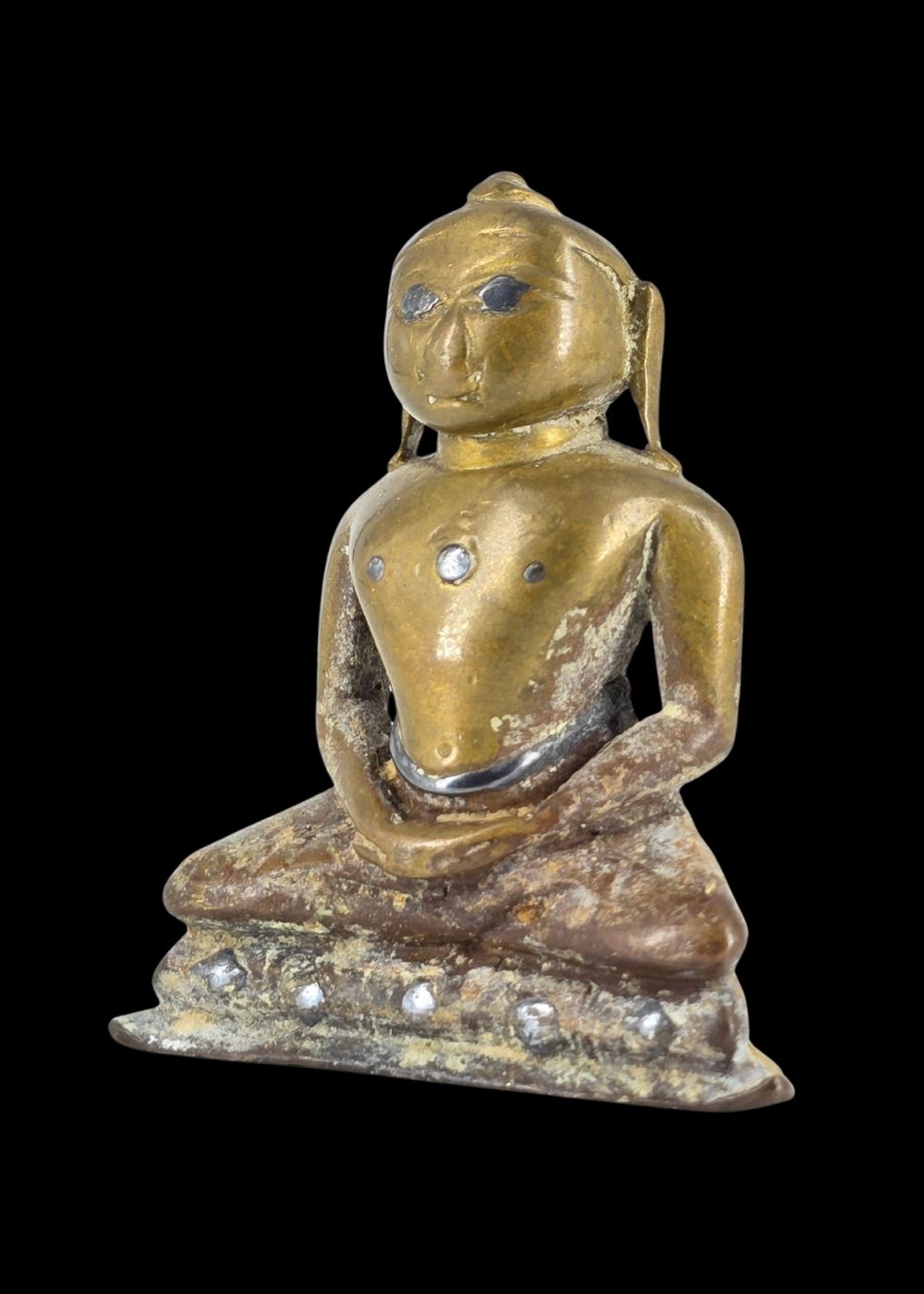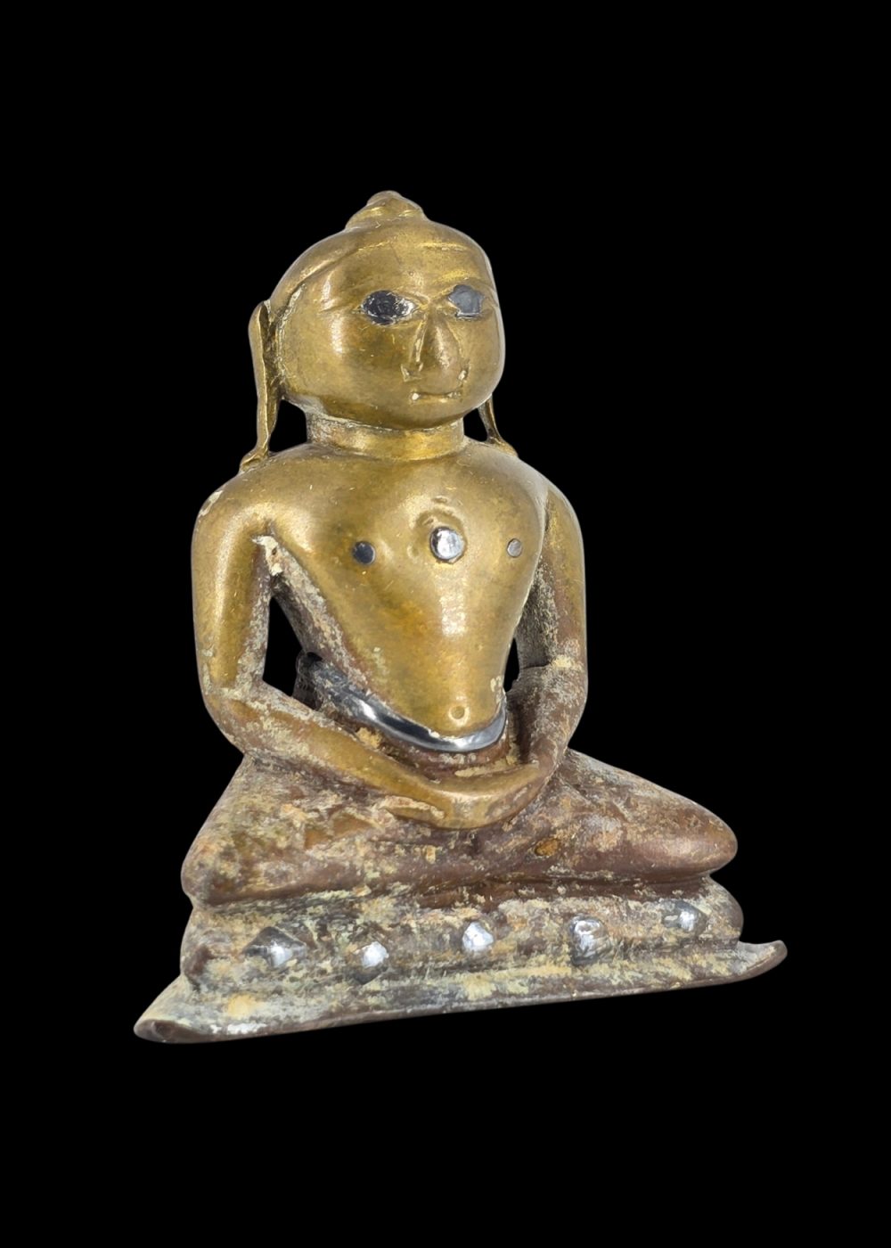 This is an antique brass idol representing a Jain Tirthankara in a meditative posture, set upon a stepped base adorned with embedded dark stones or glass inlays. The stylized eyes and chest ornaments are characteristic of Jain devotional art, symbolizing spiritual purity and enlightenment. Such idols are cherished in Jain households and temples for their spiritual and historical significance.