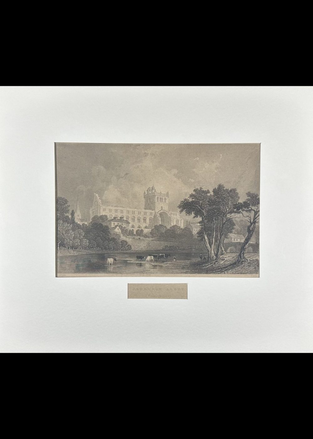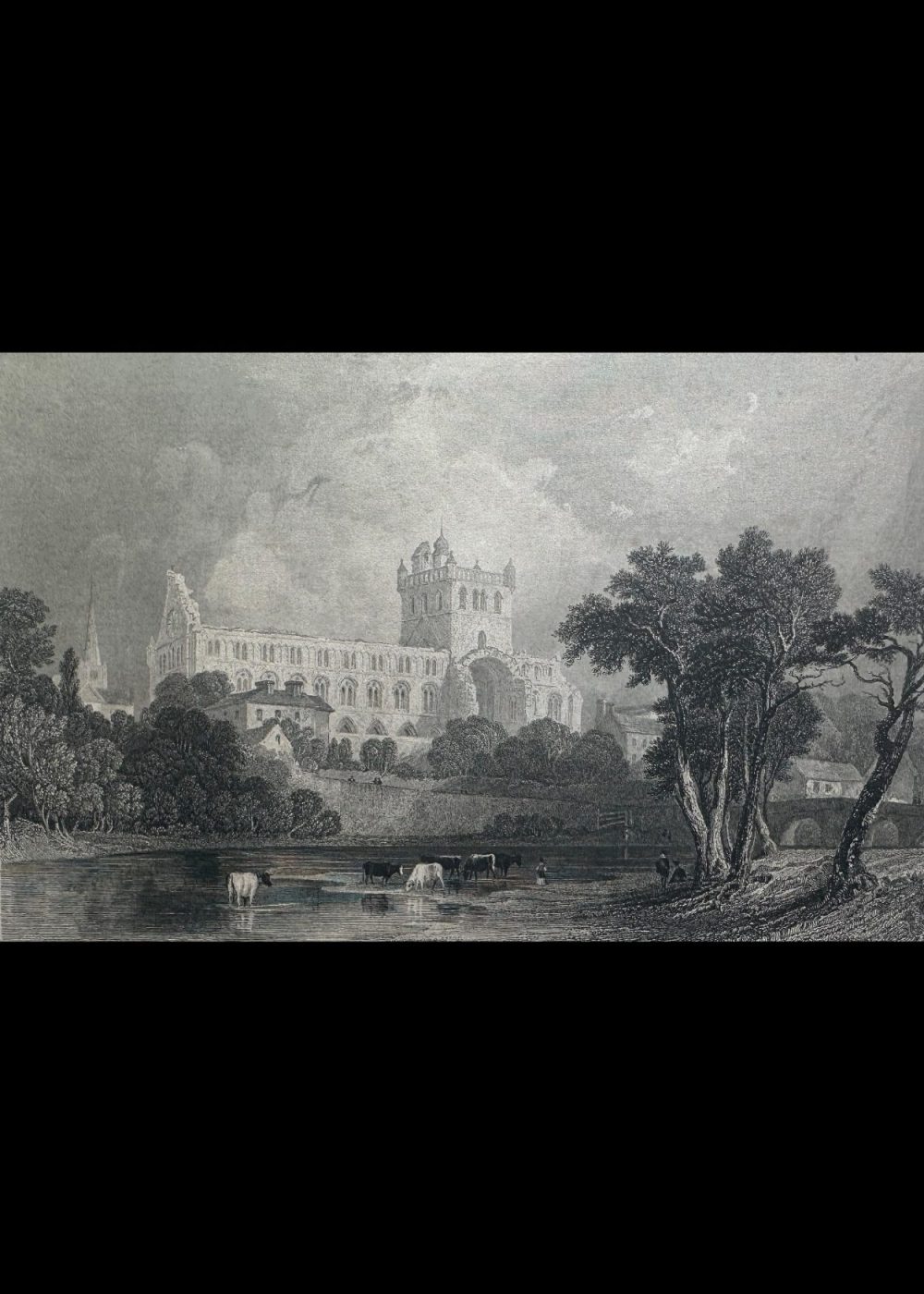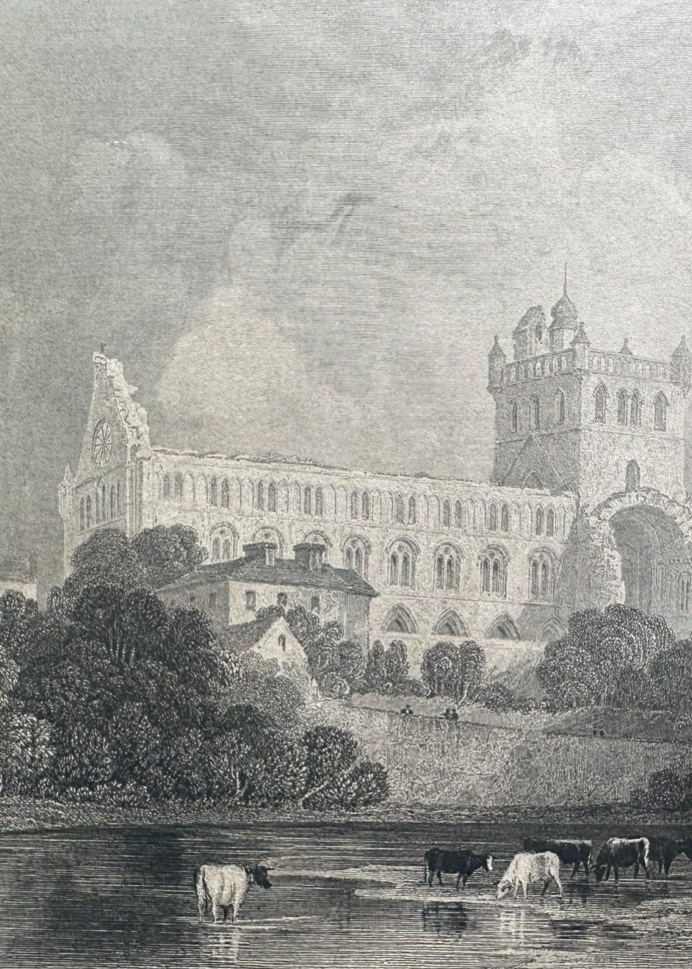 This serene and detailed engraving captures the historic Jedburgh Abbey nestled in the scenic countryside of Roxburghshire. In the foreground, cows wade and graze along a peaceful river, flanked by lush trees that frame the view. A graceful bridge spans the river on the right, leading the eye toward the grand abbey beyond. The abbey’s architecture stands in striking prominence—tall arched windows, an imposing tower, and rich stonework evoke its medieval majesty. Above it all, a cloudy sky drapes the scene in drama and depth, enhancing the timeless beauty of this tranquil vista.