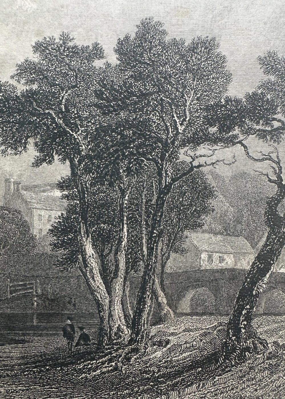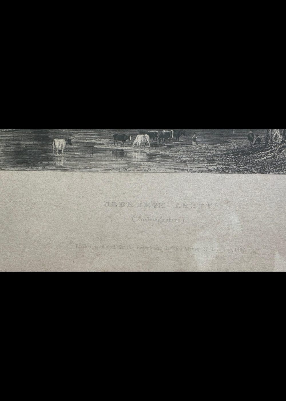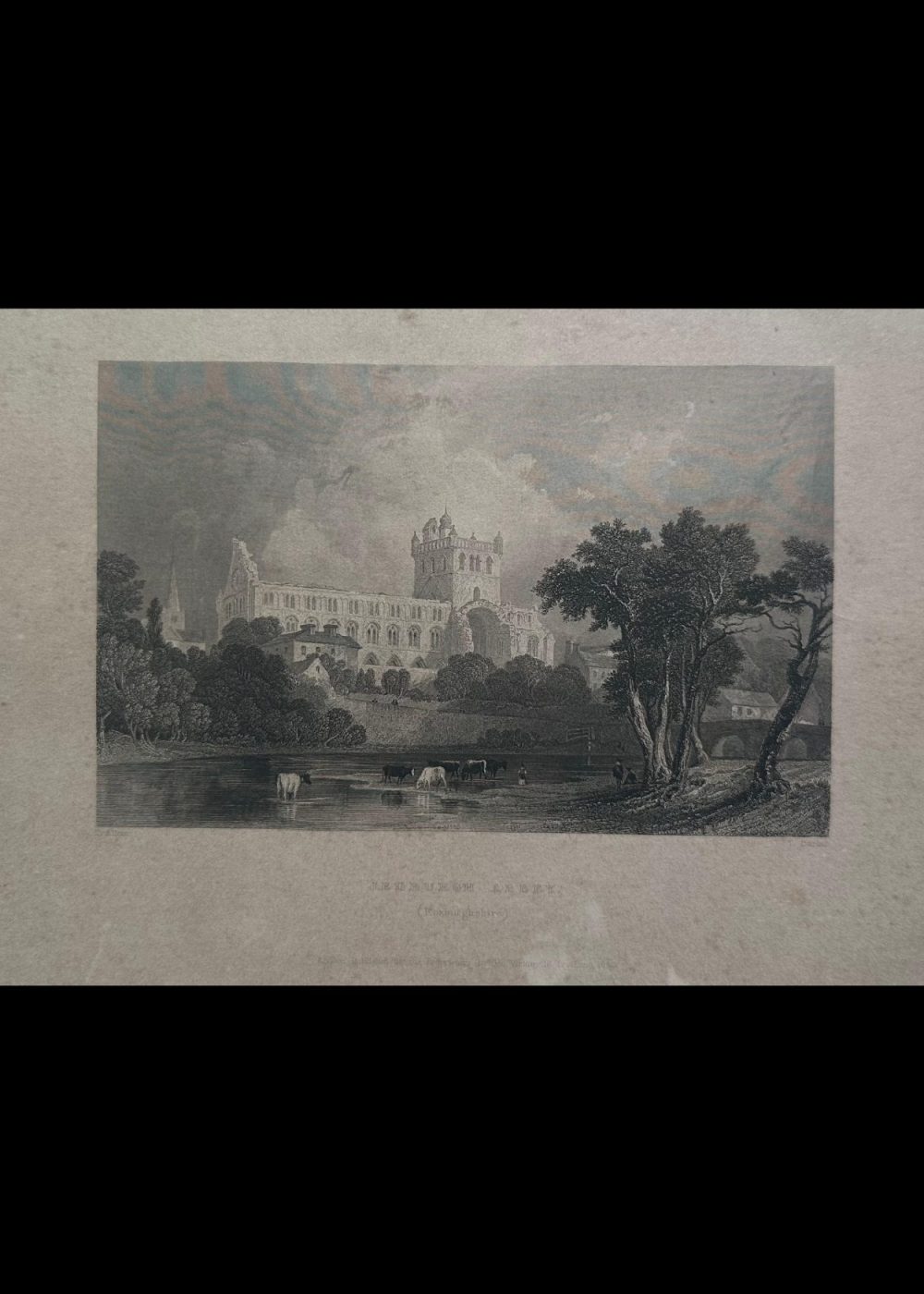 This serene and detailed engraving captures the historic Jedburgh Abbey nestled in the scenic countryside of Roxburghshire. In the foreground, cows wade and graze along a peaceful river, flanked by lush trees that frame the view. A graceful bridge spans the river on the right, leading the eye toward the grand abbey beyond. The abbey’s architecture stands in striking prominence—tall arched windows, an imposing tower, and rich stonework evoke its medieval majesty. Above it all, a cloudy sky drapes the scene in drama and depth, enhancing the timeless beauty of this tranquil vista.