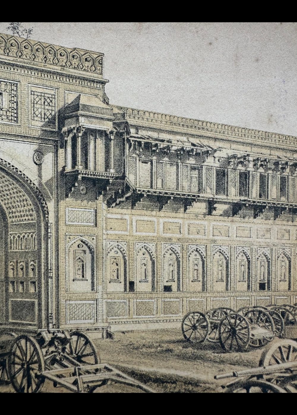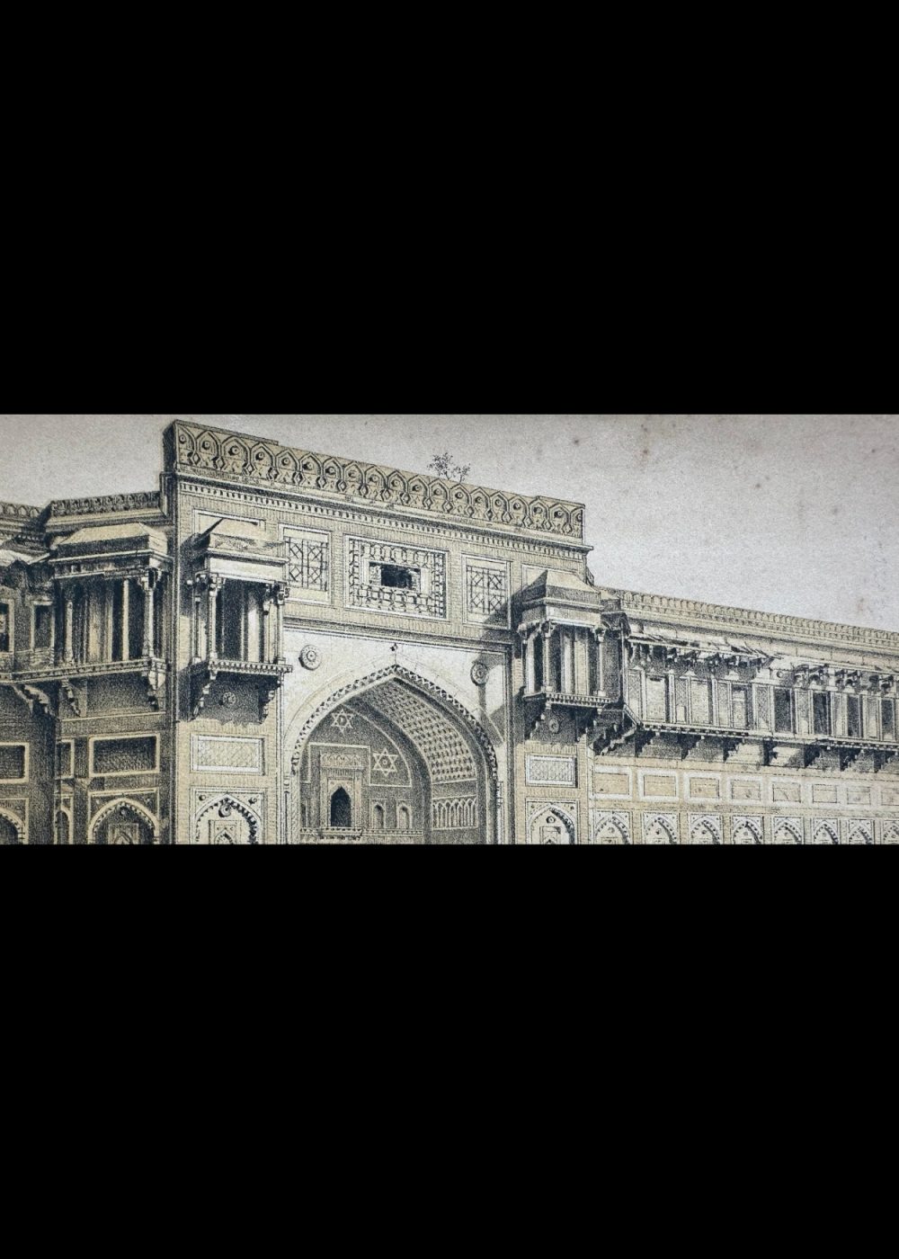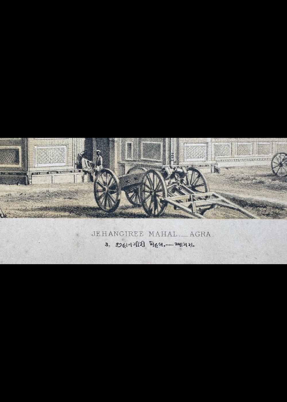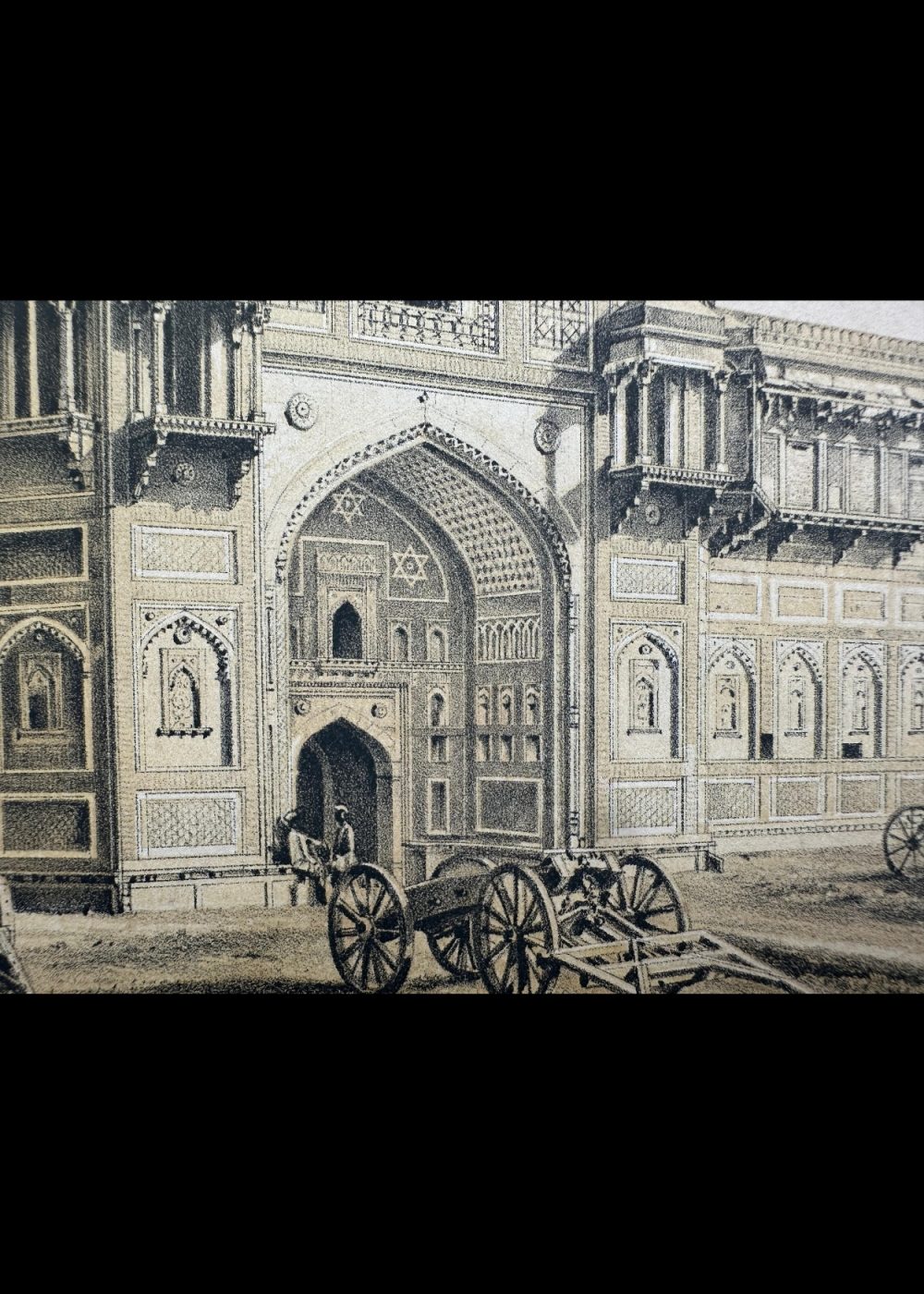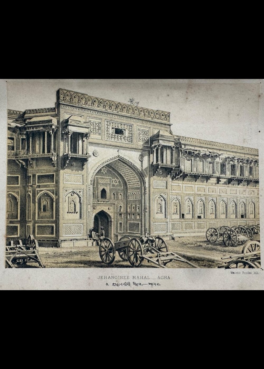 This cromo-lithograph depicts the Jehangir Mahal in Agra, India, an architectural marvel from the Mughal era. The illustration, a detailed representation of the palace’s intricate façade, highlights the ornate carvings, arches, and decorative elements typical of Mughal architecture. The image shows the impressive entrance with finely detailed archways and delicate designs on the walls. Carriages and carts can be seen in the foreground, adding a sense of daily life during the time it was created. The lithograph is part of a travel book documenting India, capturing the grandeur and historical significance of the Jehangir Mahal, built by Emperor Akbar for his son Jehangir.