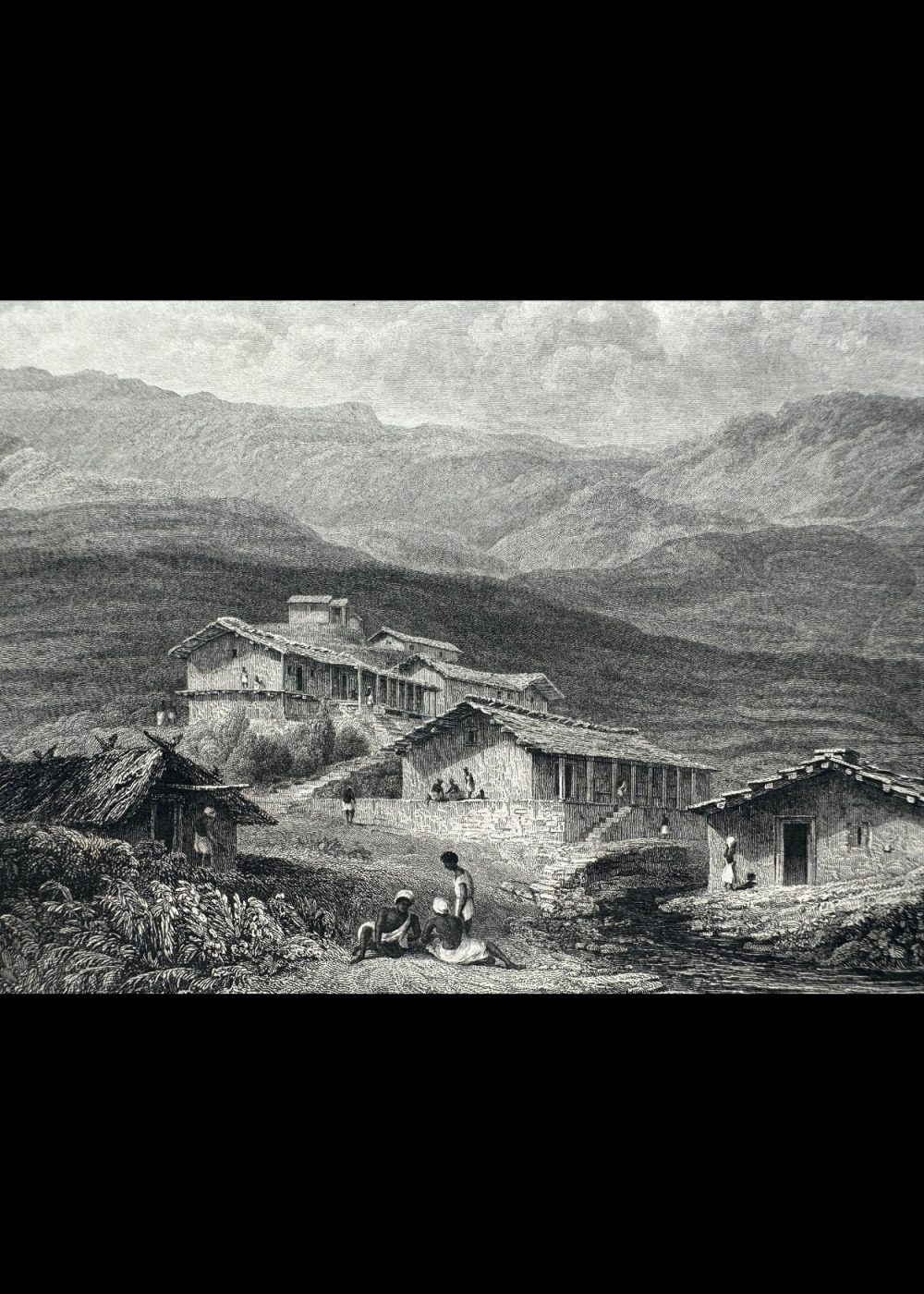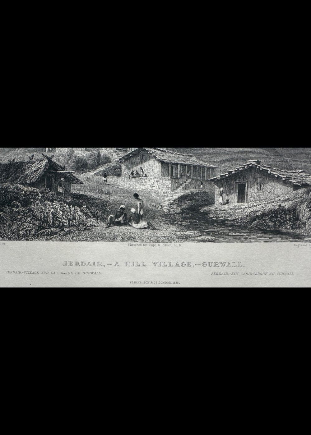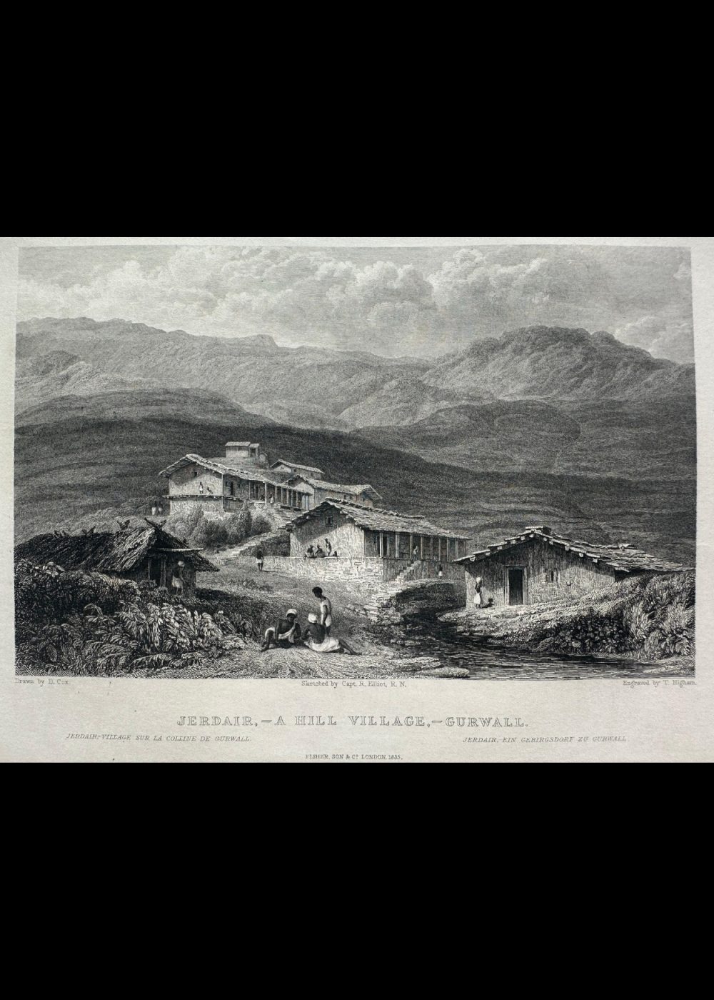 This engraving, titled Jerdair, A Hill Village, Gurwall, is part of the “India-China” book. The artwork was created by D. Cox, with the sketch by Captain R. Elliot, R.N., and engraved by T. Higham. The scene depicts a rural hill village, possibly in the Gurwall region of India, showing traditional architecture with thatched roofs and stone buildings. A flowing stream runs through the village, and people can be seen engaging in daily activities, offering a glimpse of life in a remote mountainous area. The surrounding mountains form a dramatic backdrop, highlighting the serene yet rugged nature of the landscape. The engraving captures the peaceful, simple lifestyle of the village against the grandeur of the natural environment.