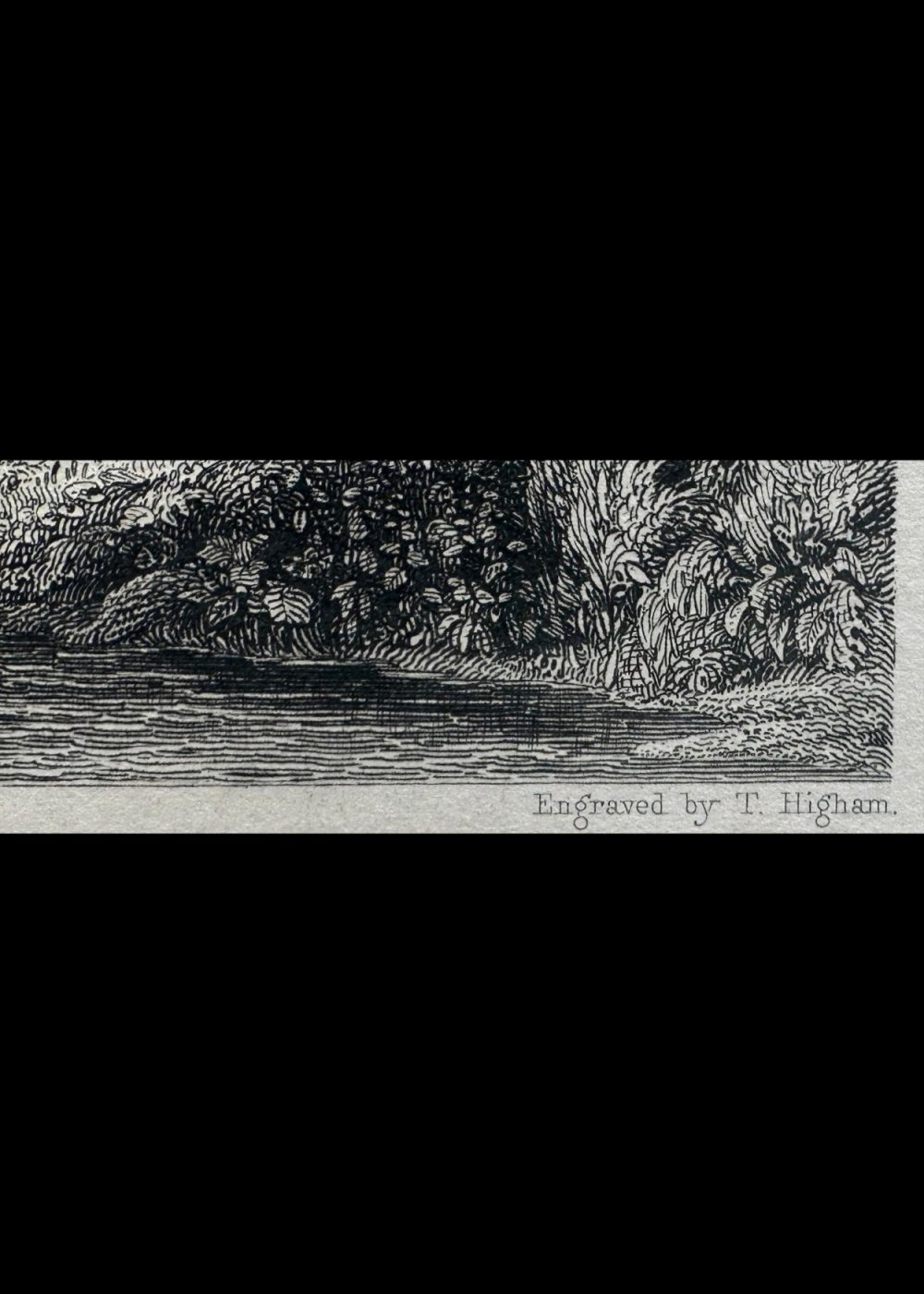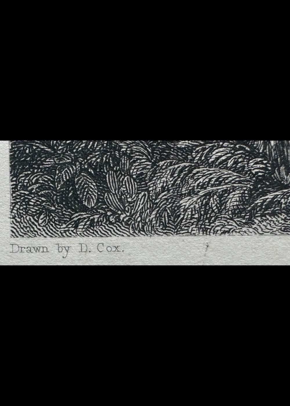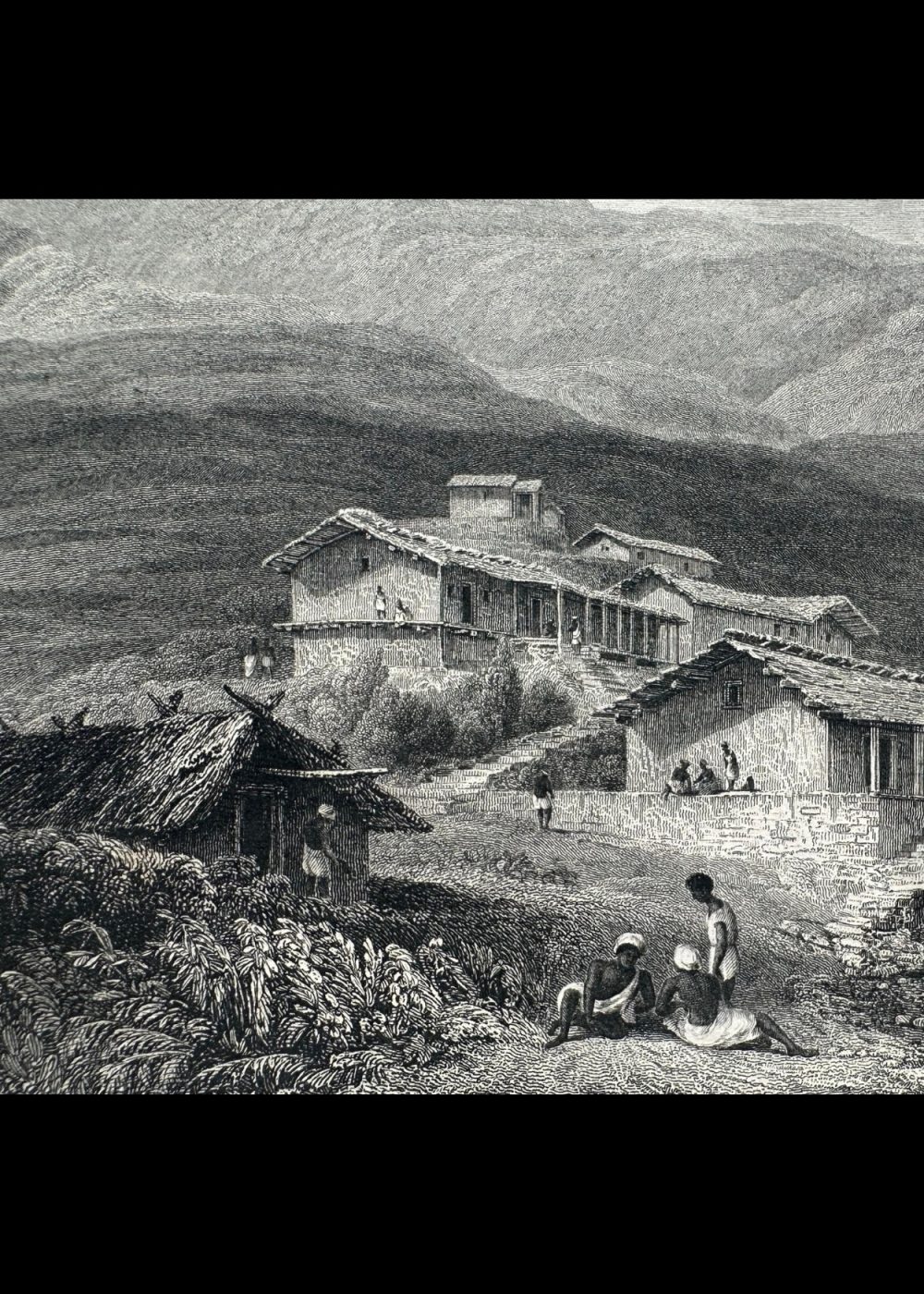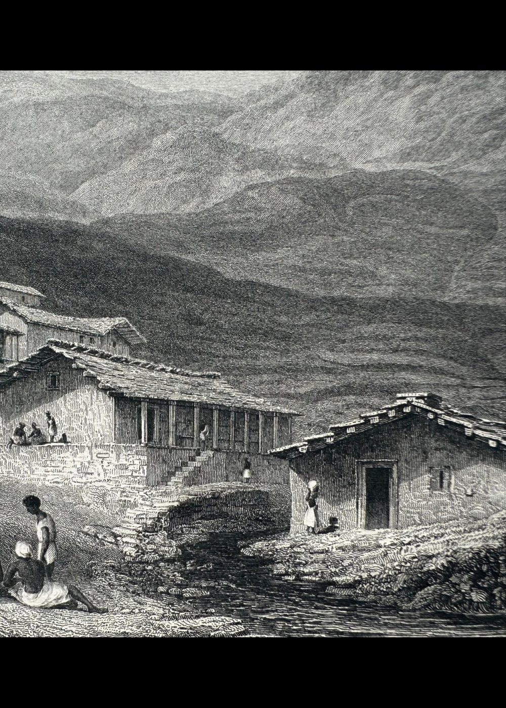 This engraving, titled Jerdair, A Hill Village, Gurwall, is part of the “India-China” book. The artwork was created by D. Cox, with the sketch by Captain R. Elliot, R.N., and engraved by T. Higham. The scene depicts a rural hill village, possibly in the Gurwall region of India, showing traditional architecture with thatched roofs and stone buildings. A flowing stream runs through the village, and people can be seen engaging in daily activities, offering a glimpse of life in a remote mountainous area. The surrounding mountains form a dramatic backdrop, highlighting the serene yet rugged nature of the landscape. The engraving captures the peaceful, simple lifestyle of the village against the grandeur of the natural environment.