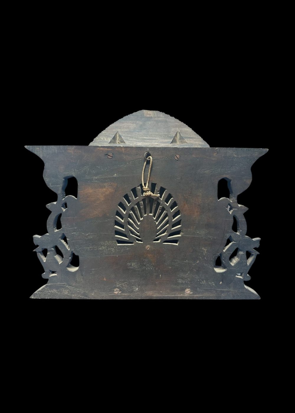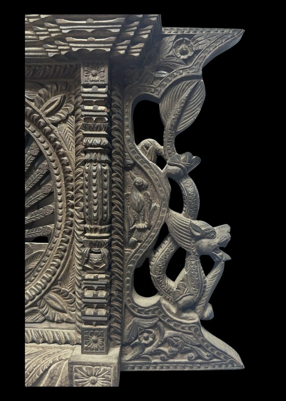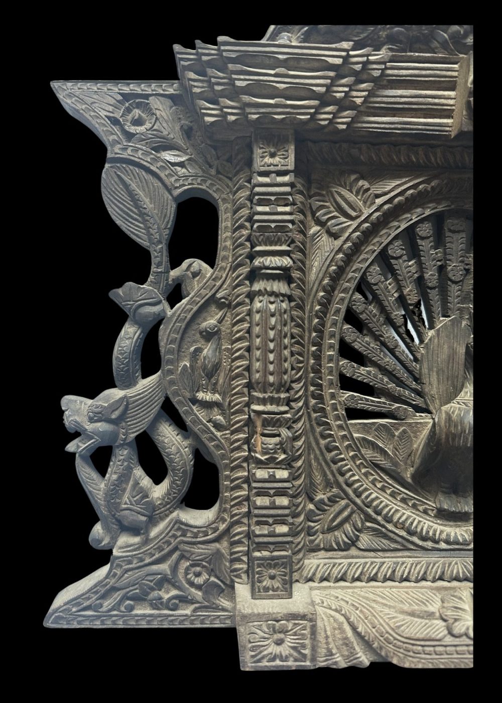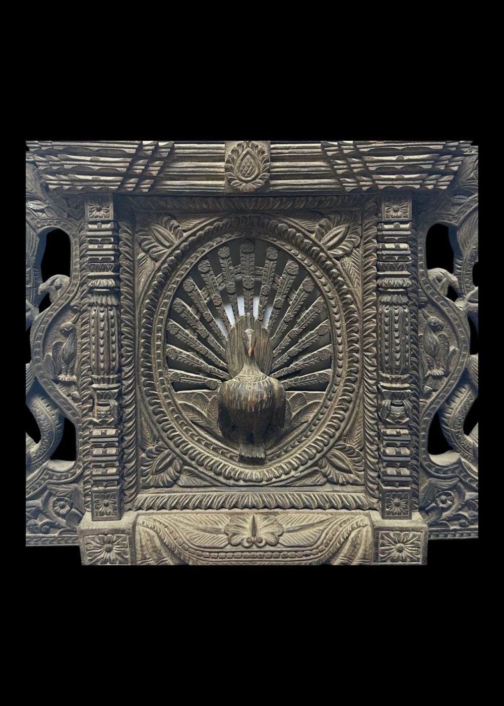 This intricately carved wooden panel from Nepal exemplifies the artistry and precision of 20th-century woodcraft. Featuring a central peacock motif encircled by floral and geometric patterns, the panel reflects the region’s rich decorative traditions. Such designs were commonly integrated into homes and temples, merging functionality with aesthetic reverence. The detailed symmetry and fine chiseling underscore the enduring legacy of Nepali artisanship in architectural embellishment.