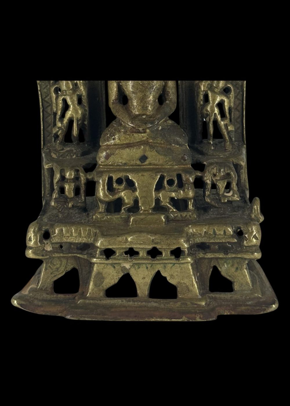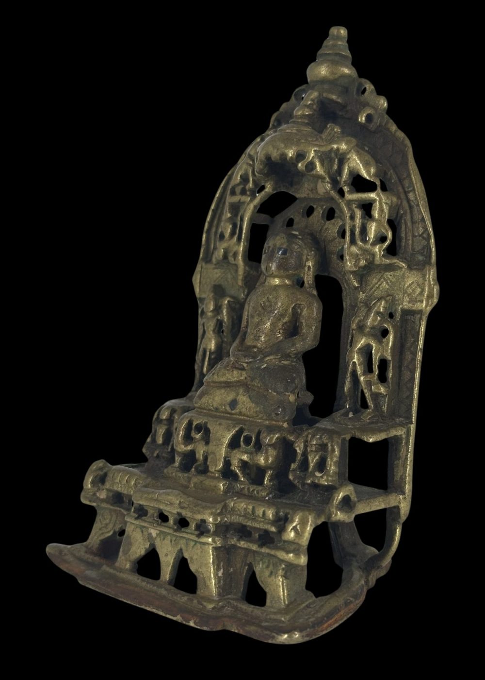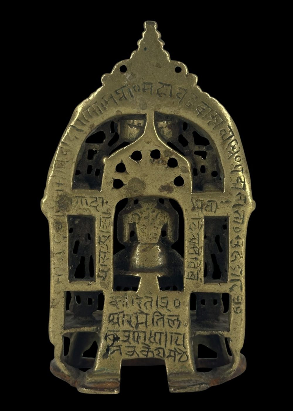 This intricately cast bronze sculpture from Nepal features a seated Jina, likely a Tirthankara, enshrined within a richly adorned prabhavali (arch-shaped halo). The Jina sits in padmasana (lotus posture), exuding serenity and spiritual composure. His hands are positioned in dhyana mudra, symbolizing meditation and enlightenment. The prabhavali envelops the figure in a sanctuary of ornate openwork, populated with celestial motifs, mythical creatures, and symbolic guardians. The canopy at the top, possibly representing a parasol, emphasizes the Jina’s divine status, while the lions or makaras (mythical sea creatures) flanking the base add protective significance. This artifact exemplifies Nepal’s long-standing tradition of sacred metal art, influenced by both Indian and Tibetan aesthetic lineages. The finely detailed craftsmanship reflects the spiritual devotion and technical mastery of Newar artisans, who have preserved this sacred artistic legacy for centuries.