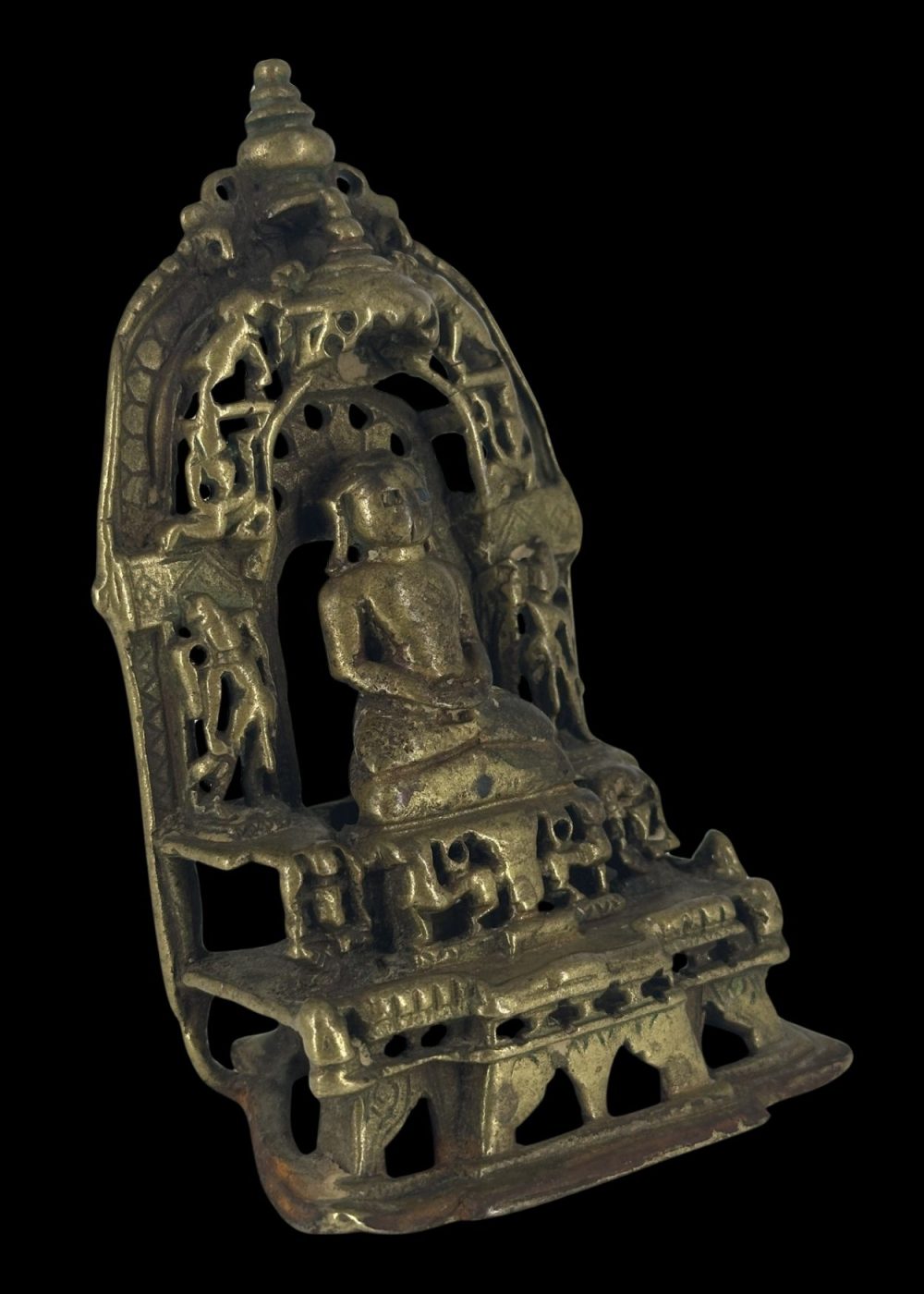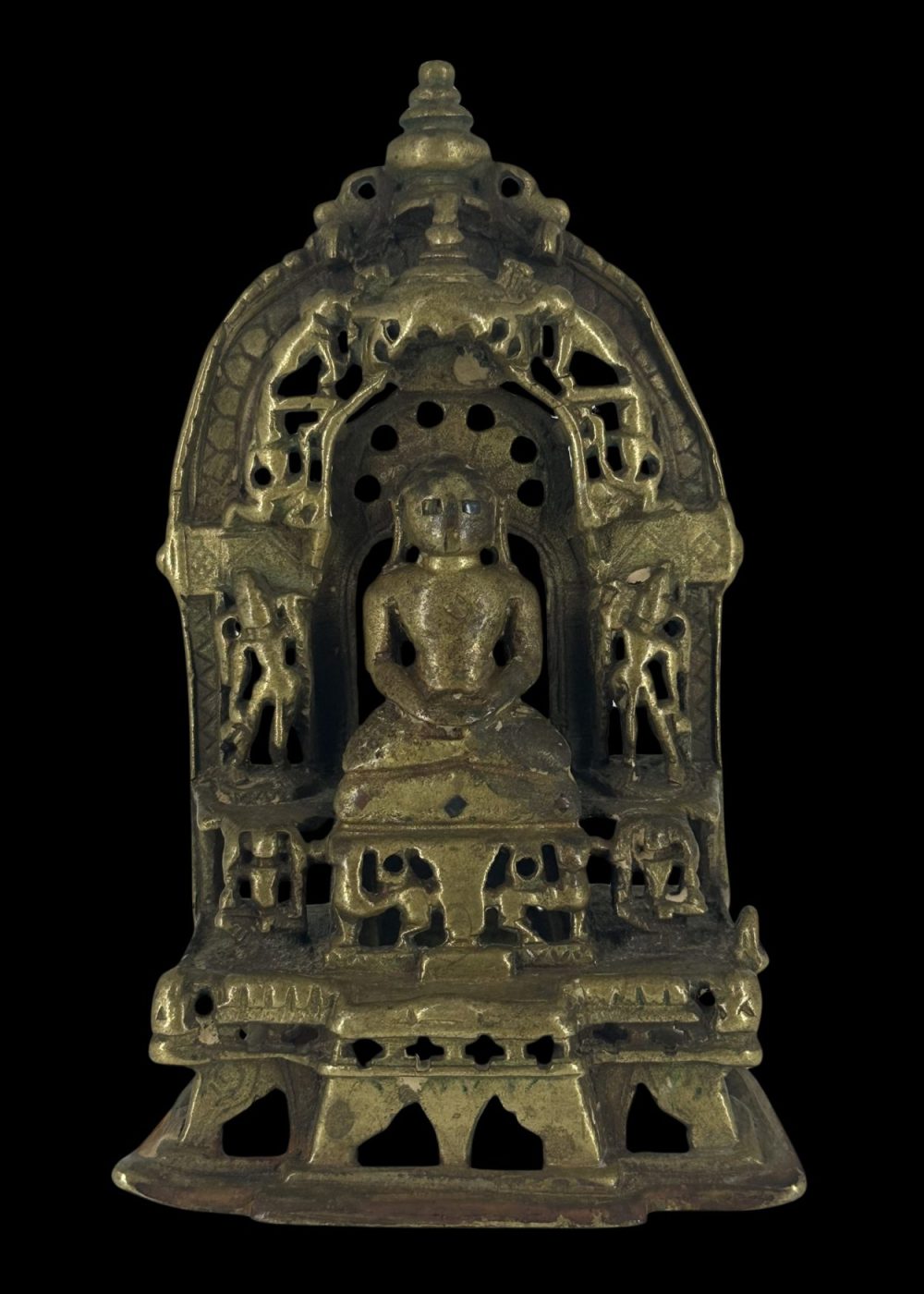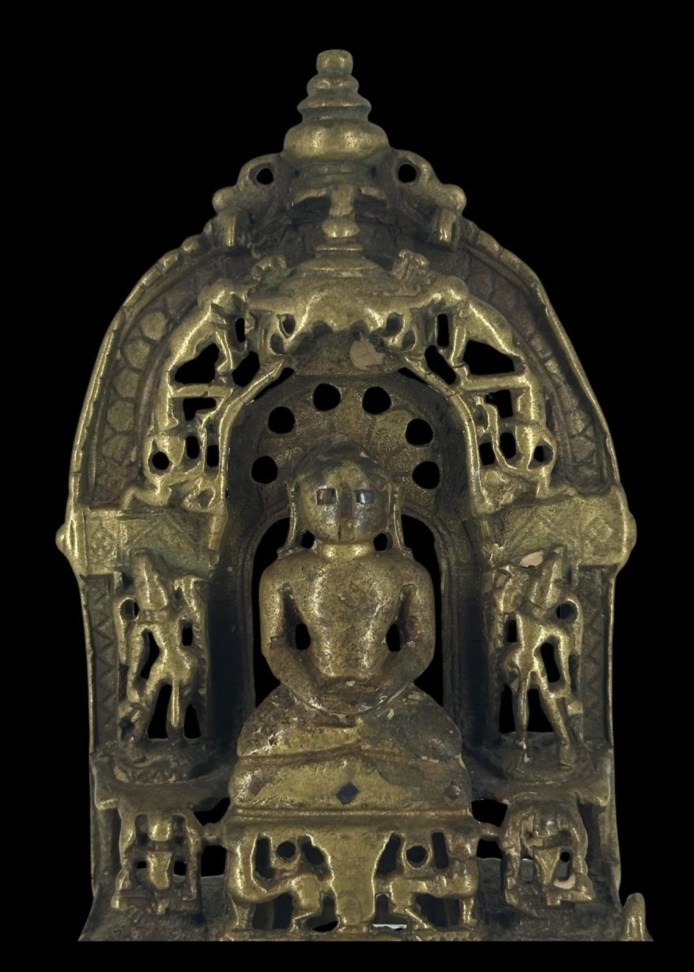 This intricately cast bronze sculpture from Nepal features a seated Jina, likely a Tirthankara, enshrined within a richly adorned prabhavali (arch-shaped halo). The Jina sits in padmasana (lotus posture), exuding serenity and spiritual composure. His hands are positioned in dhyana mudra, symbolizing meditation and enlightenment. The prabhavali envelops the figure in a sanctuary of ornate openwork, populated with celestial motifs, mythical creatures, and symbolic guardians. The canopy at the top, possibly representing a parasol, emphasizes the Jina’s divine status, while the lions or makaras (mythical sea creatures) flanking the base add protective significance. This artifact exemplifies Nepal’s long-standing tradition of sacred metal art, influenced by both Indian and Tibetan aesthetic lineages. The finely detailed craftsmanship reflects the spiritual devotion and technical mastery of Newar artisans, who have preserved this sacred artistic legacy for centuries.