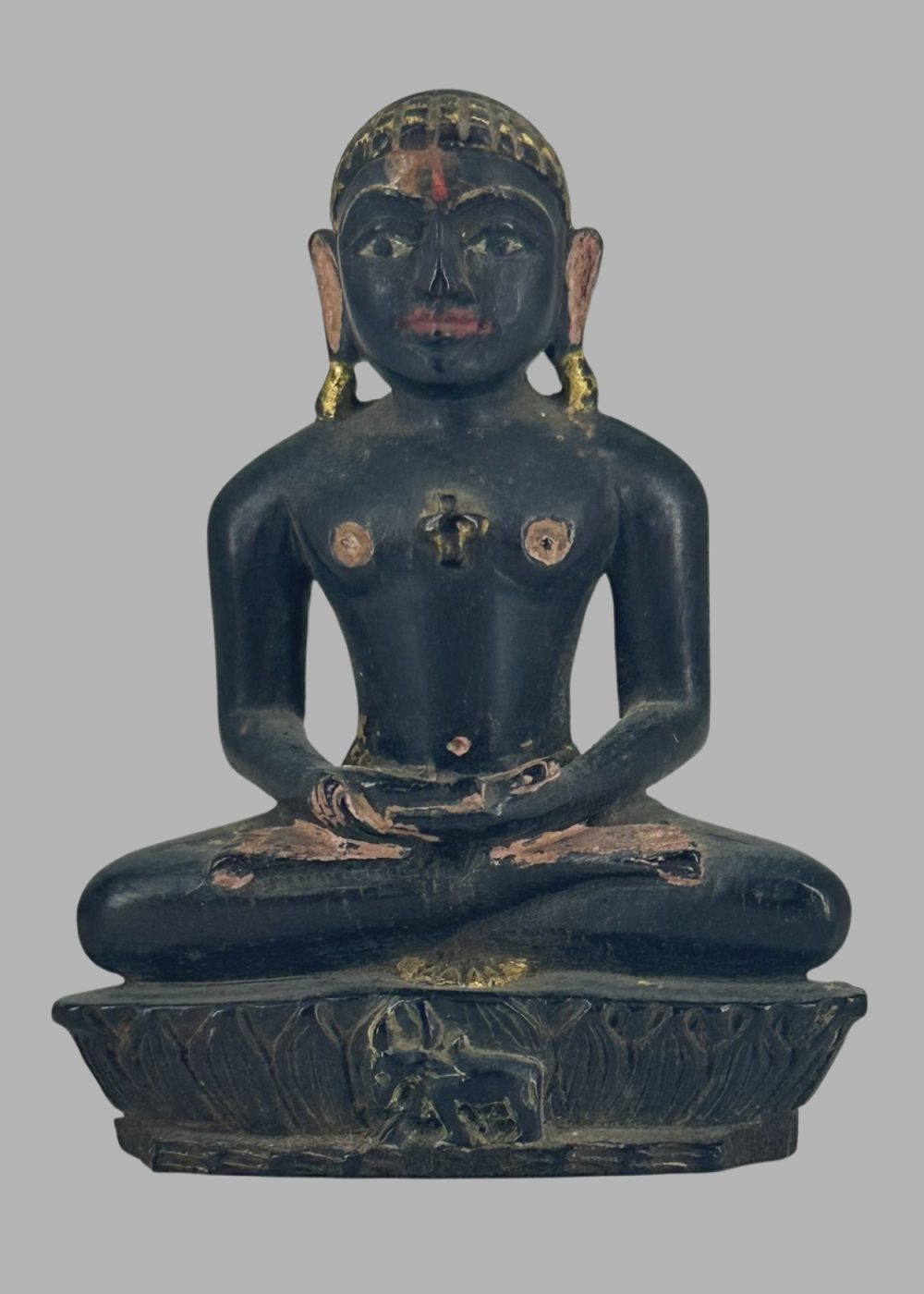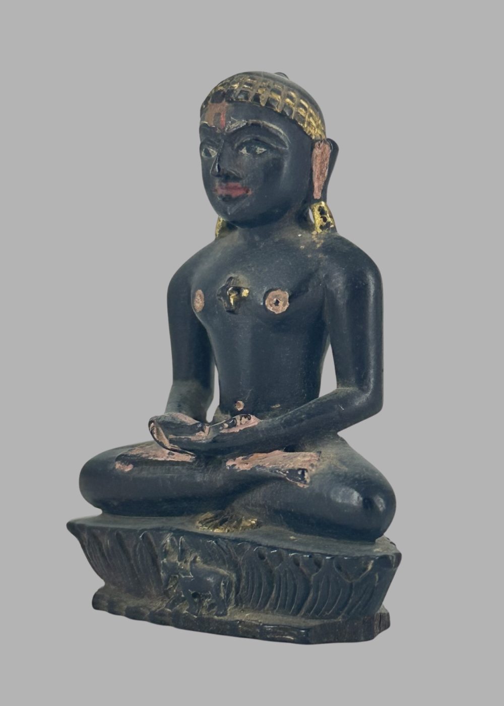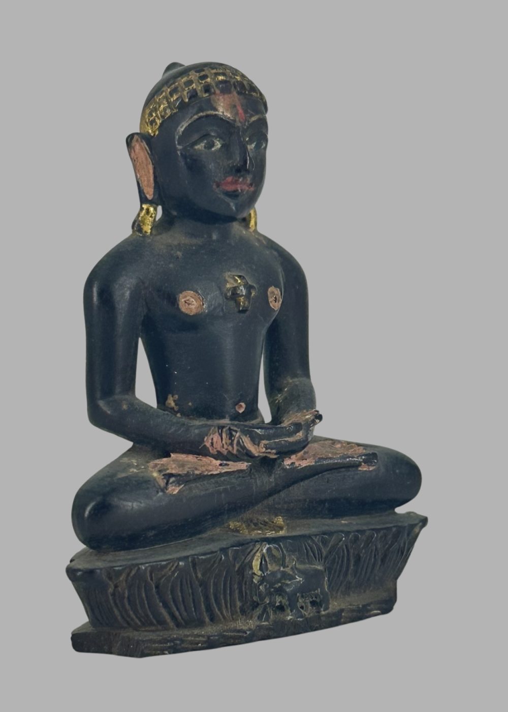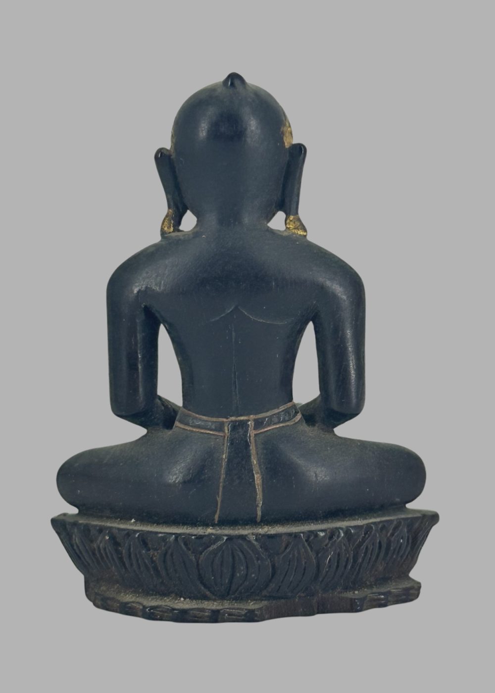 This 18th-century wooden sculpture, originating from either Gujarat or Rajasthan, exemplifies the region’s deep-rooted tradition of religious art and fine craftsmanship. Depicting a meditative Jain Tirthankara seated in the lotus position, the figure is rendered with serene expression and symbolic hand gestures. The dark polish and subtle gold accents highlight the spiritual dignity and artistic finesse characteristic of Western Indian devotional carvings.