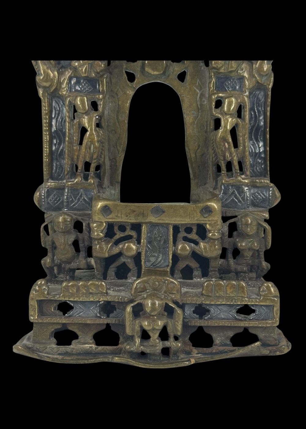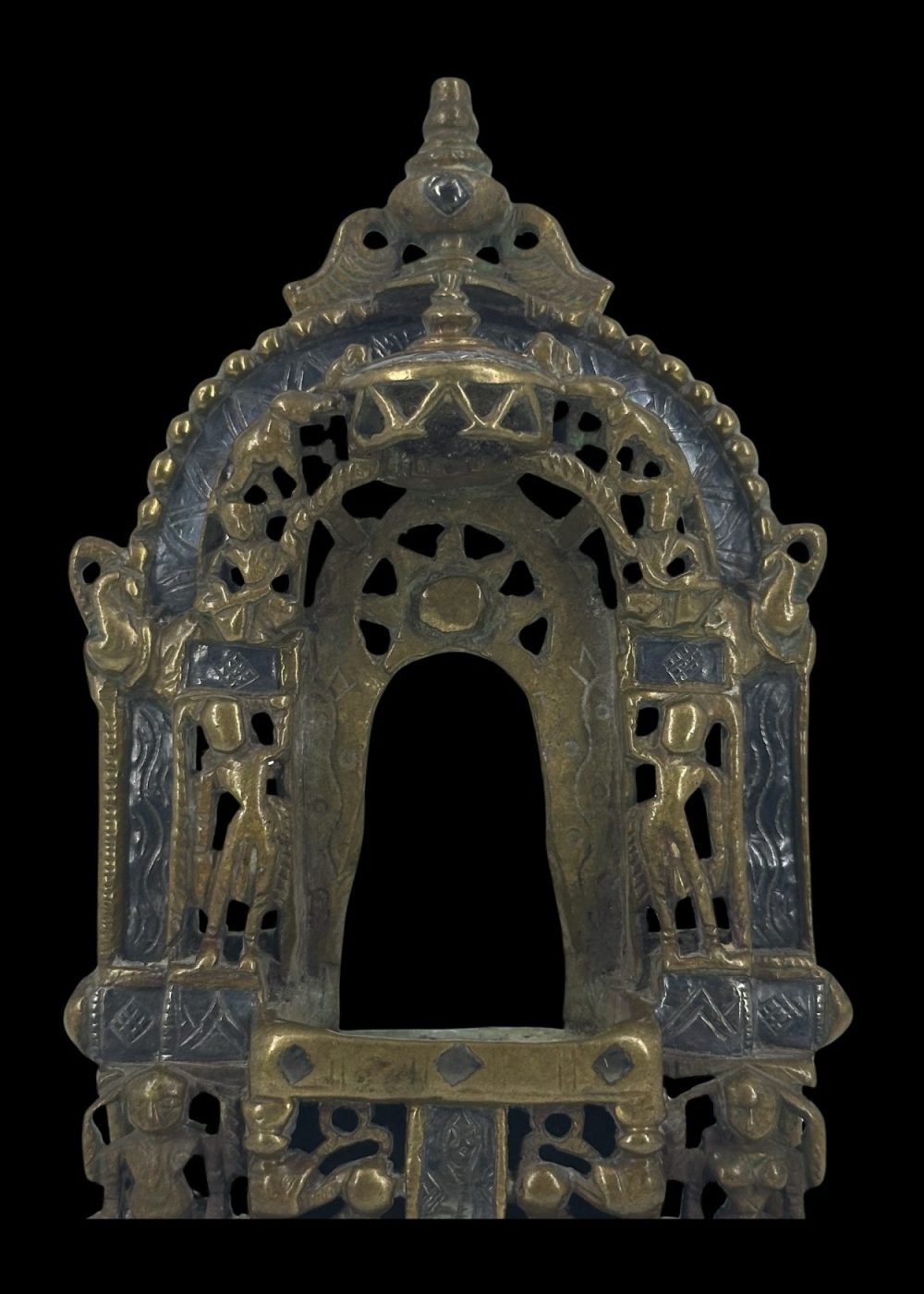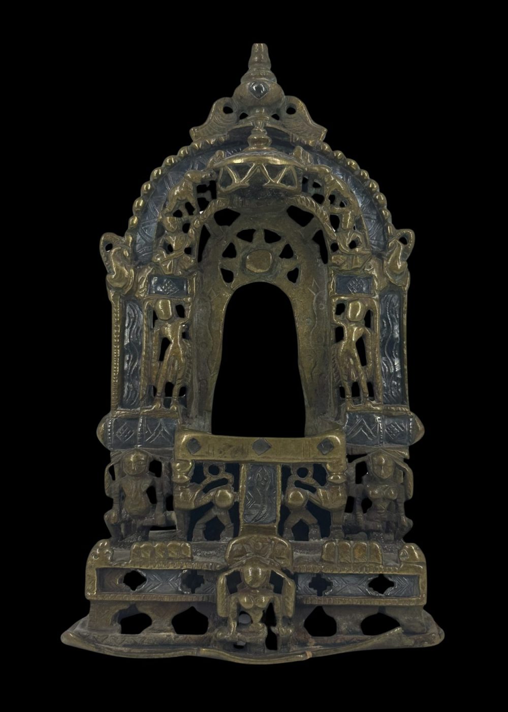 This bronze prabha (aura or halo) frame, originally created to enshrine an image of Jina Parshvanatha, exemplifies the exquisite craftsmanship of Western India, particularly Gujarat. The openwork arch is richly decorated with detailed floral and geometric motifs, flanked by stylized celestial figures and protective iconography. The central cavity would have housed the image of Parshvanatha, the 23rd Tirthankara in Jainism, identifiable by the canopy of serpents often seen above him. The intricate pierced design not only allows light to pass through, creating a divine radiance around the image, but also symbolizes spiritual enlightenment. The solid base, adorned with sculpted elements such as lions or mythical beasts, reinforces the piece’s sacred purpose and artistic significance. This artifact is a testament to the deep spiritual traditions and refined bronze-casting skills that flourished in Jain communities of the region.