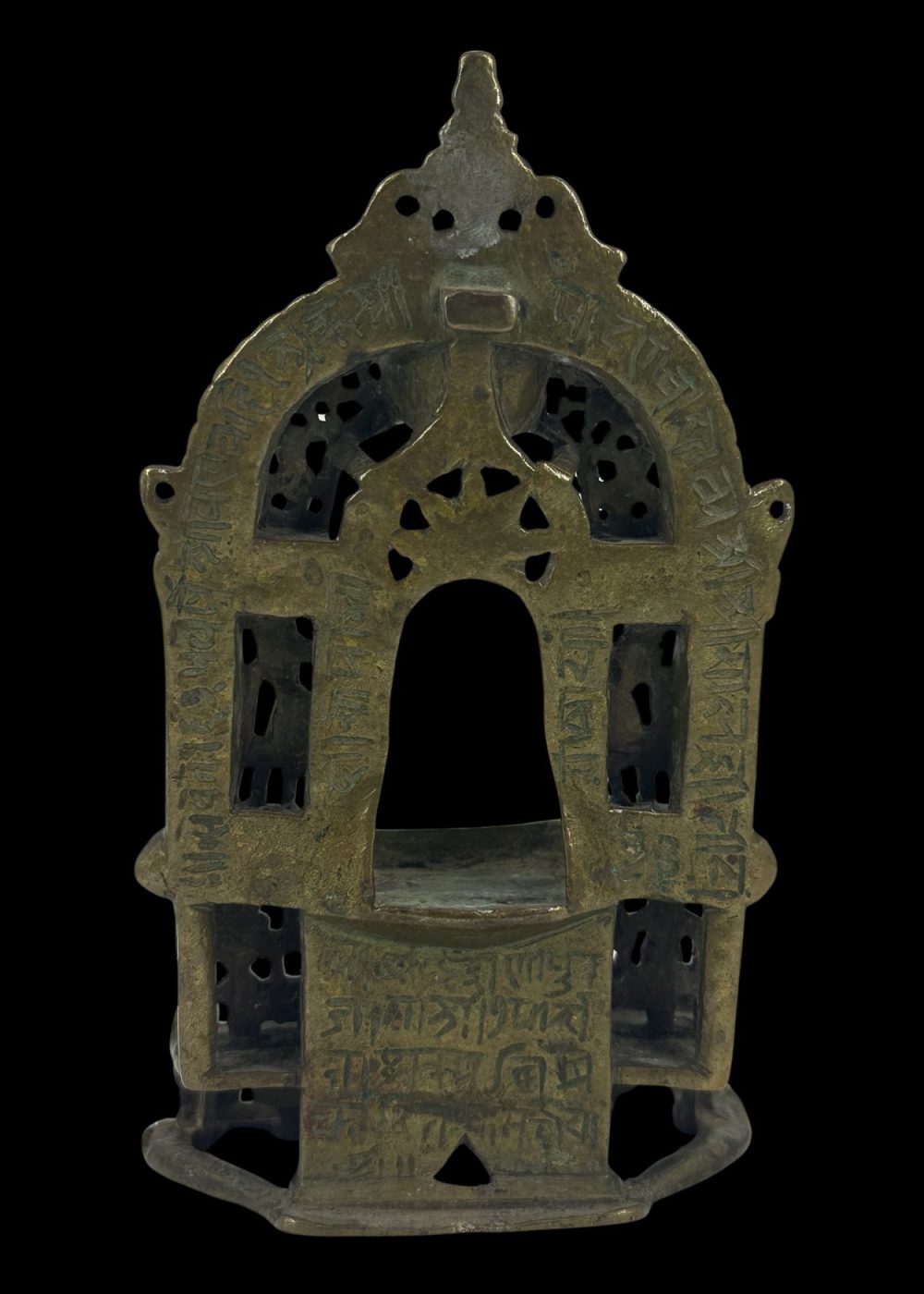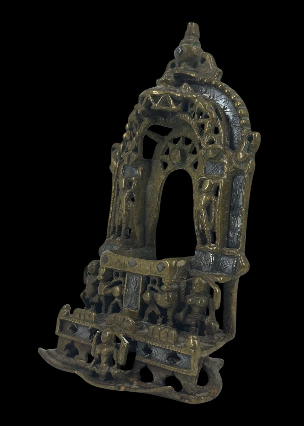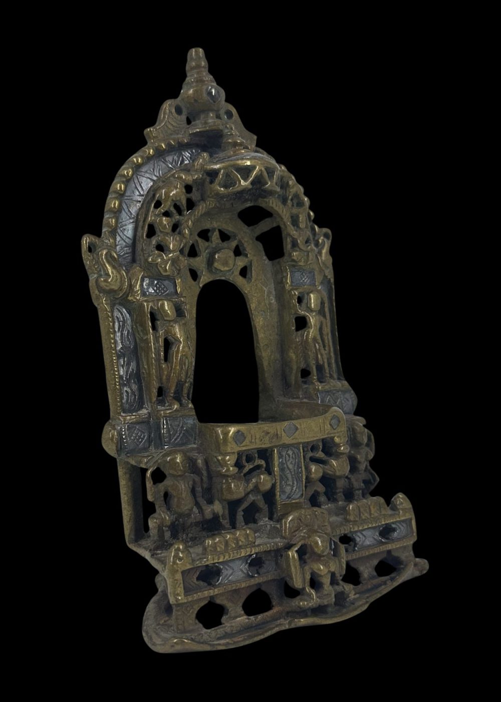 This bronze prabha (aura or halo) frame, originally created to enshrine an image of Jina Parshvanatha, exemplifies the exquisite craftsmanship of Western India, particularly Gujarat. The openwork arch is richly decorated with detailed floral and geometric motifs, flanked by stylized celestial figures and protective iconography. The central cavity would have housed the image of Parshvanatha, the 23rd Tirthankara in Jainism, identifiable by the canopy of serpents often seen above him. The intricate pierced design not only allows light to pass through, creating a divine radiance around the image, but also symbolizes spiritual enlightenment. The solid base, adorned with sculpted elements such as lions or mythical beasts, reinforces the piece’s sacred purpose and artistic significance. This artifact is a testament to the deep spiritual traditions and refined bronze-casting skills that flourished in Jain communities of the region.