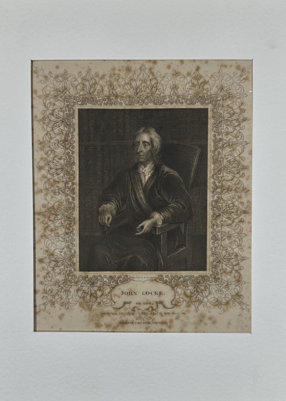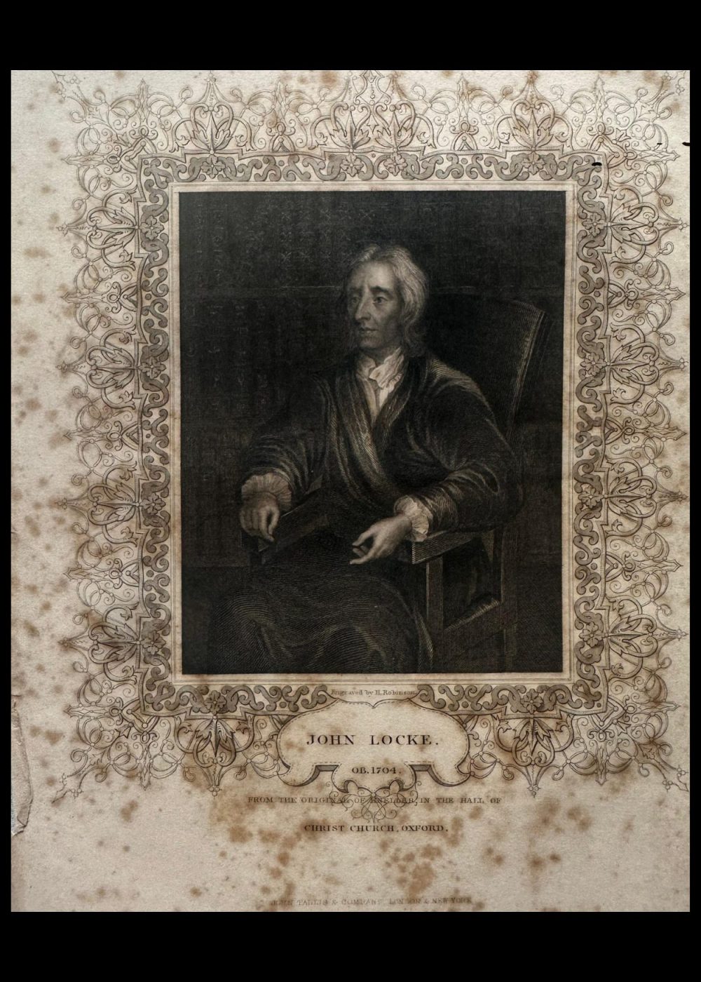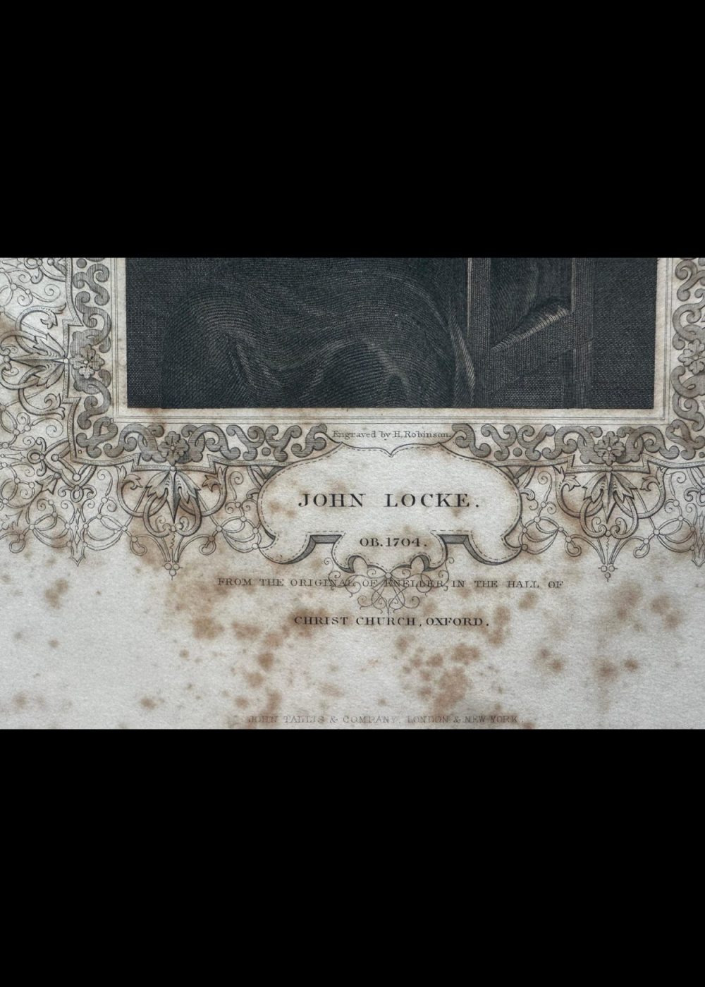 This 19th-century engraving presents the influential English philosopher John Locke, seated in contemplative repose, draped in scholarly robes. Known as the “Father of Liberalism,” Locke’s writings on government, liberty, and human understanding laid foundational principles for modern political thought. The portrait is based on the original painting housed in the Hall of Christ Church, Oxford, and is surrounded by a delicately engraved ornamental border. Engraved by H. Robinson and published by J. & F. Tallis, London & New York.
