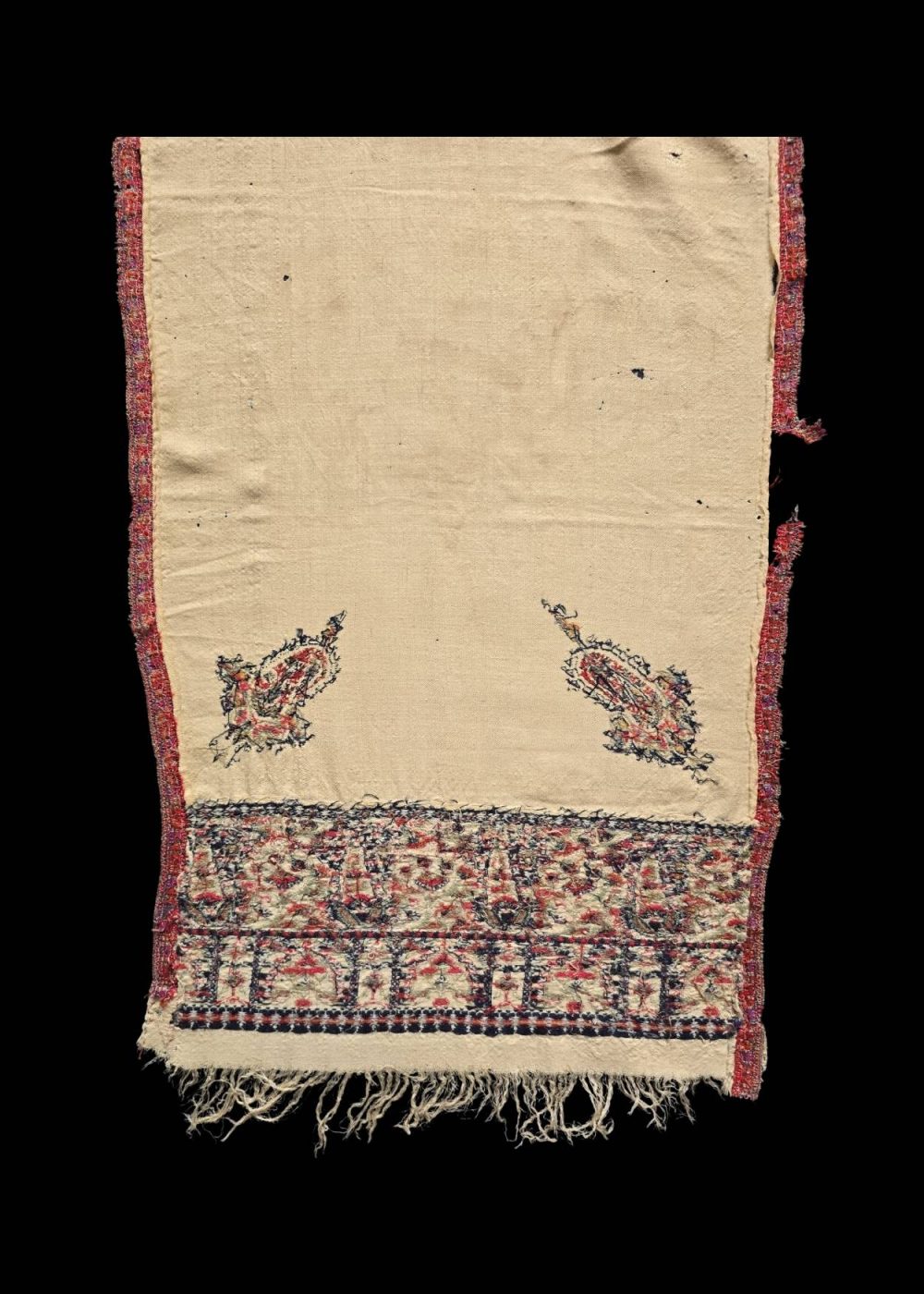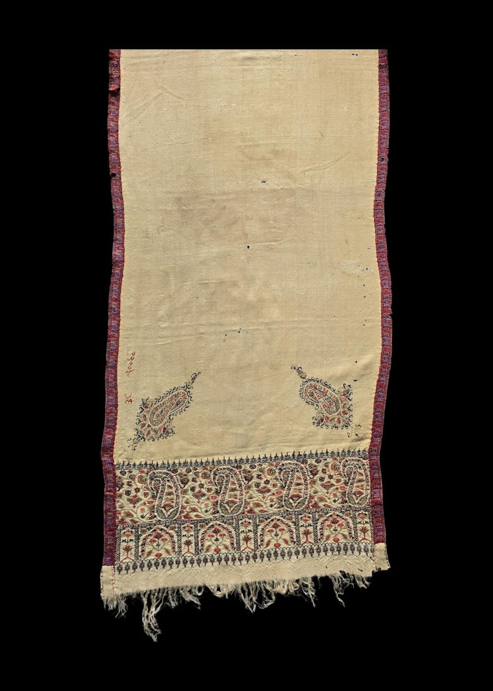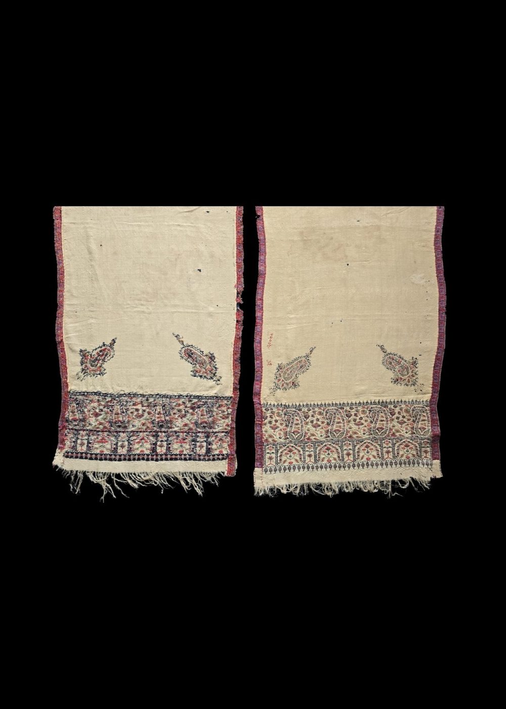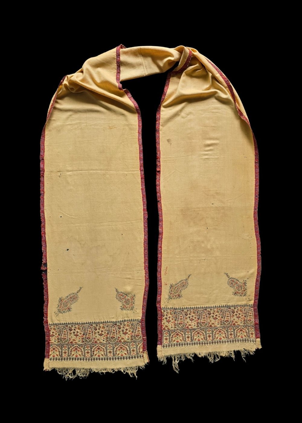 This elegant Pashmina kamarband from Kashmir showcases the region’s renowned craftsmanship in fine wool weaving and embroidery. The soft cream base is adorned with delicate paisley motifs and a richly patterned border in muted tones of red and gold, rendered with traditional Sozni embroidery. Worn as a decorative waist sash, this piece reflects the refined artistry and luxurious textile heritage of Kashmiri artisans.