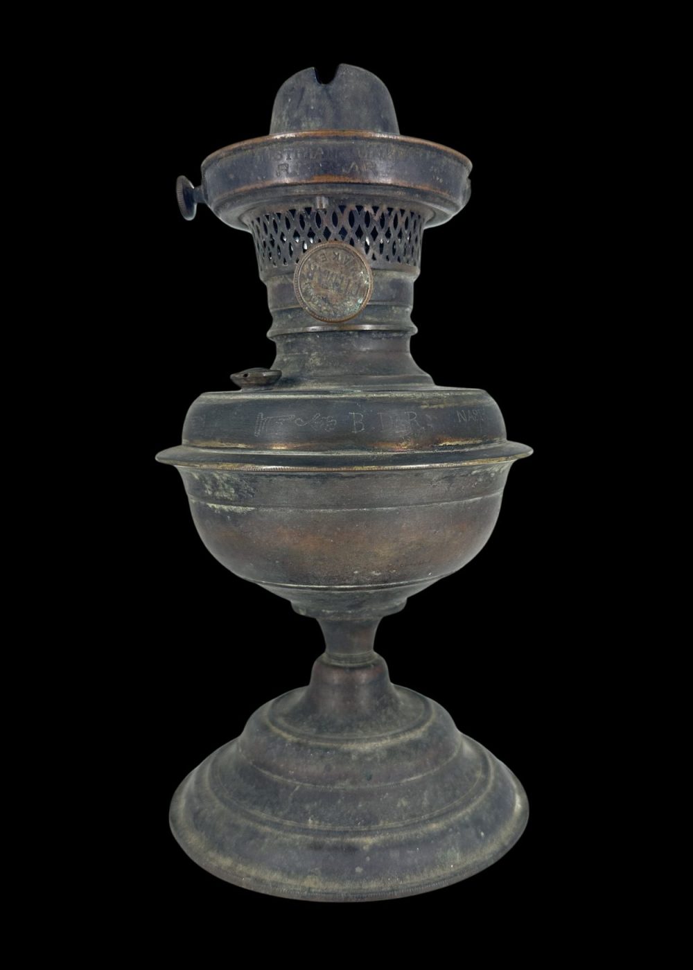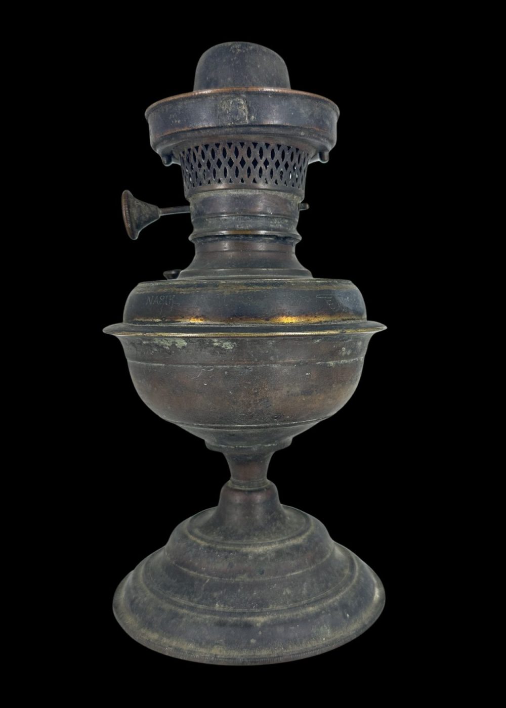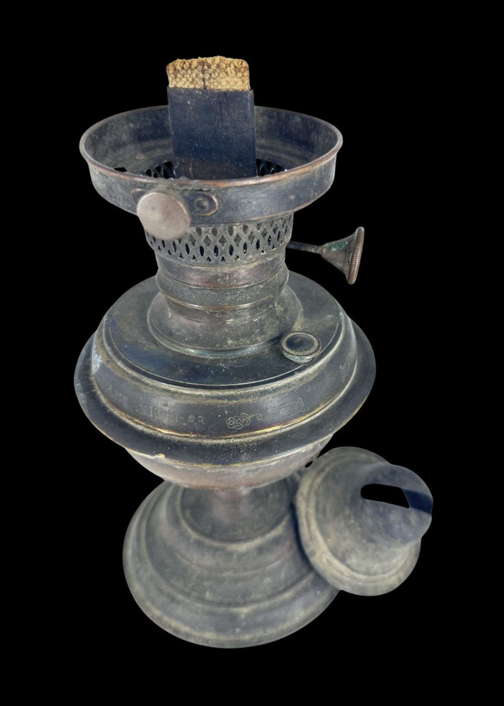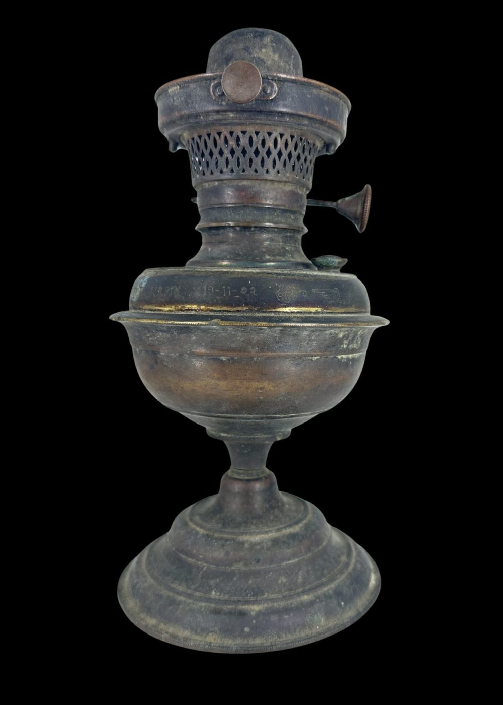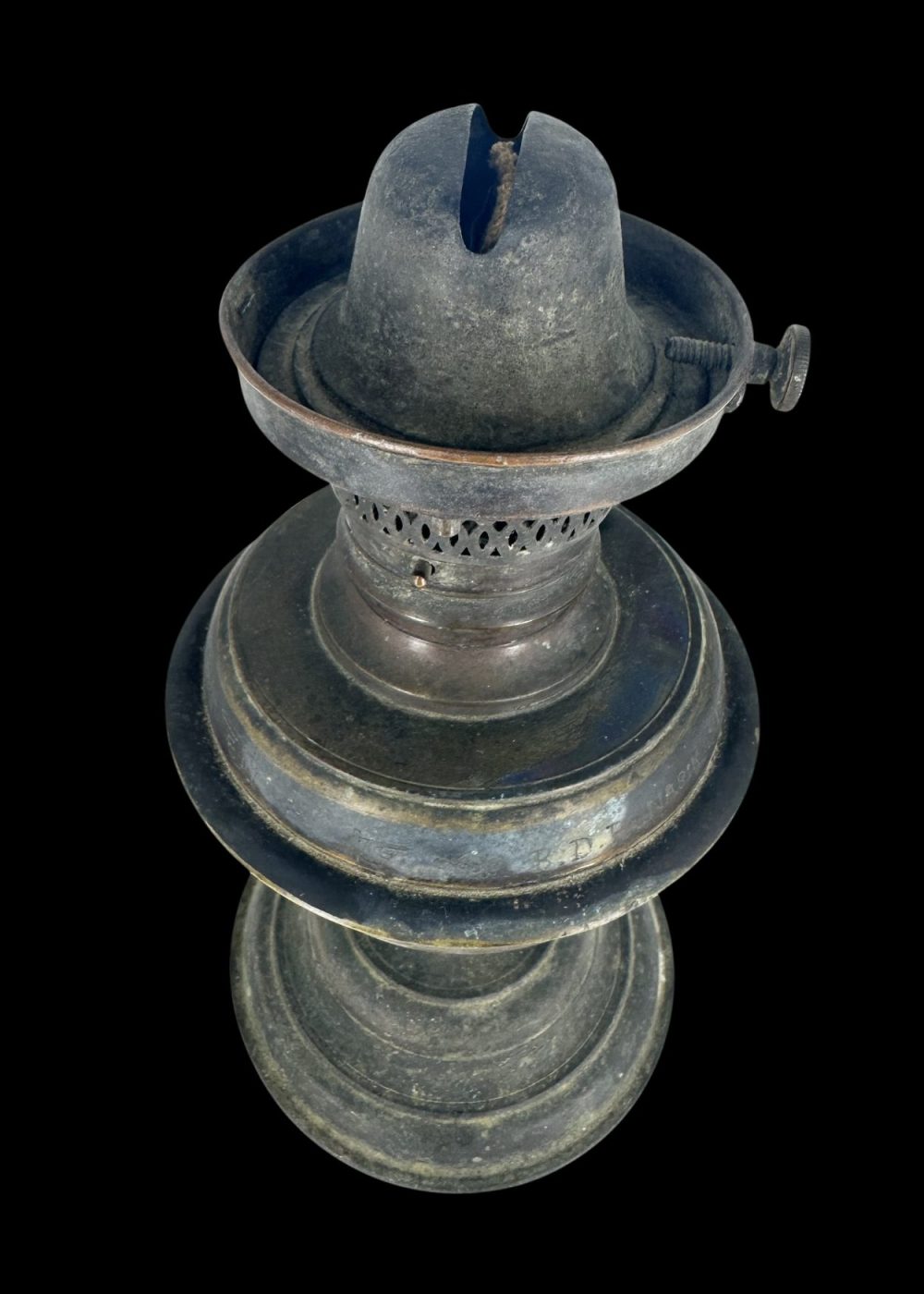 This elegant brass kerosene lamp from circa England reflects the intricate craftsmanship and utilitarian design of the late Victorian era. With its ornate vented crown and gracefully curved base, it embodies both function and decorative appeal, making it a charming collectible for lovers of antique lighting and British heritage design.