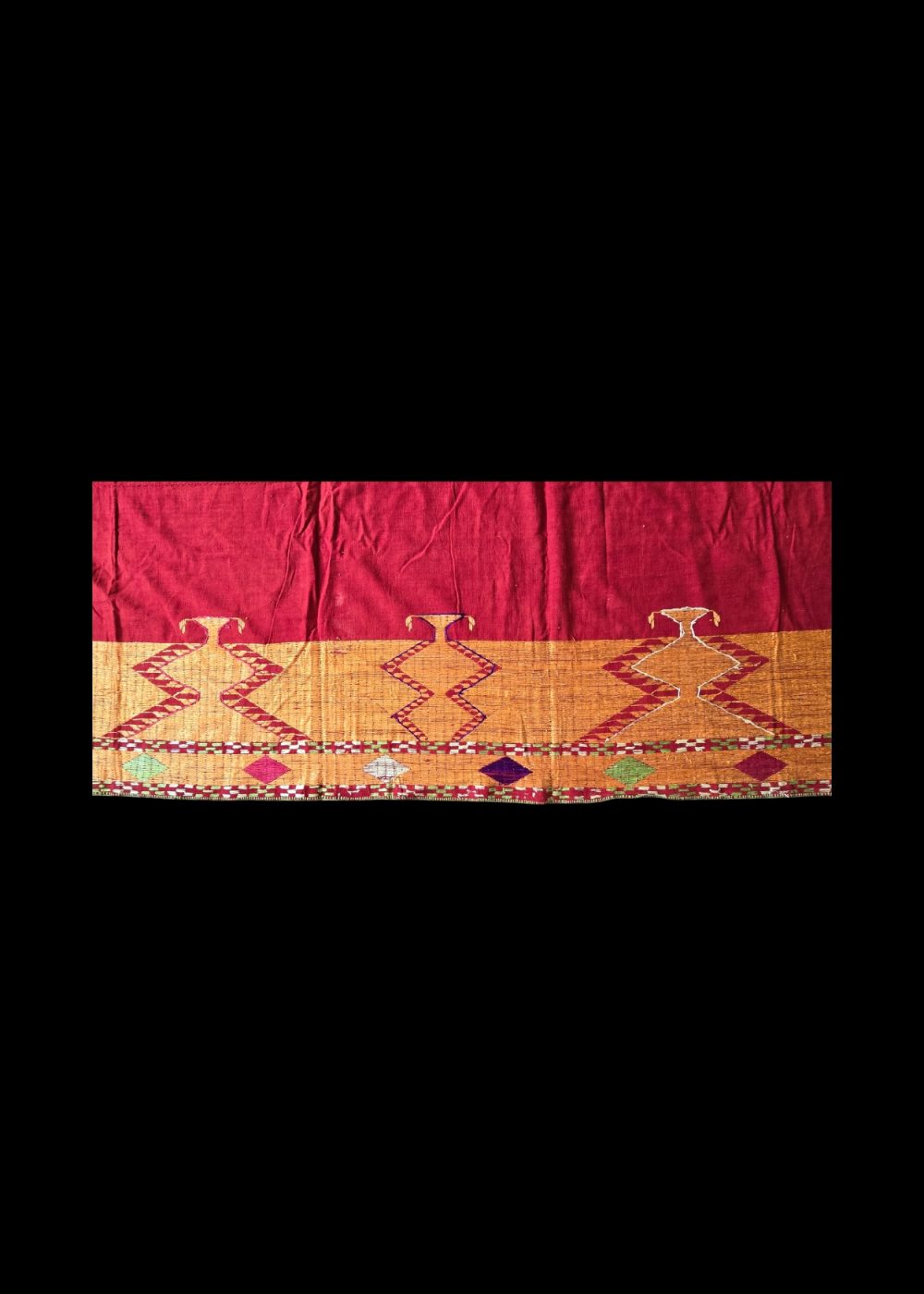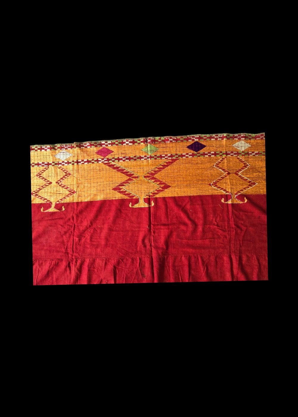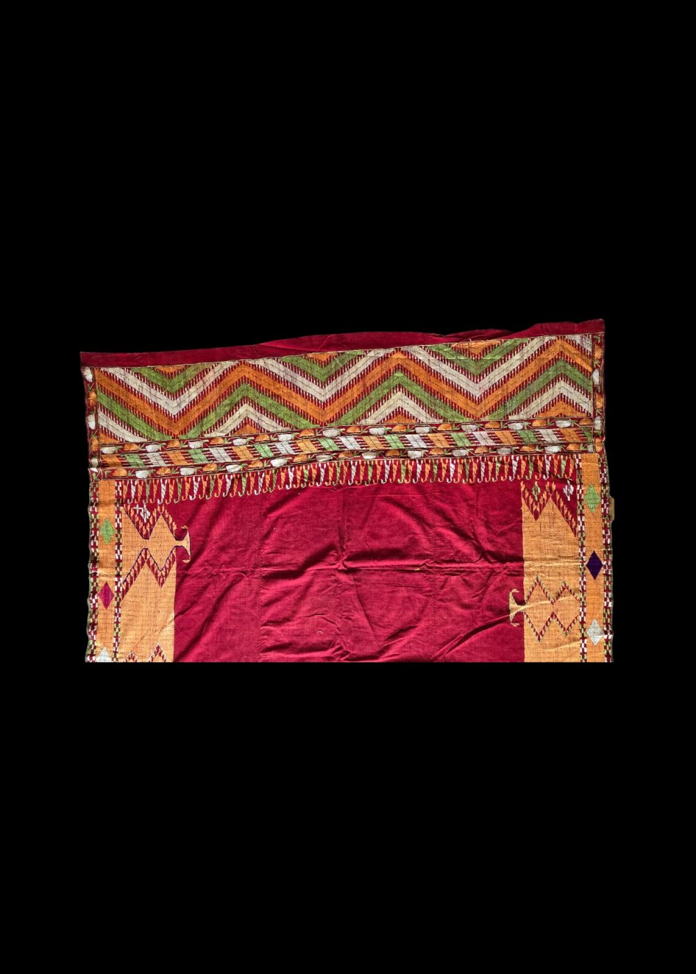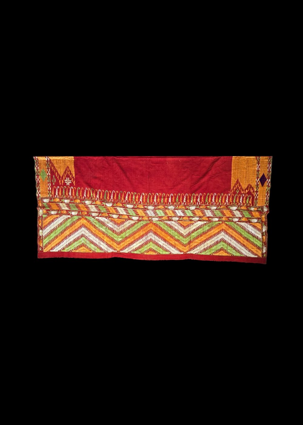 This vibrant textile showcases the traditional Bagh style of Phulkari embroidery, meticulously hand-stitched on coarse khaddar fabric. Dominated by a rich red field, the piece is framed by geometric borders in yellow, green, white, and purple threads, forming symmetrical zigzag and diamond motifs. The dense embroidery, covering nearly the entire surface, reflects the ceremonial grandeur and cultural heritage of Punjab, where such textiles were often gifted during weddings and festive occasions.