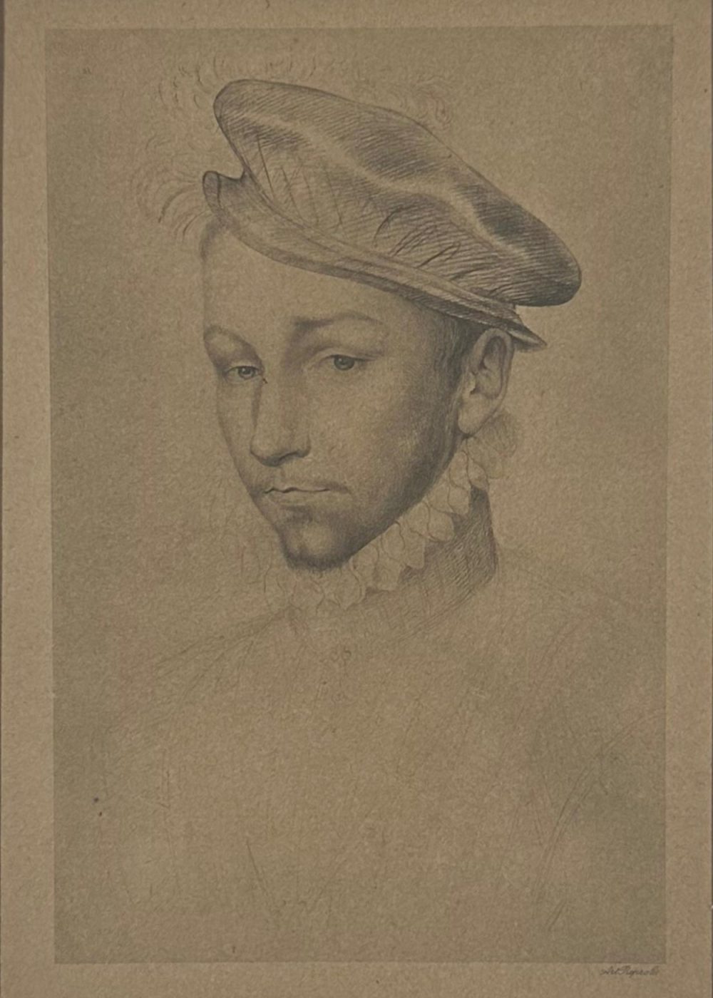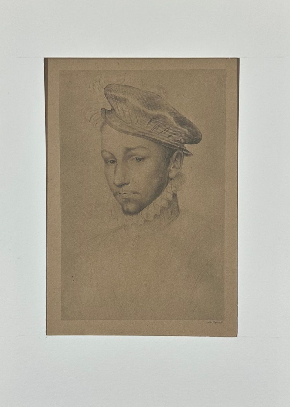 This finely executed drawing presents a youthful courtier dressed in Renaissance attire, distinguished by a soft beret-style cap and a delicate ruffled collar. Rendered in subtle graphite or chalk on toned paper, the portrait captures a thoughtful, slightly melancholic expression. The shading skillfully brings out the subject’s delicate features and period fashion. Likely created in the 19th century as a reproduction or study after a 16th-century original, the piece reflects the elegance and refinement associated with aristocratic portraiture of the time.