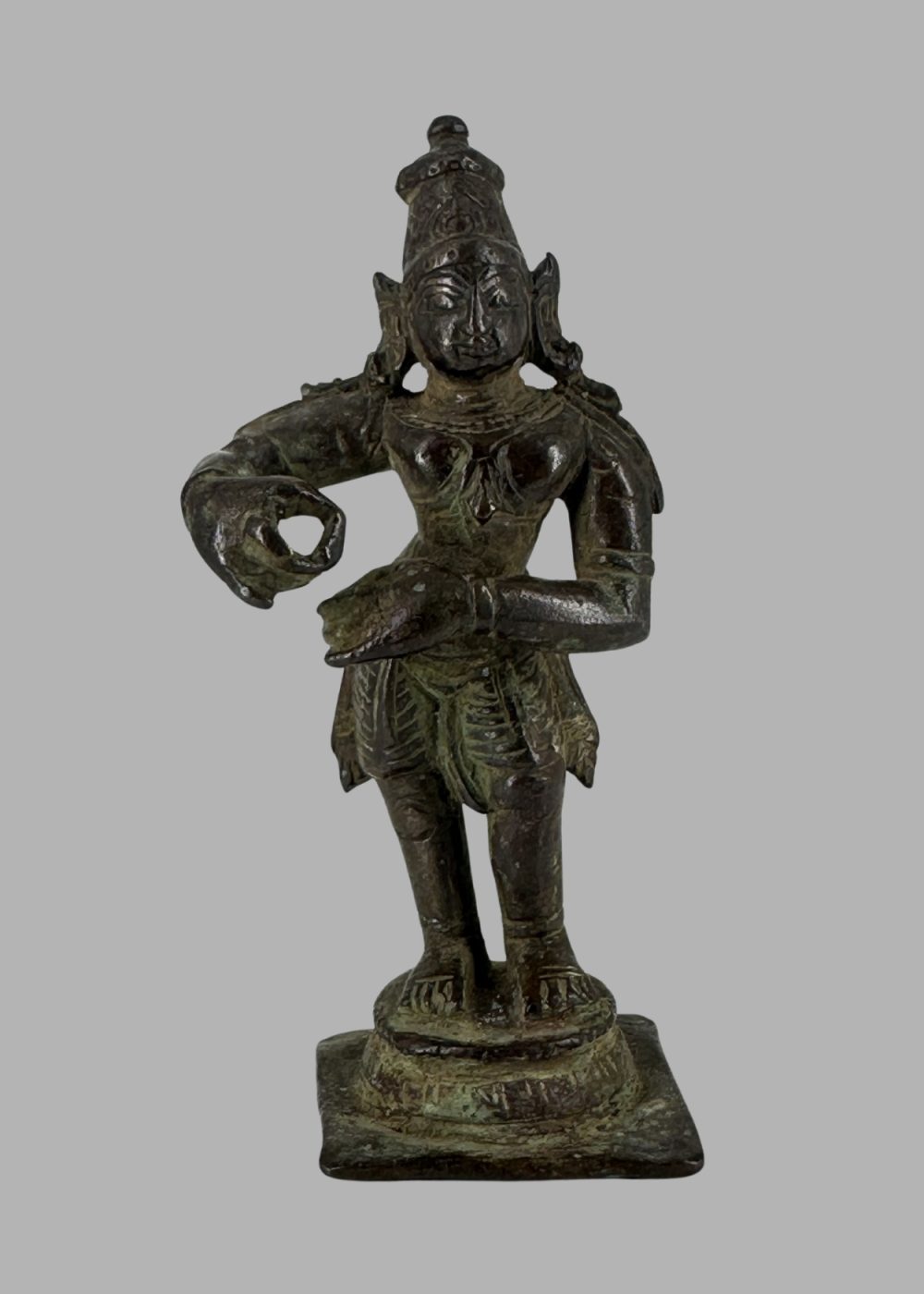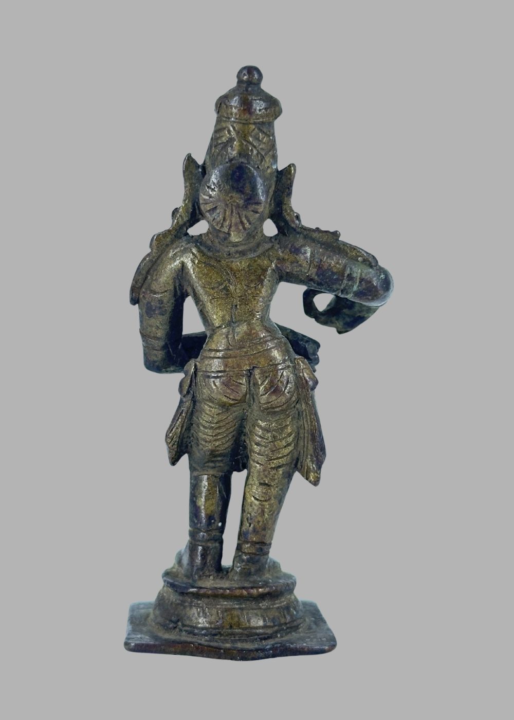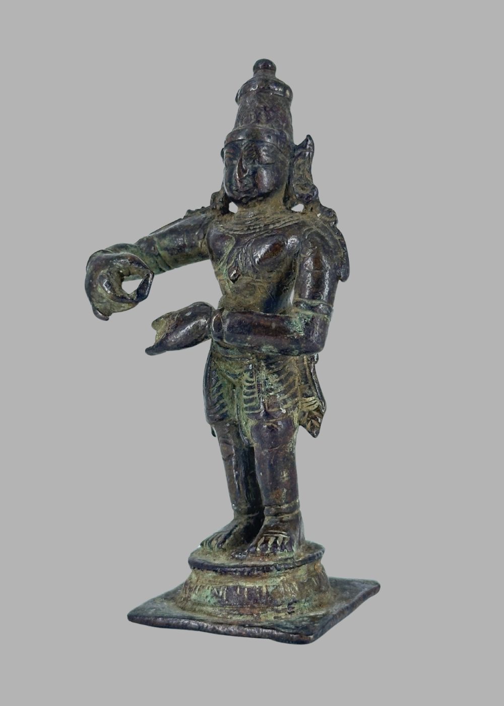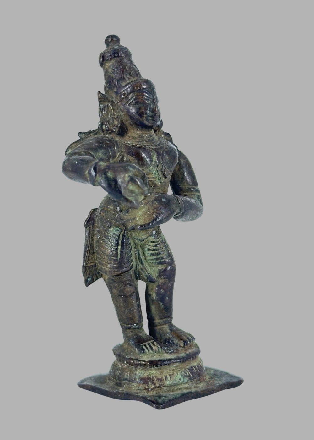 This graceful bronze figure of Krishna exemplifies the devotional sculpture of early modern South India. Depicted in his iconic posture, the deity stands with one leg crossed in playful ease, suggestive of his role as divine cowherd and enchanter. His uplifted hand likely once held a flute, evoking Venugopala, the beloved pastoral form. Adorned with a tall crown, sacred thread, and layered ornaments, the figure resonates with lyrical movement and tender expression—hallmarks of temple bronzes crafted for ritual veneration.